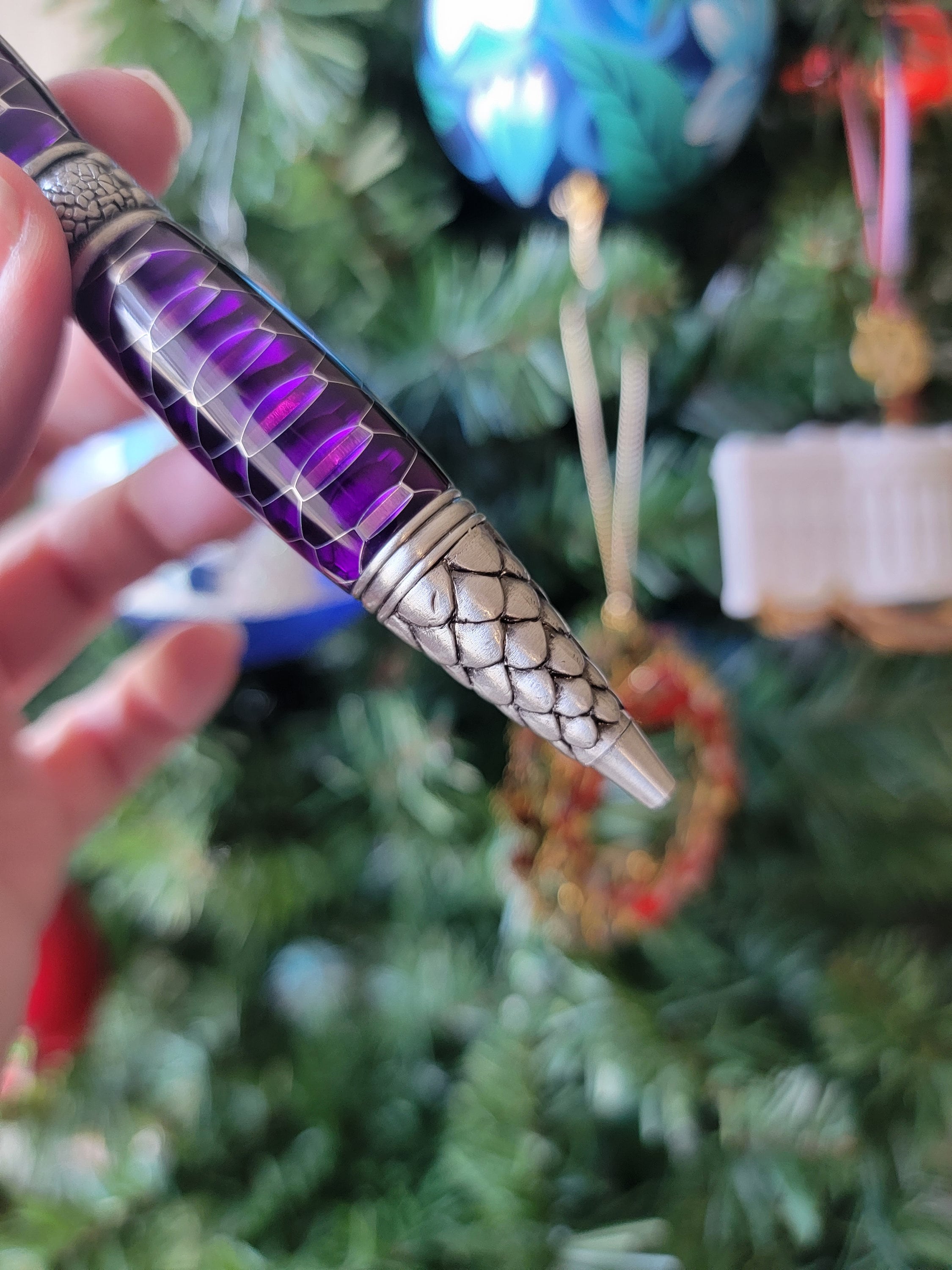 This dragon twist pen was handturned in our Metro Detroit workshop using a purple jewel acrylic in a perfect dragon scale mesh of aluminum. The antique pewter hardware really makes this pen a one of a kind conversation piece.