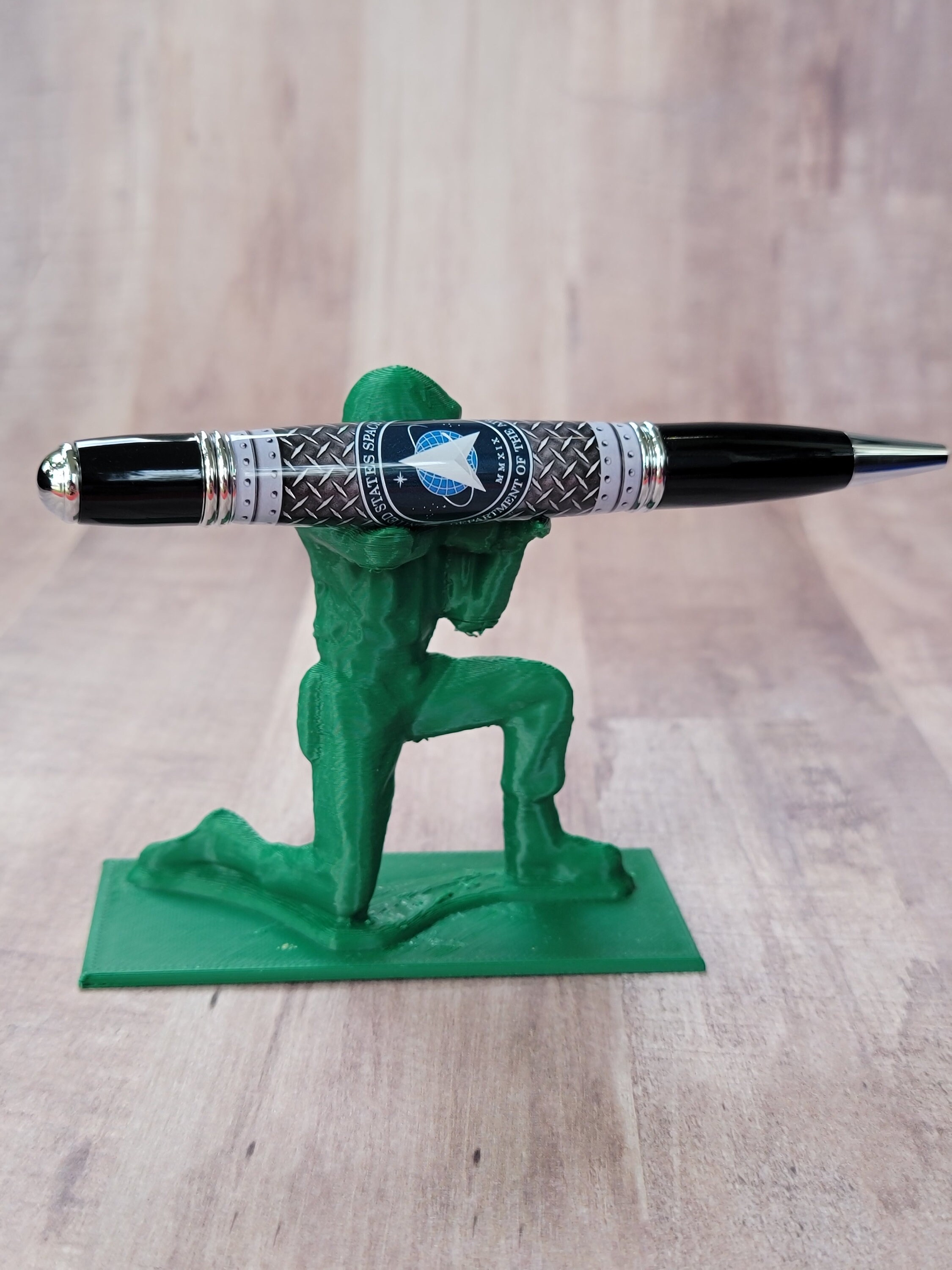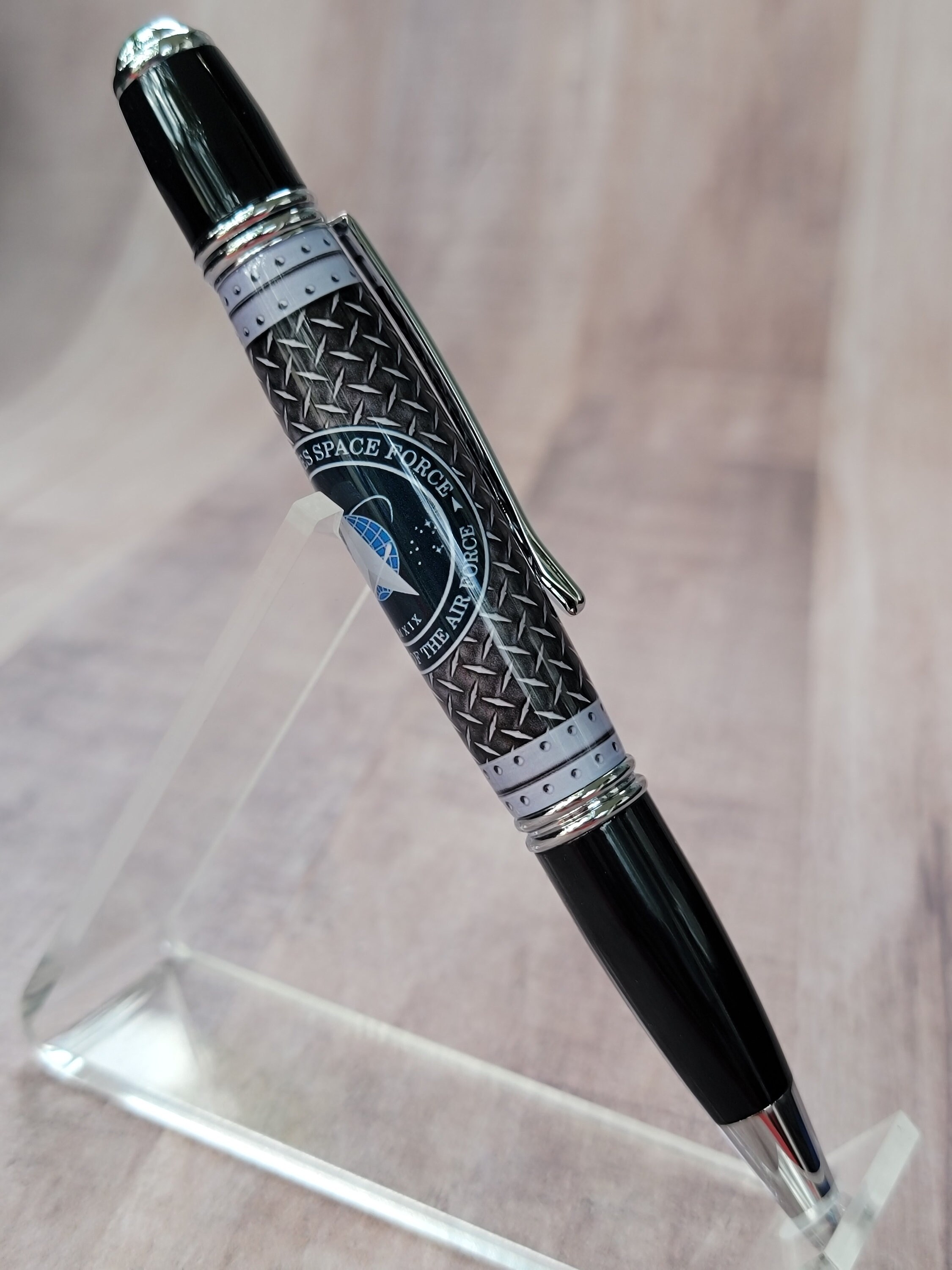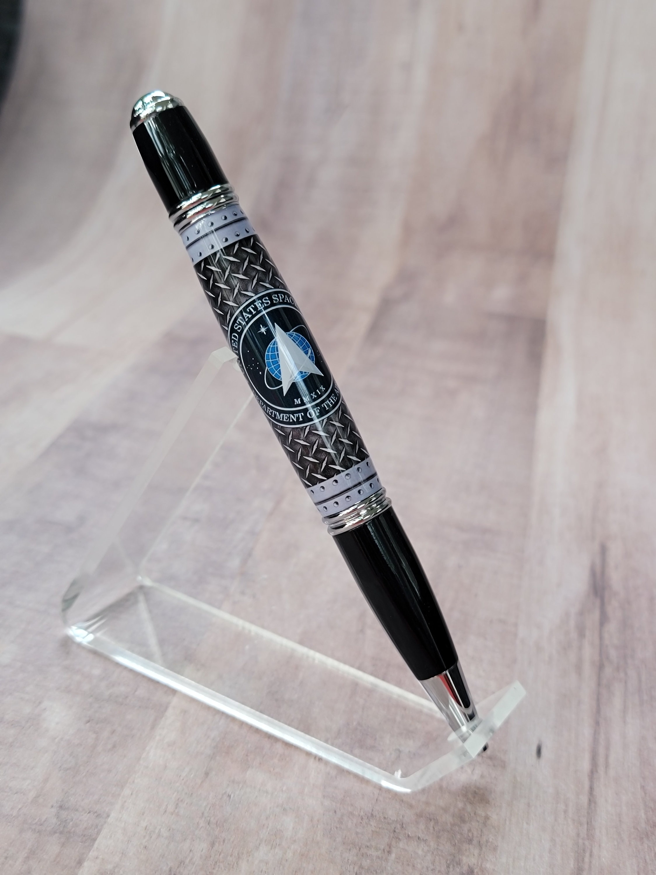 Welcome to the Military pen series. Here we have the Space Force refillable ballpoint pen, handmade in our Metro Detroit family workshop. This pen features a smooth twist mechanism, and chrome & black hardware. The Space Force emblem is hand cast in acrylic by nearby artist Michelle Bagley, and then drilled, hand turned, sanded and polished to a perfect shine here in our workshop.