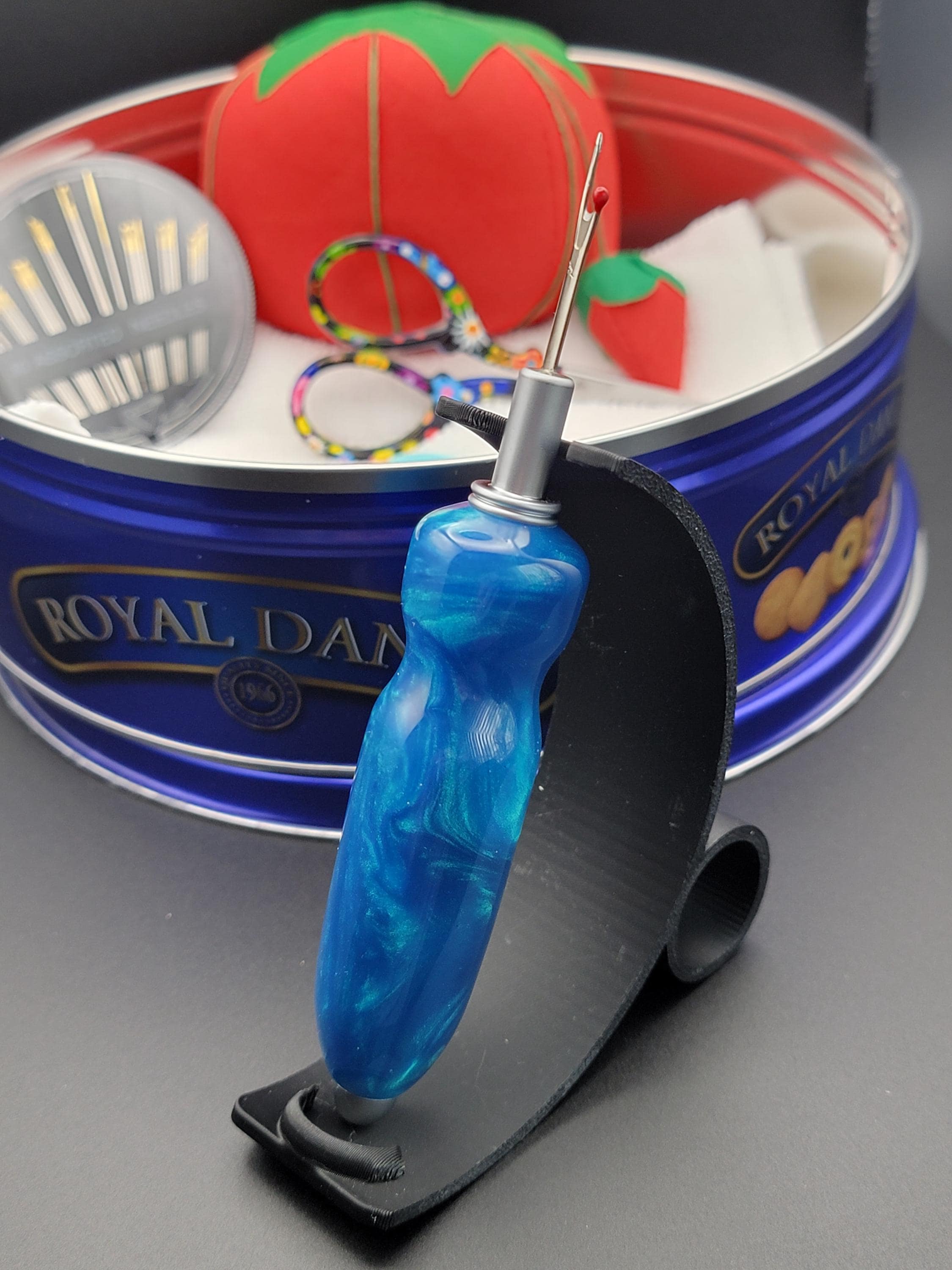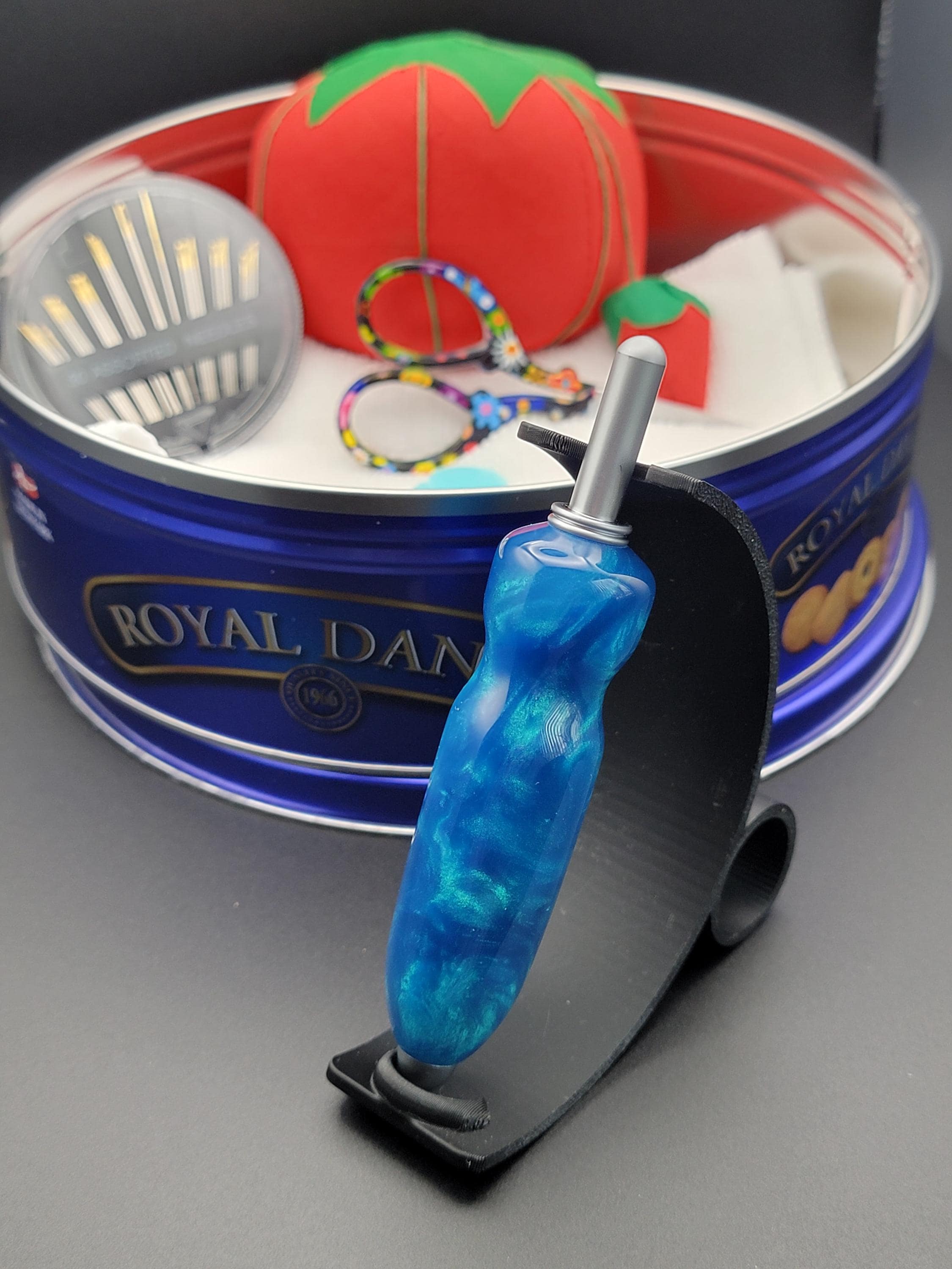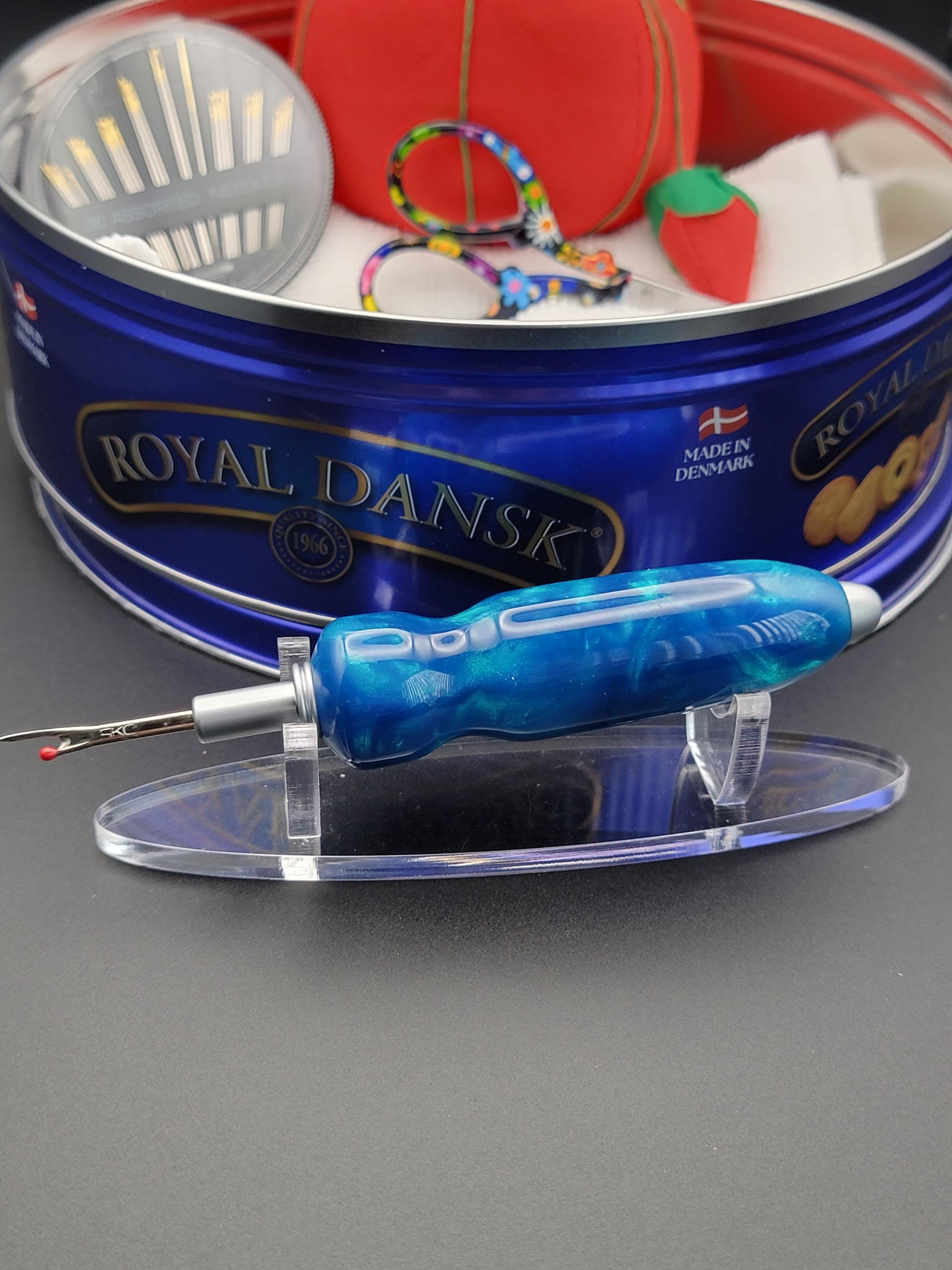 This ergonomic seam ripper was hand turned in our Metro Detroit workshop from a swirly blue acrylic.