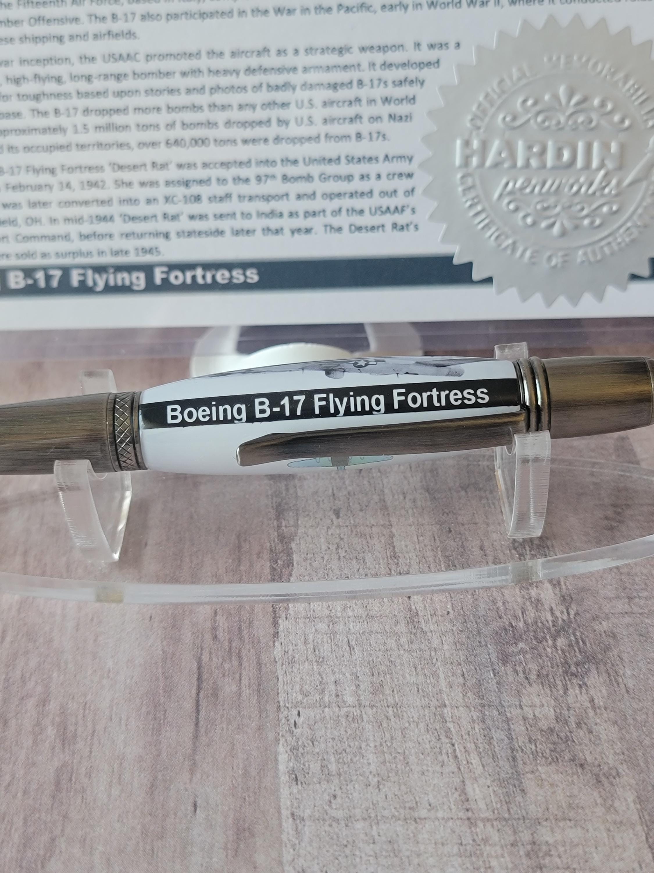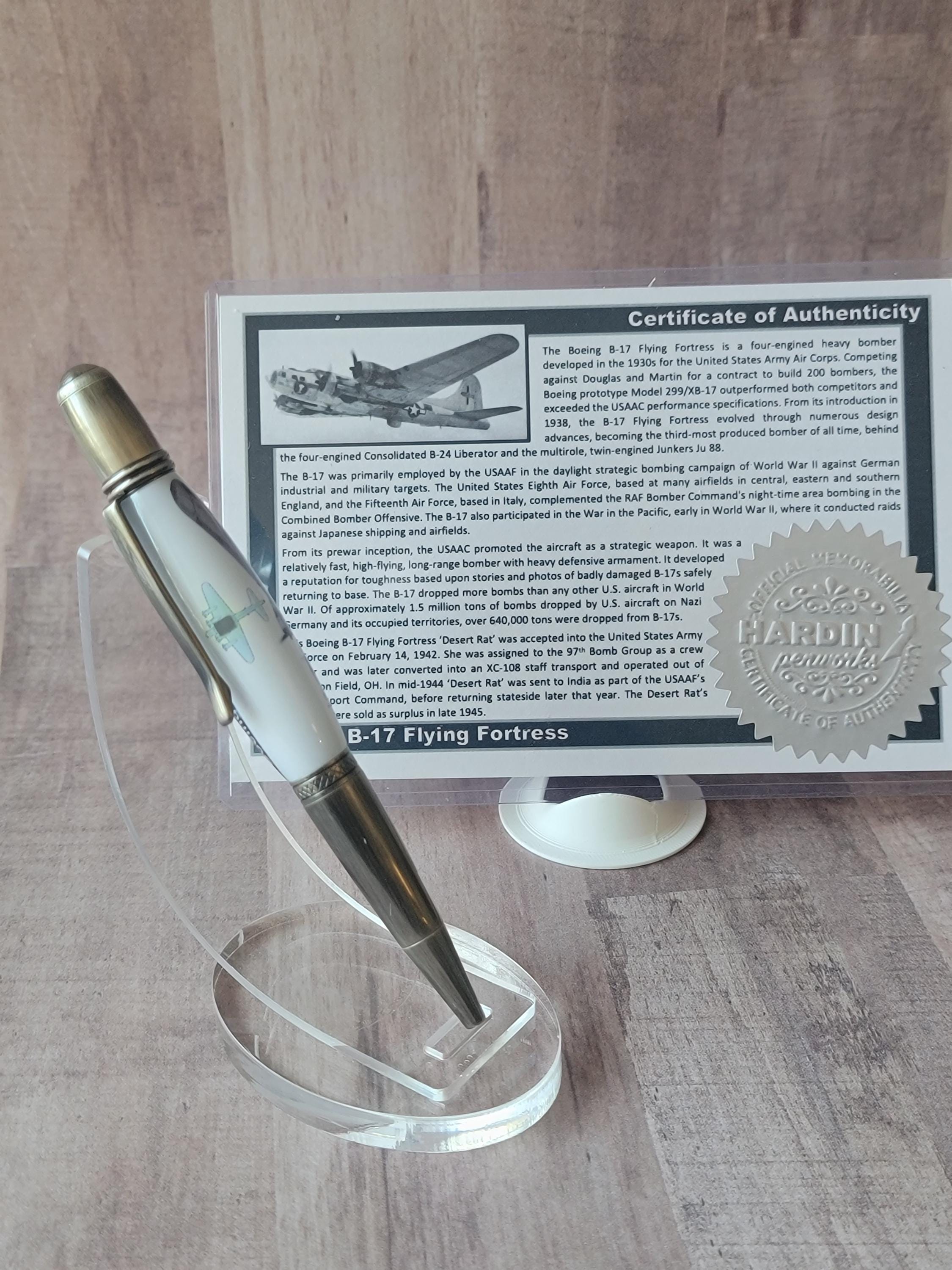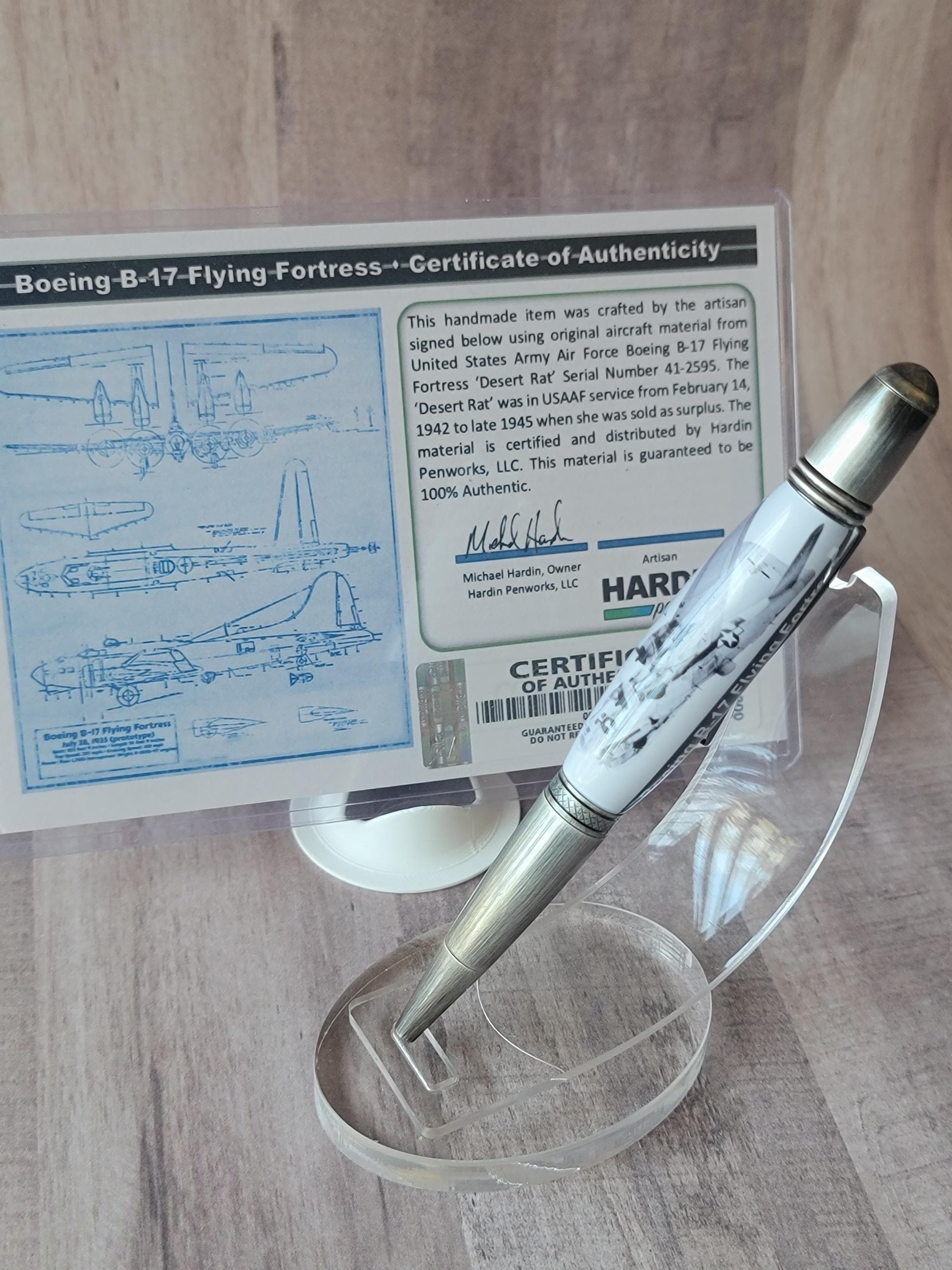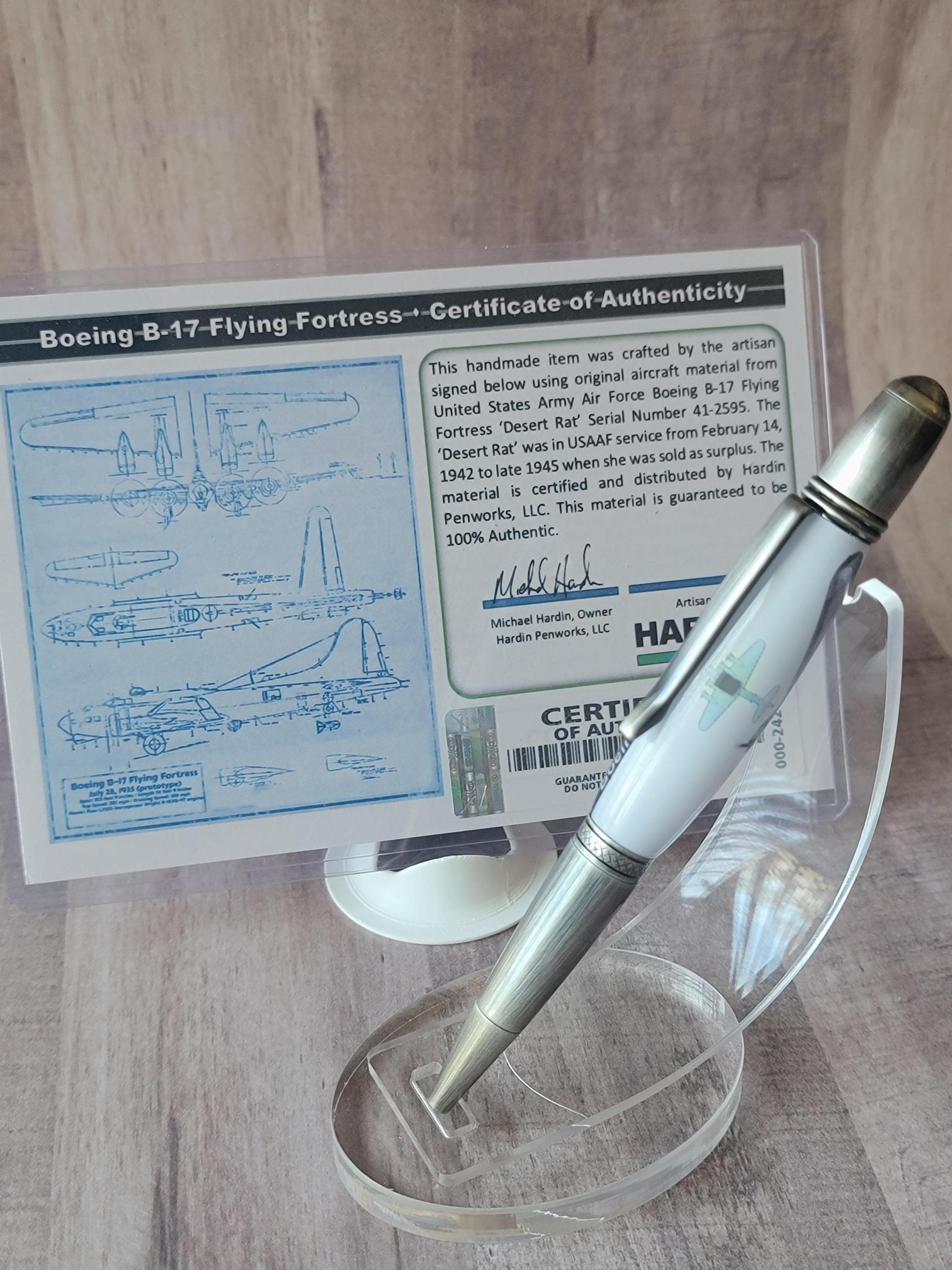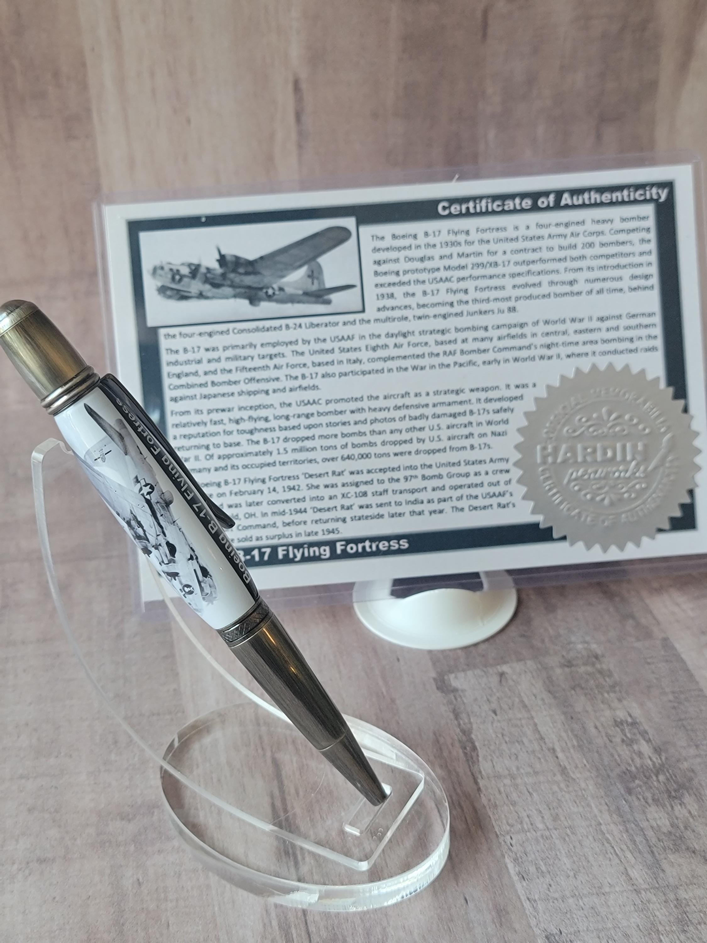 This hand turned pen is made from acrylic that contains a small piece of aircraft material from a B-17 Flying Fortress that was in service from 1942-1944. It will come with a certificate of authenticity that details the story of the material.