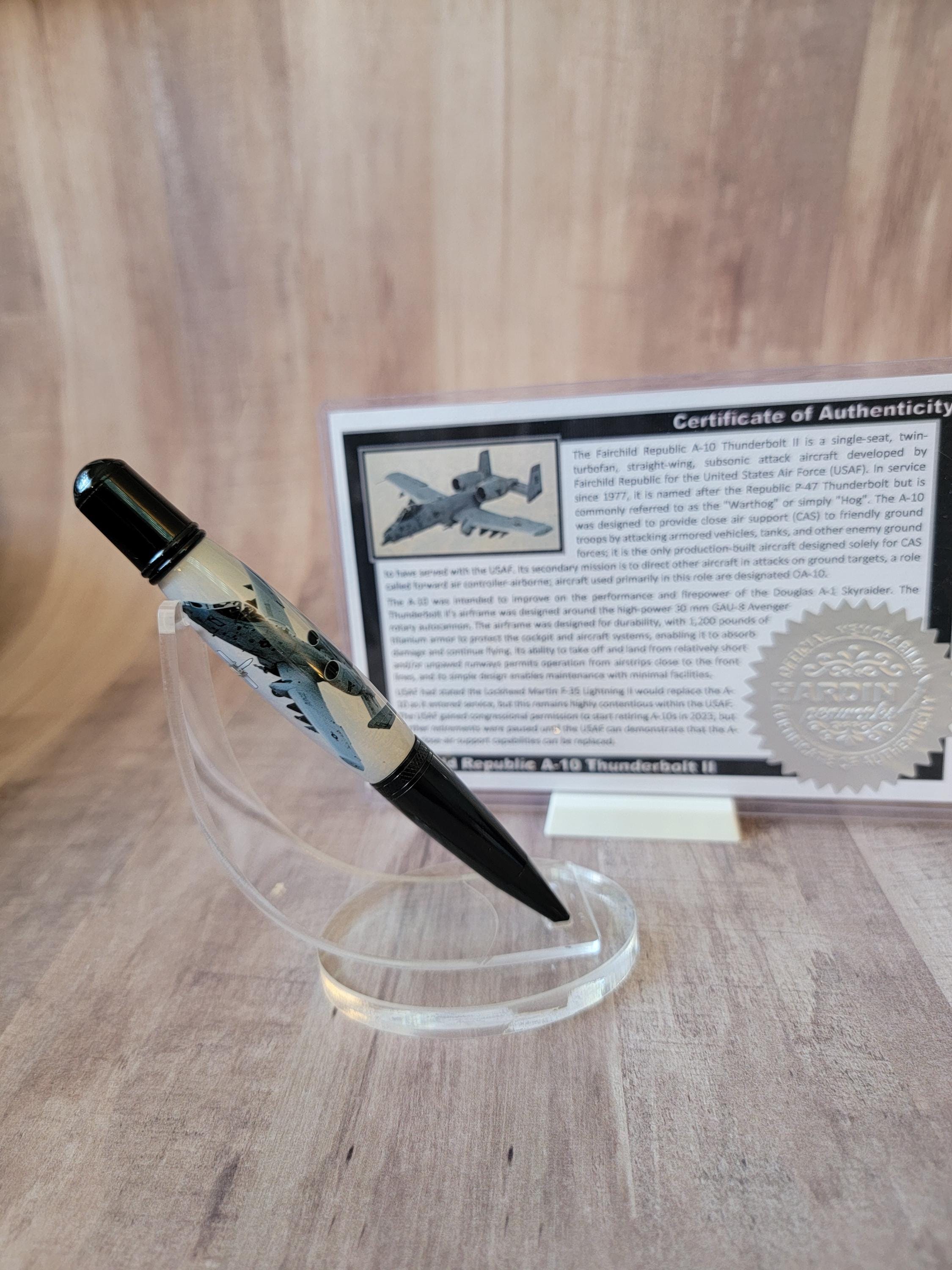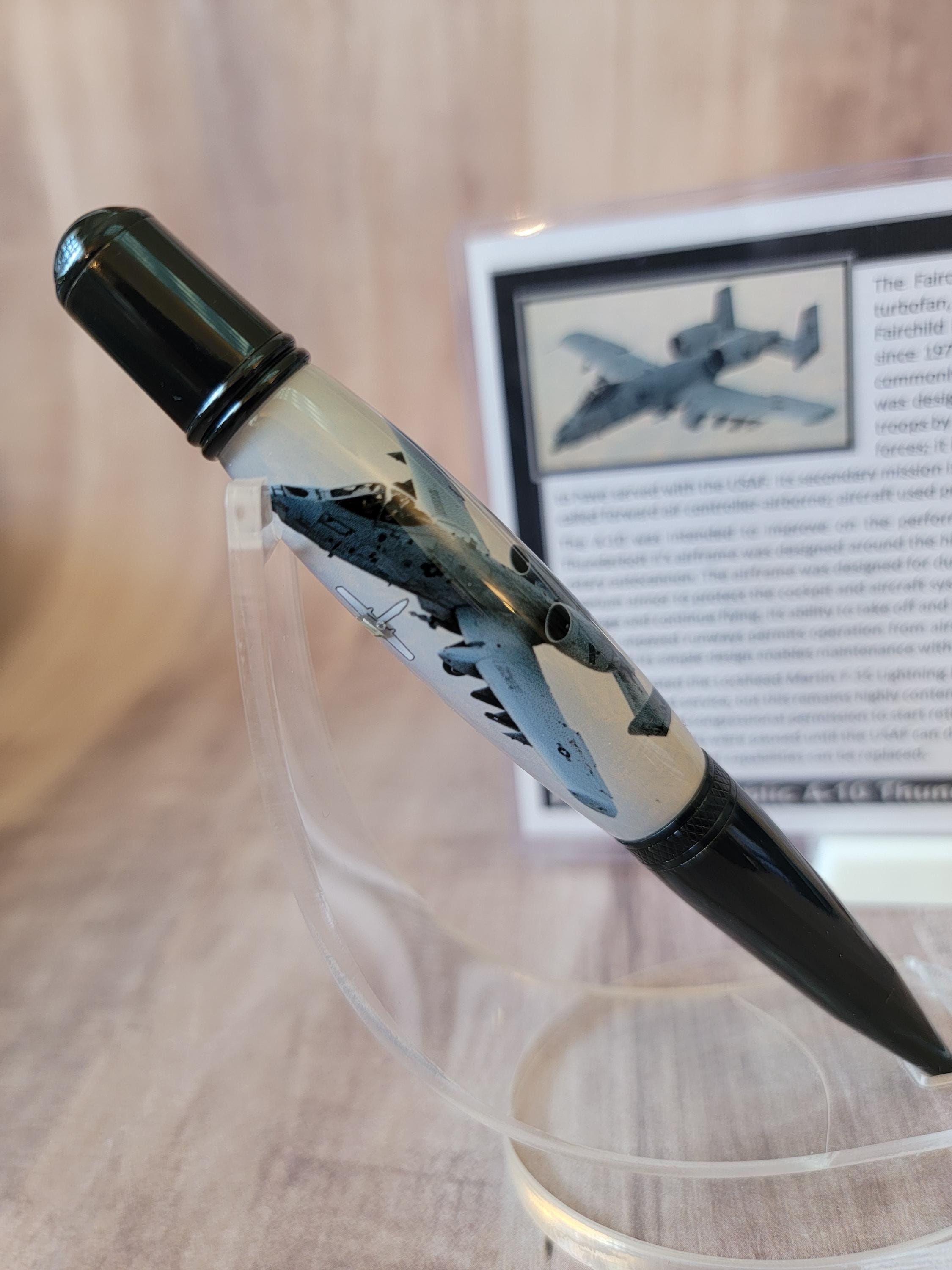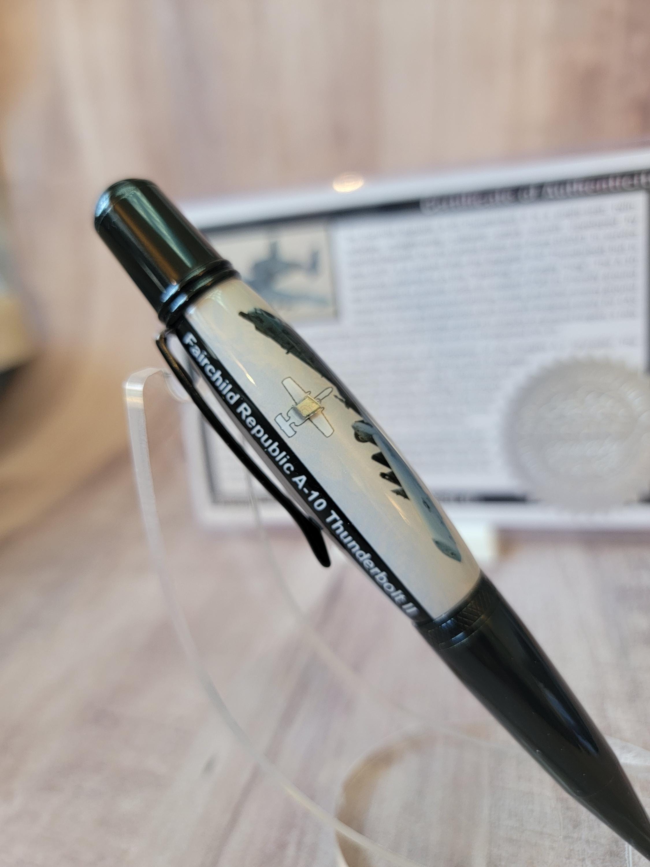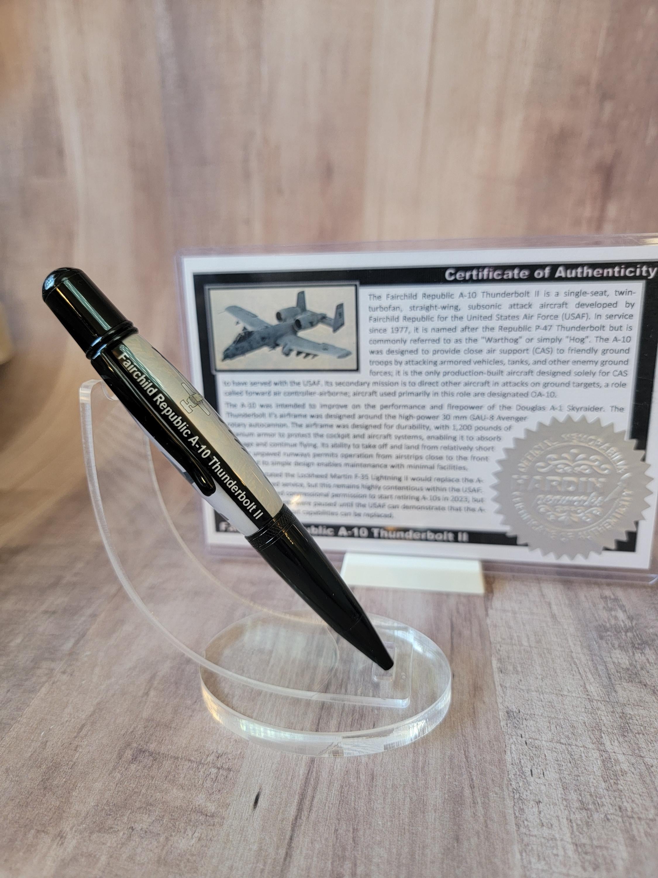 This hand turned pen is made from acrylic that contains a small piece of aircraft material from an A-10 Thunderbolt II. It will come with a certificate of authenticity that details the story of the material.