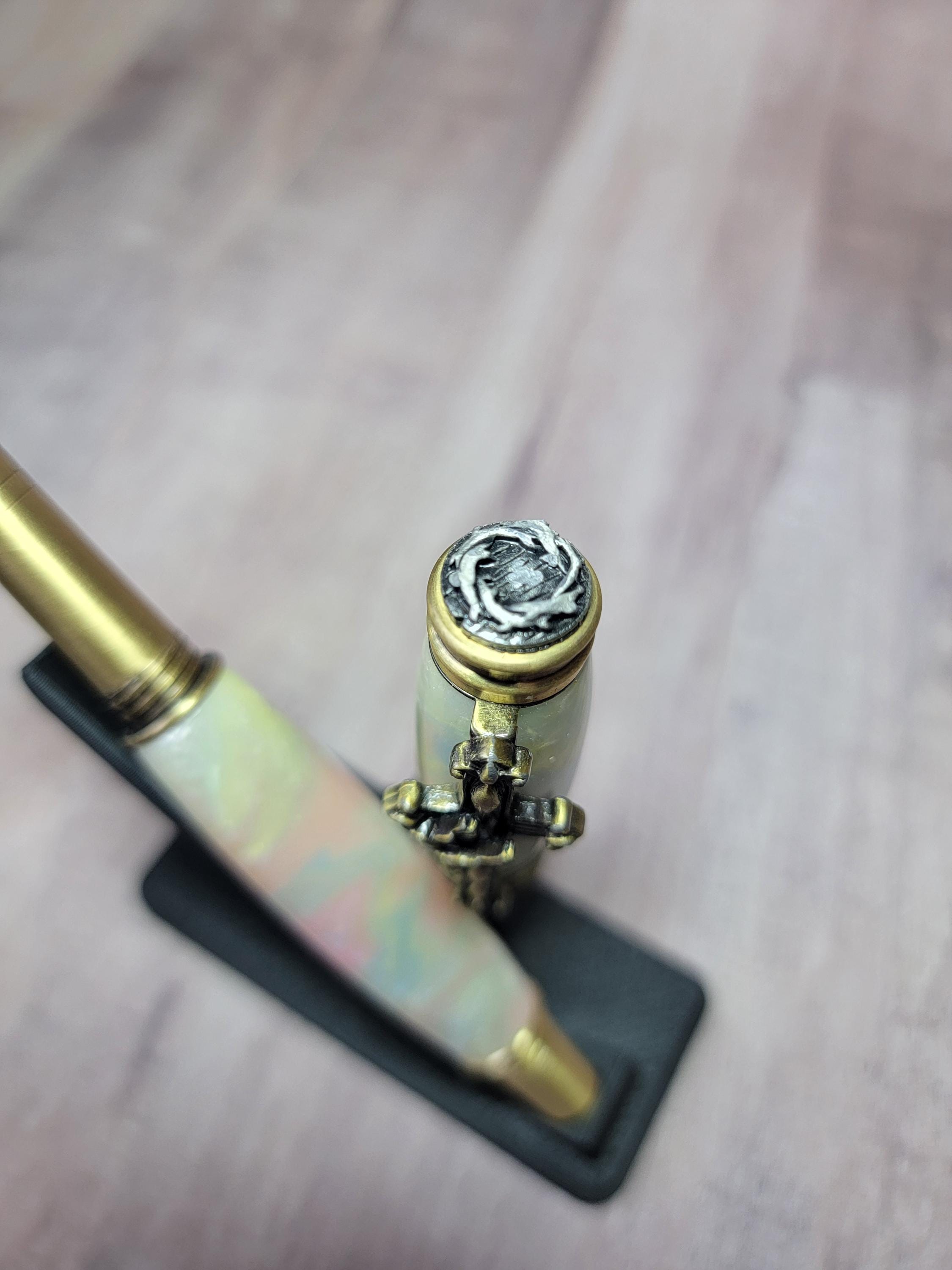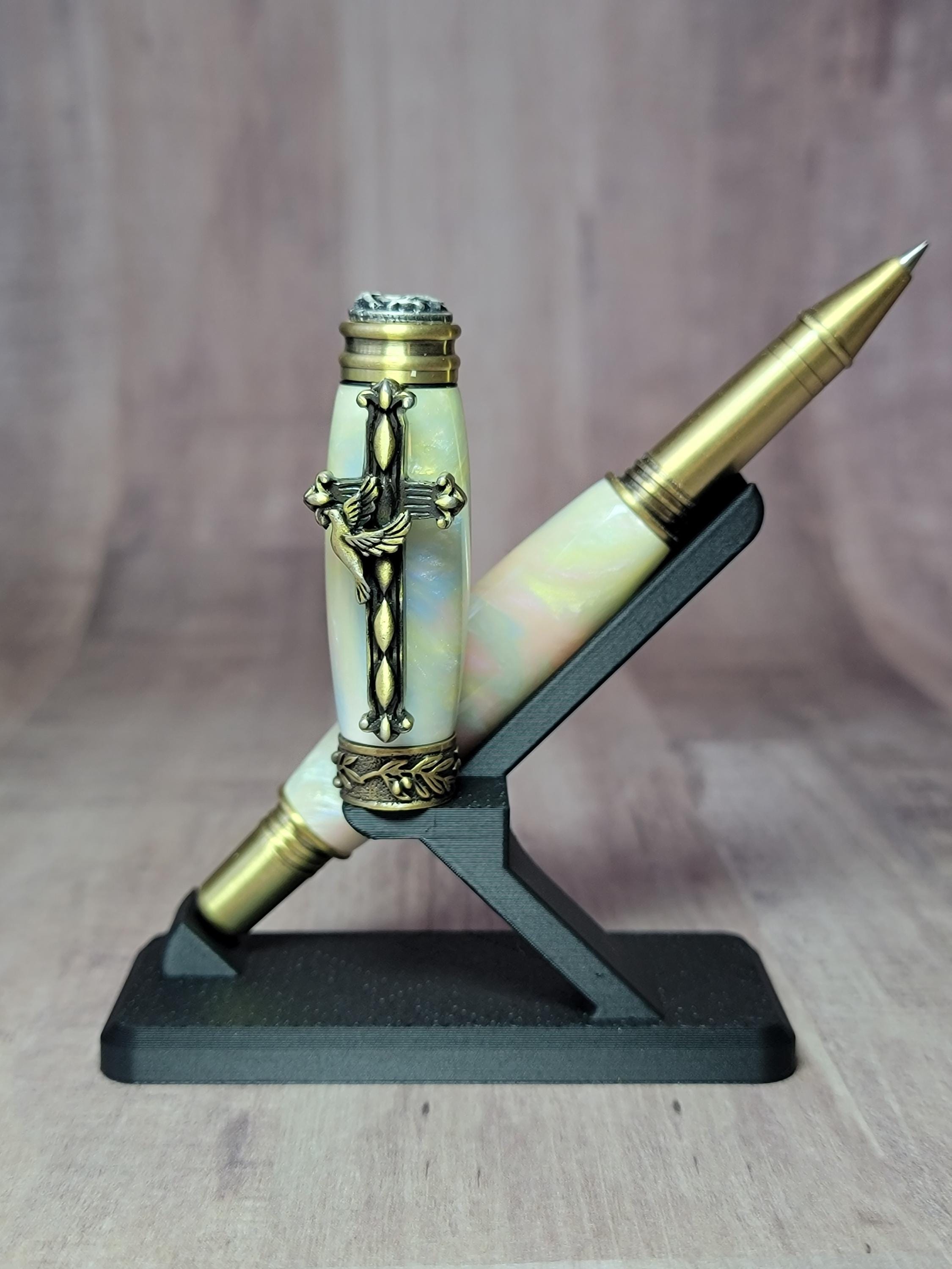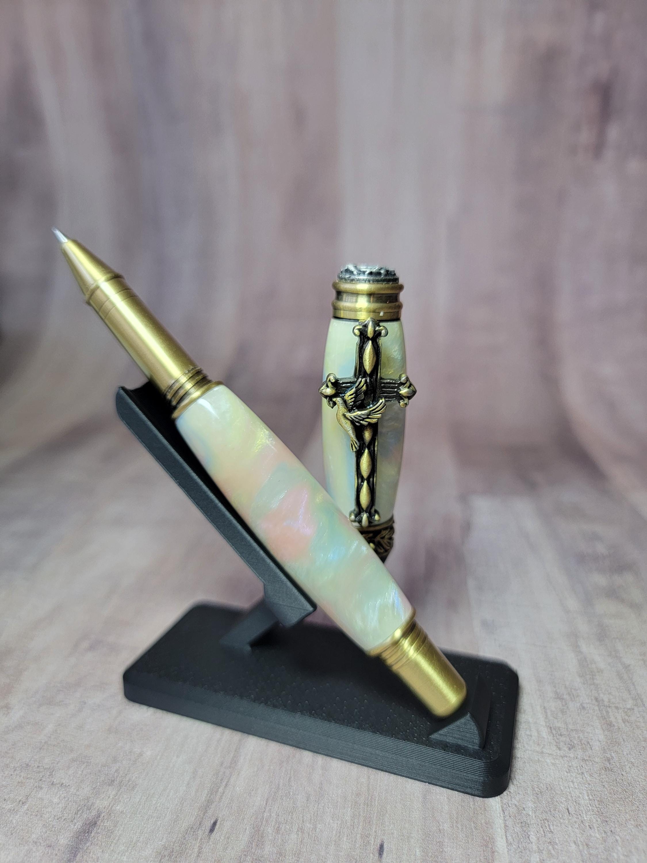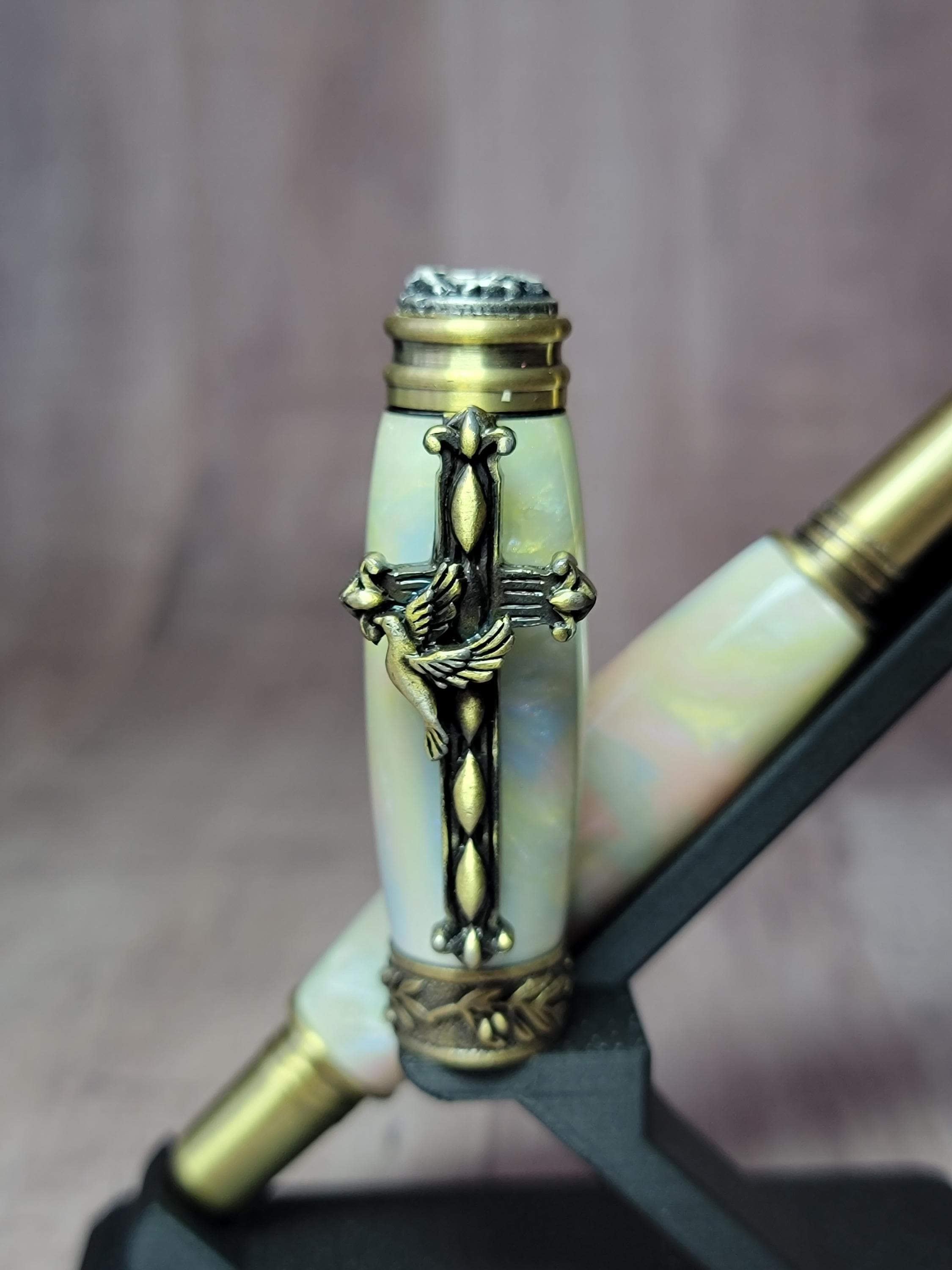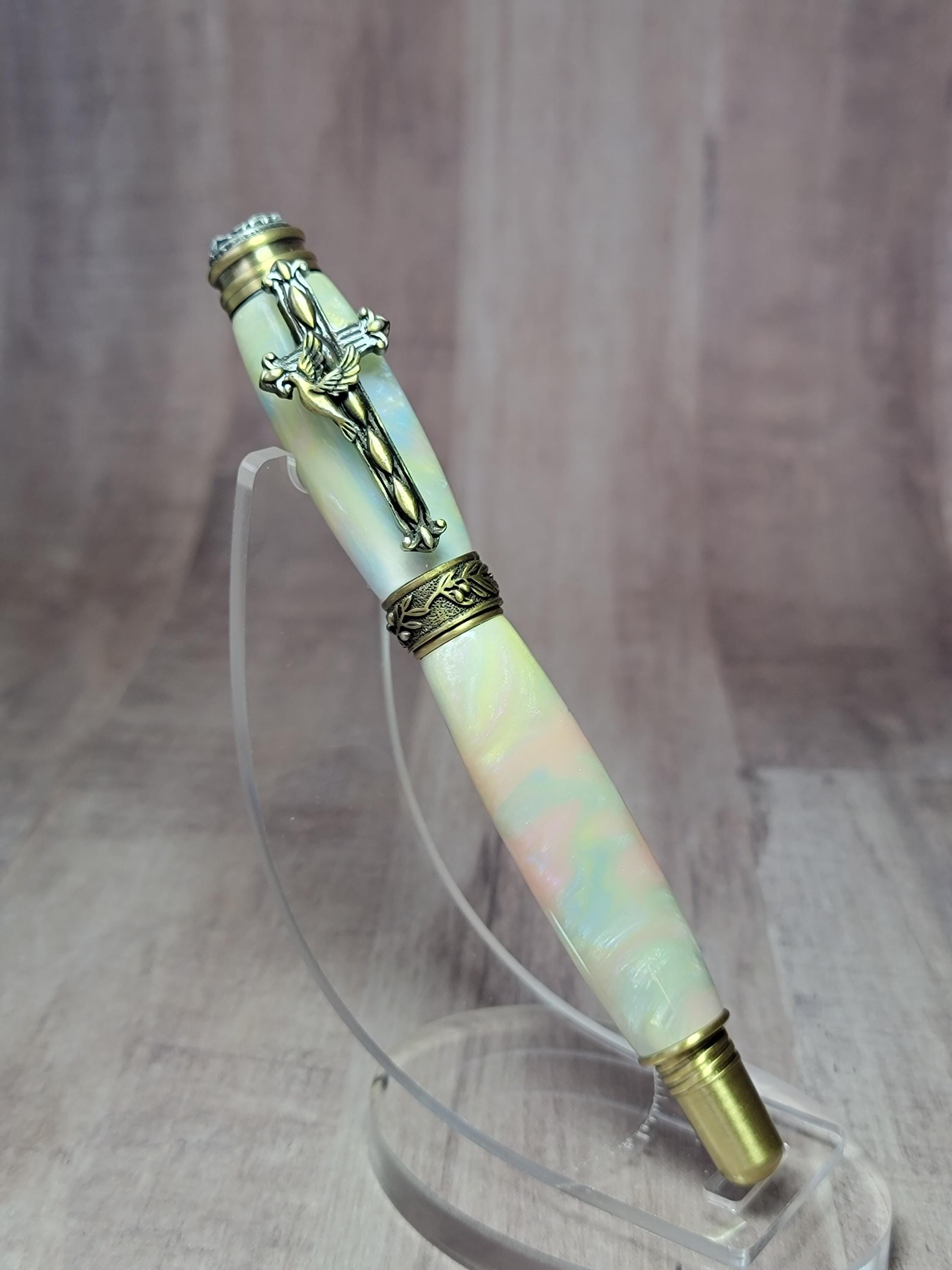 It is adorned with religious icons including a dove, crown of thorns and an olive branch. We chose a beautiful acrylic for the body and cap.
