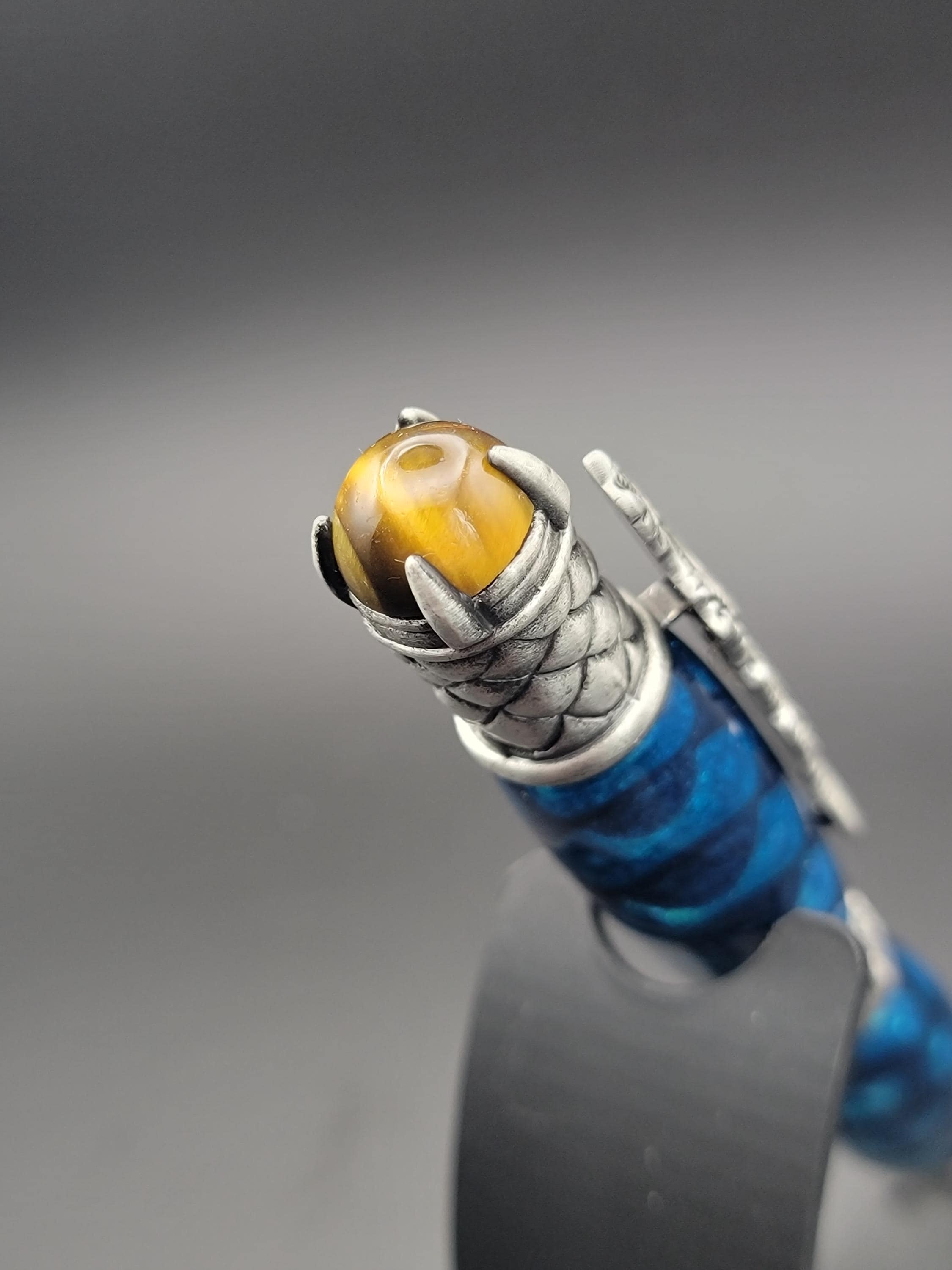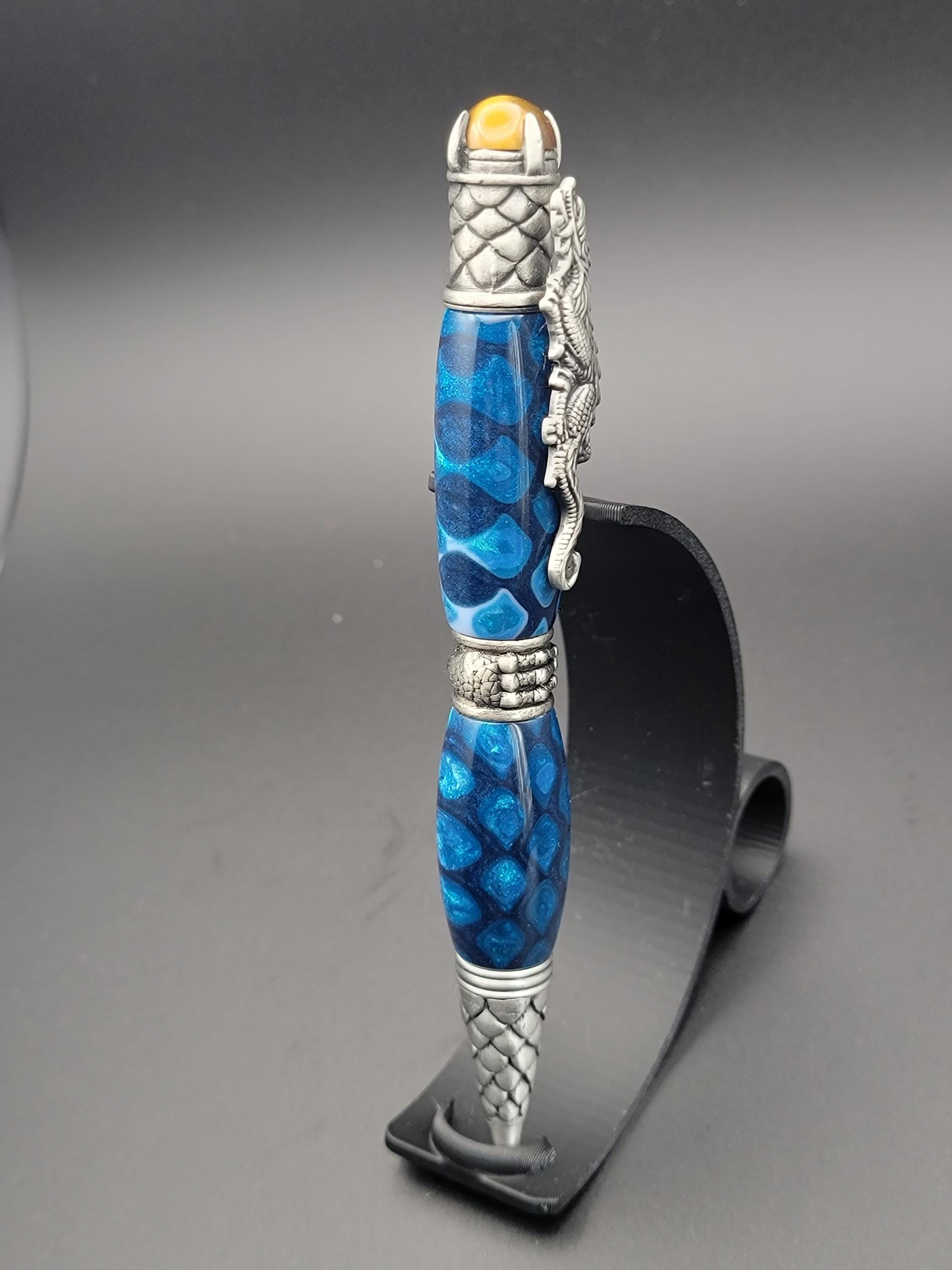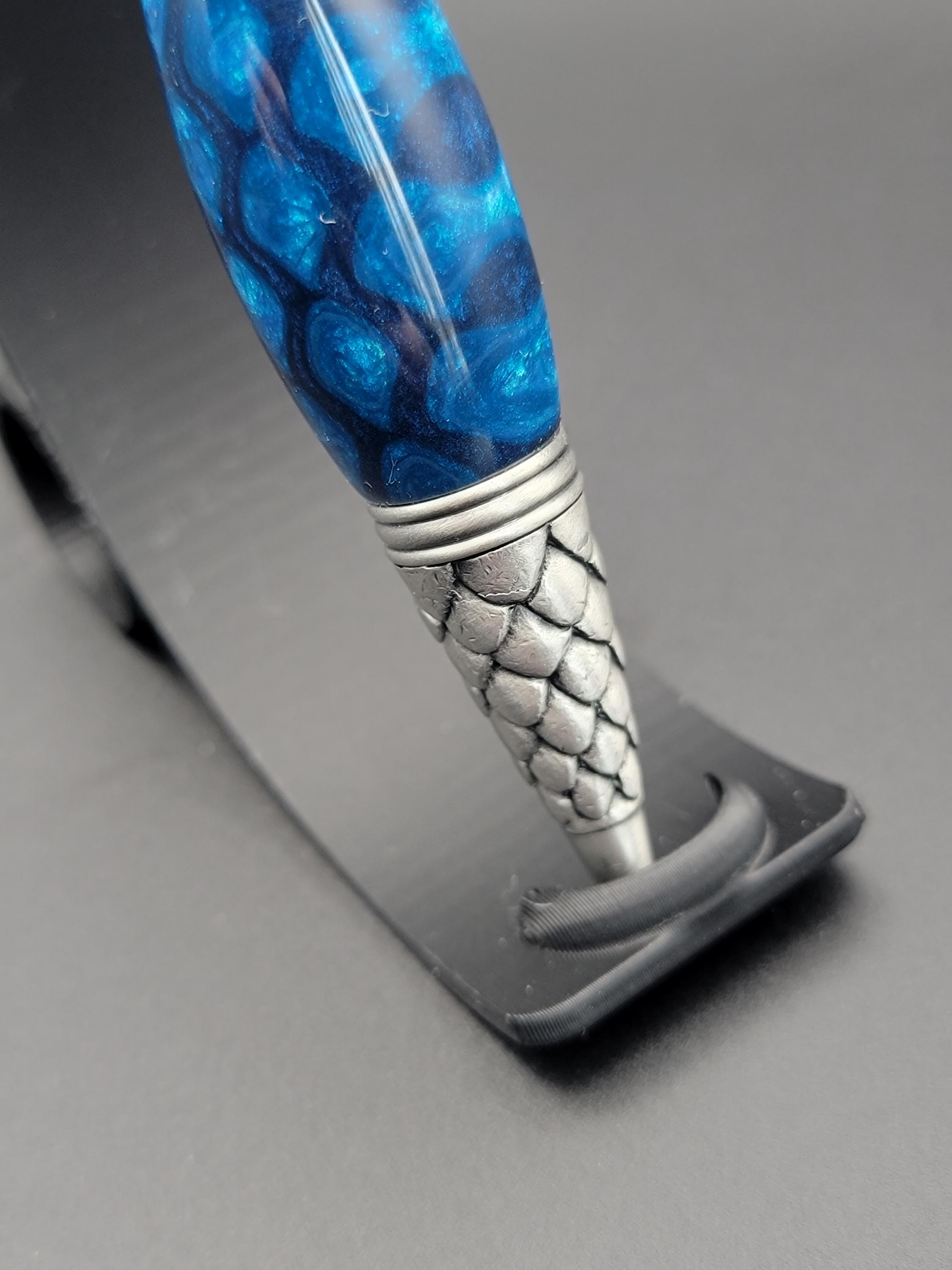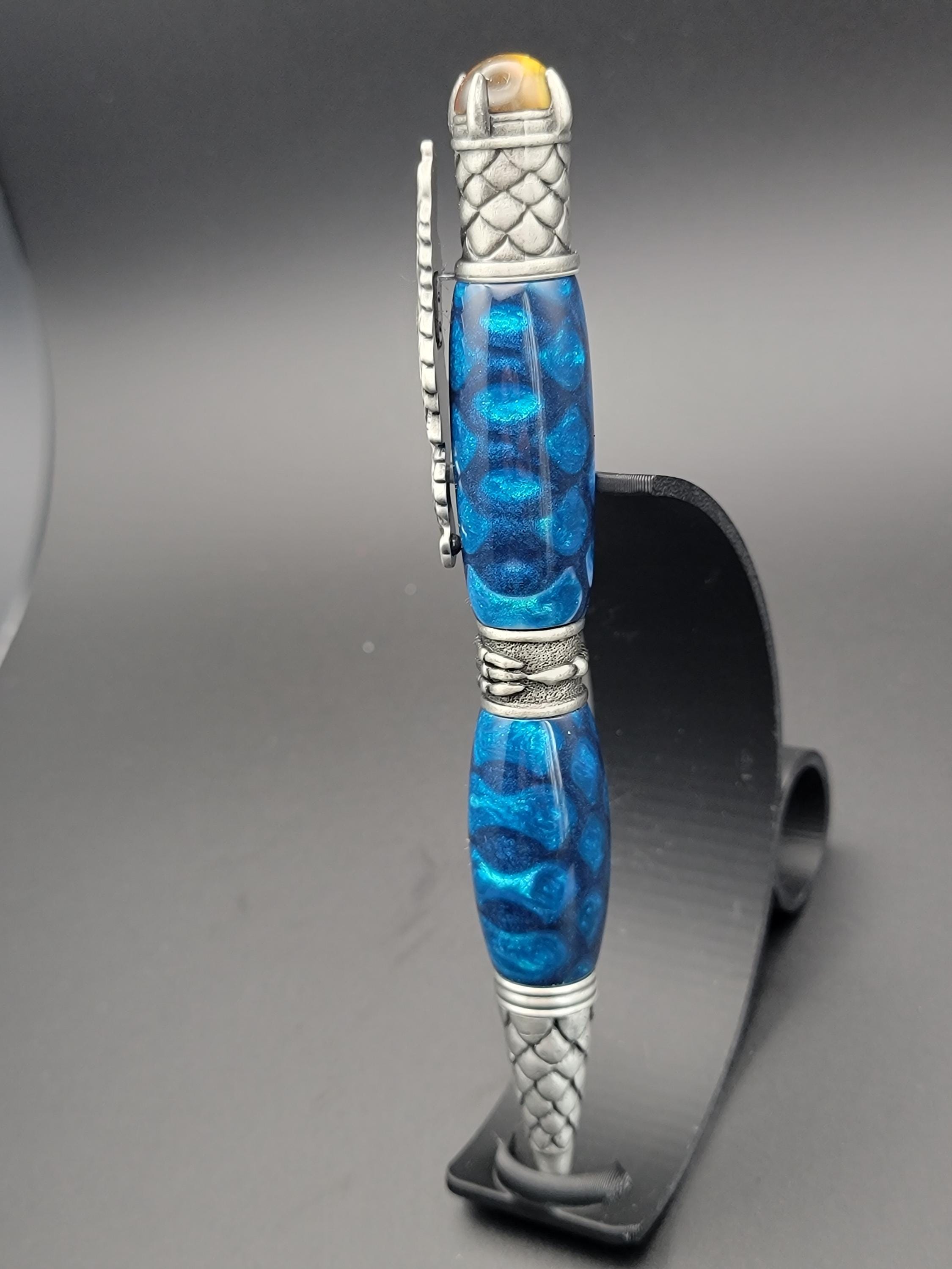 This dragon twist pen was handturned in our Metro Detroit workshop using a blue dragon scale acrylic. The antique pewter hardware really makes this pen a one of a kind conversation piece.