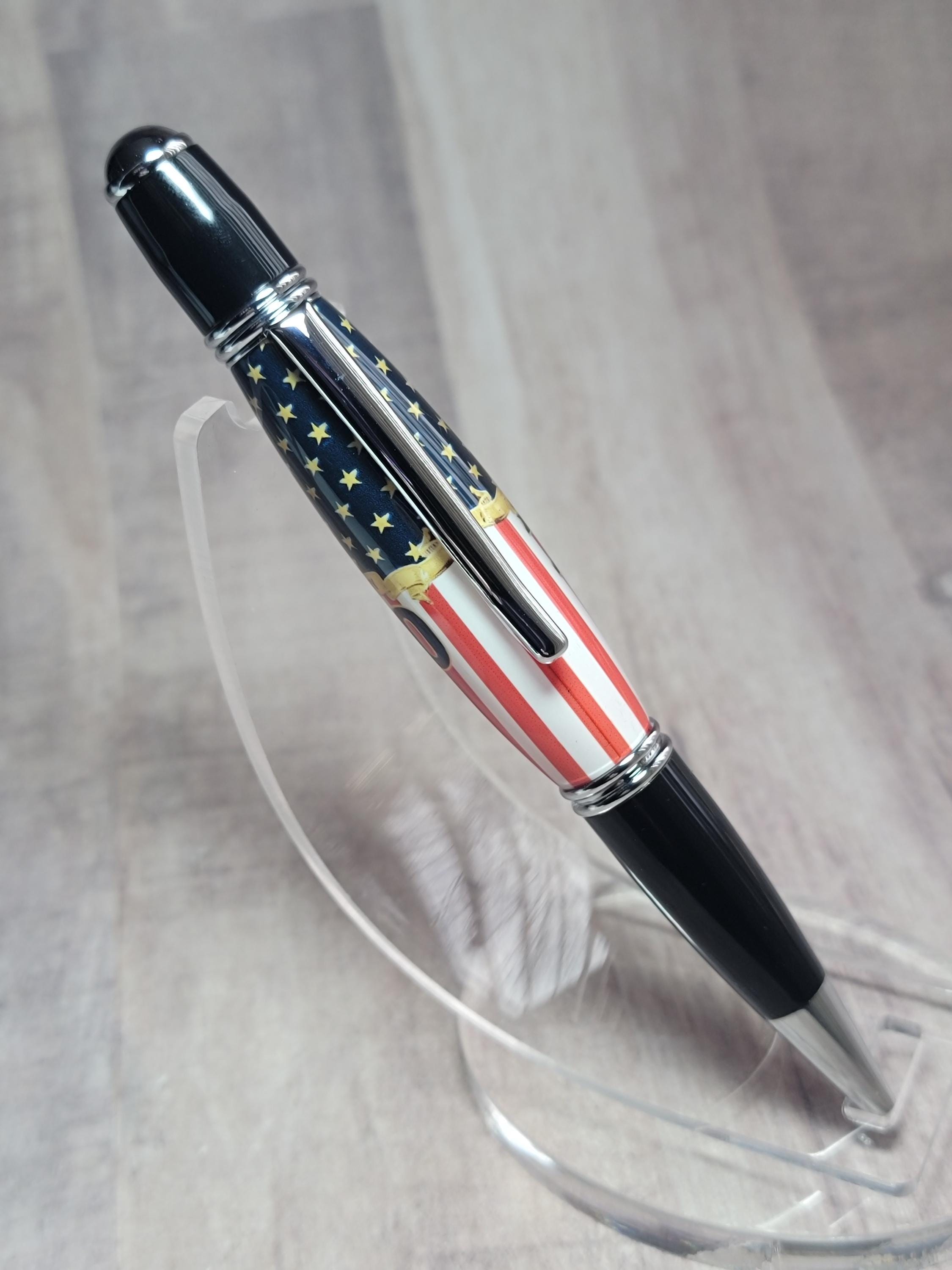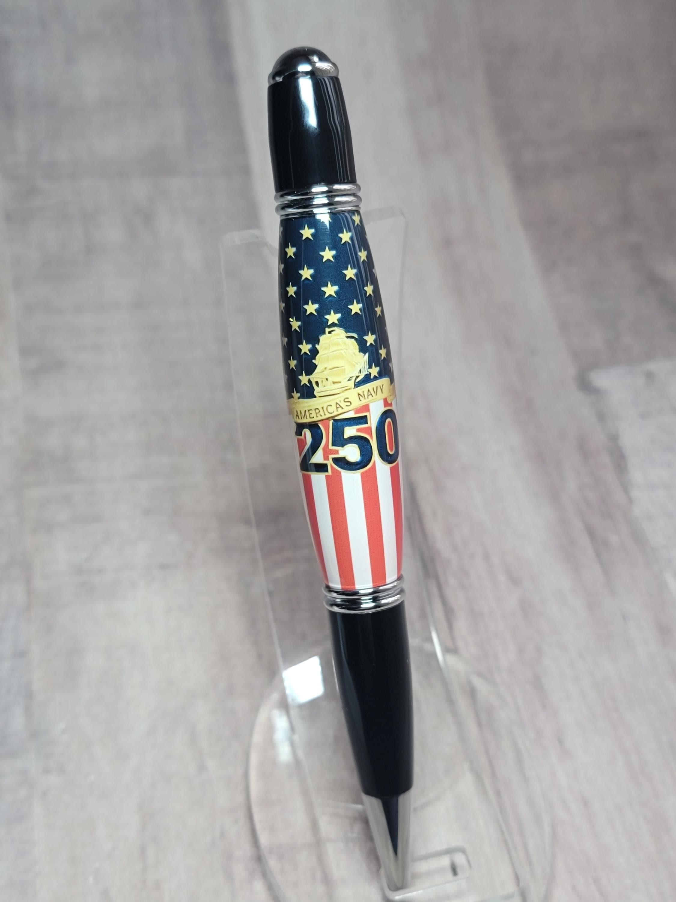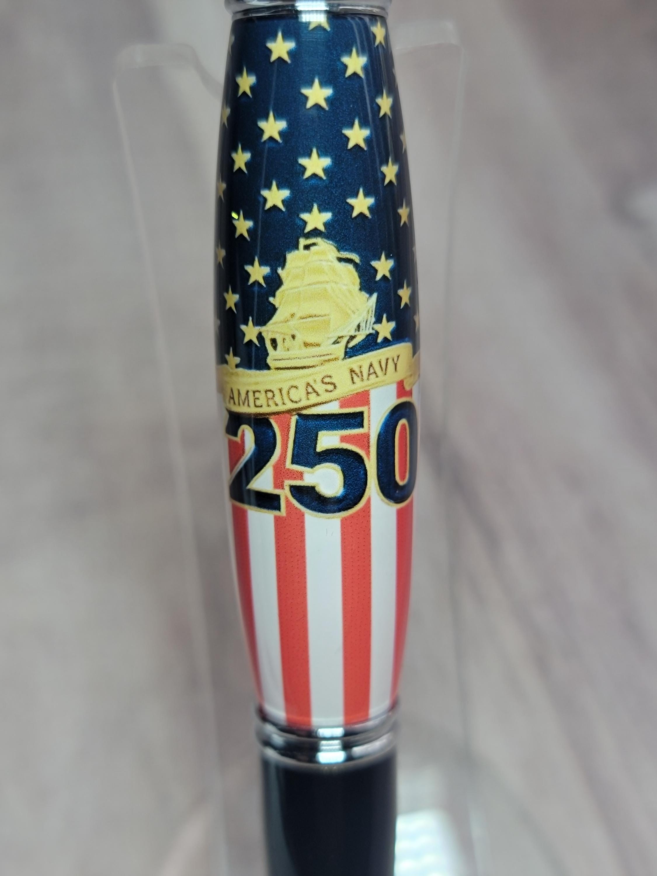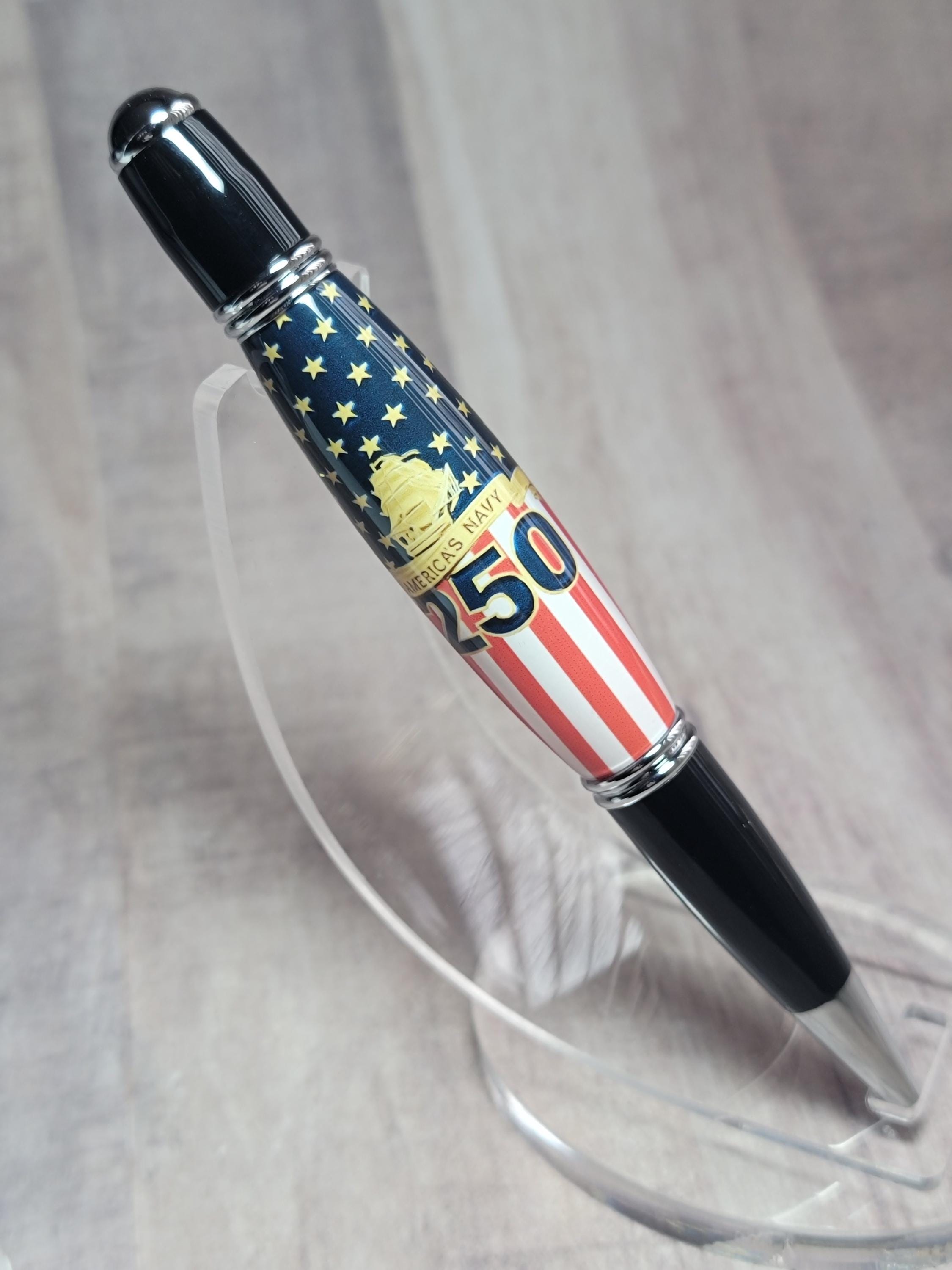 Welcome to the Military pen series. Here we have the Navy 250th anniversary refillable ballpoint pen, handmade in our Metro Detroit family workshop. This pen features a smooth twist mechanism, and chrome & black hardware. The Navy emblem is hand cast in acrylic by nearby artist Michelle Bagley, and then drilled, hand turned, sanded and polished to a perfect shine here in our workshop.