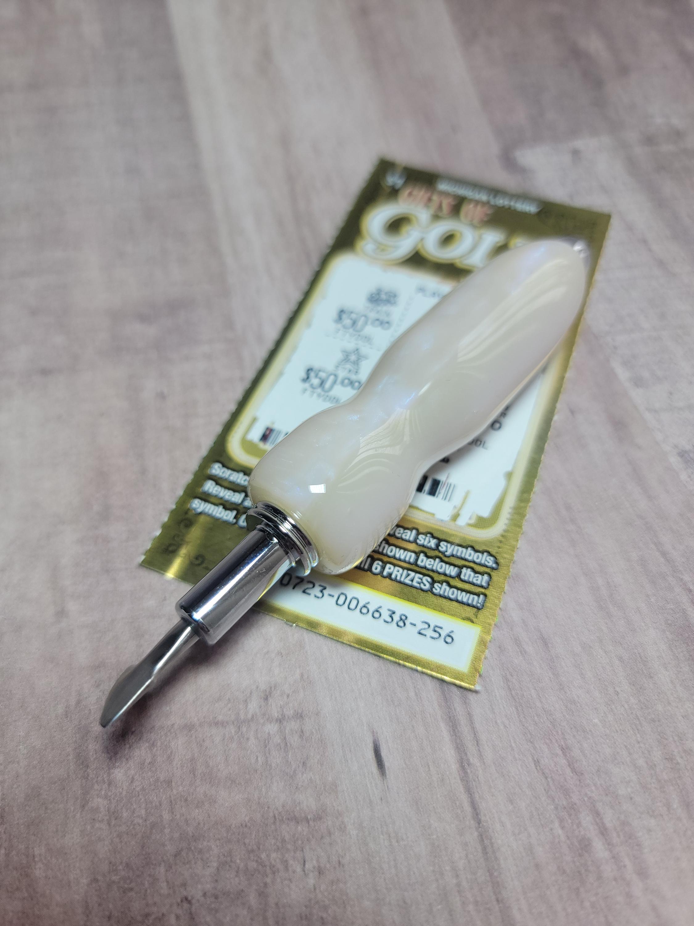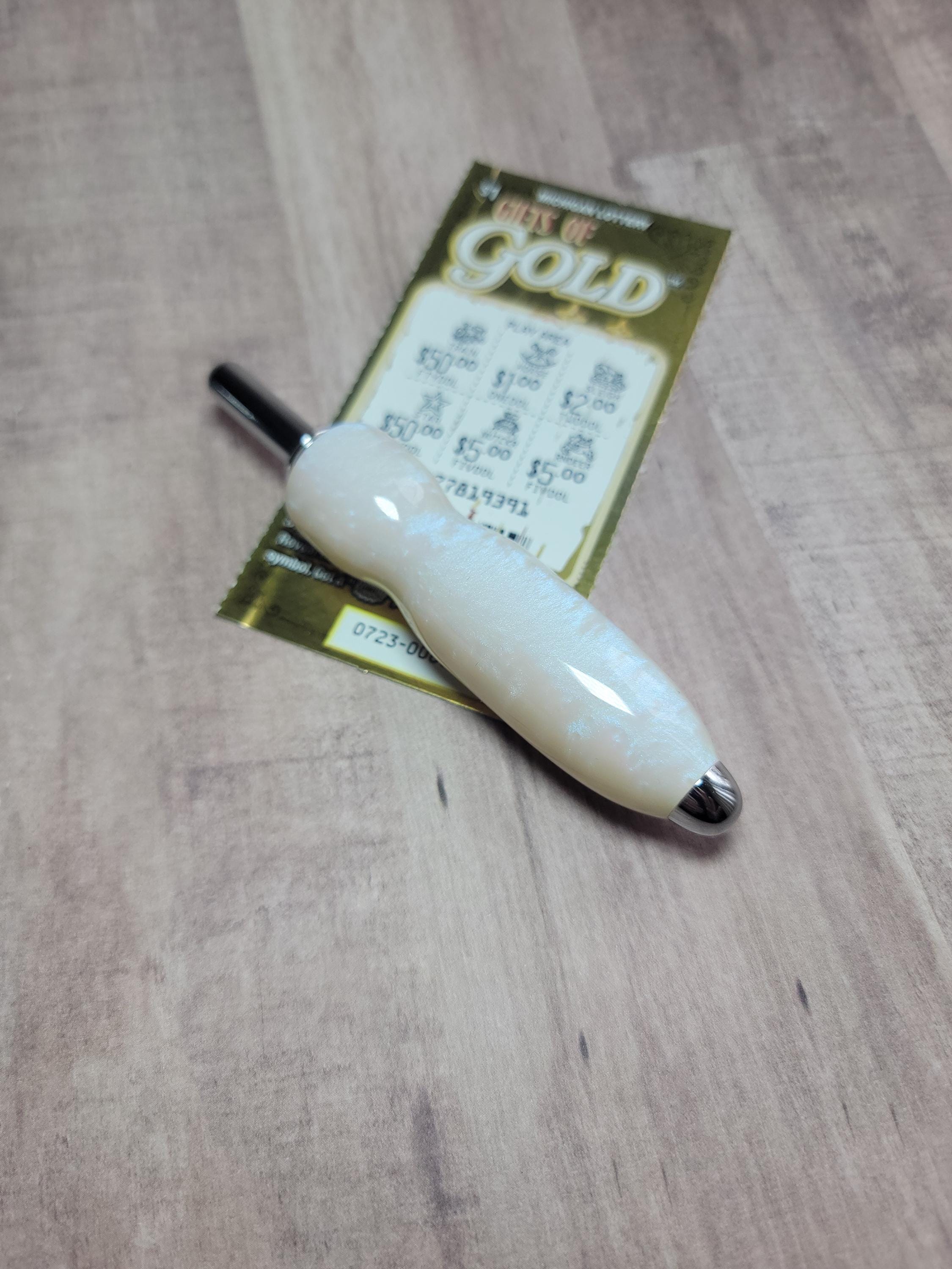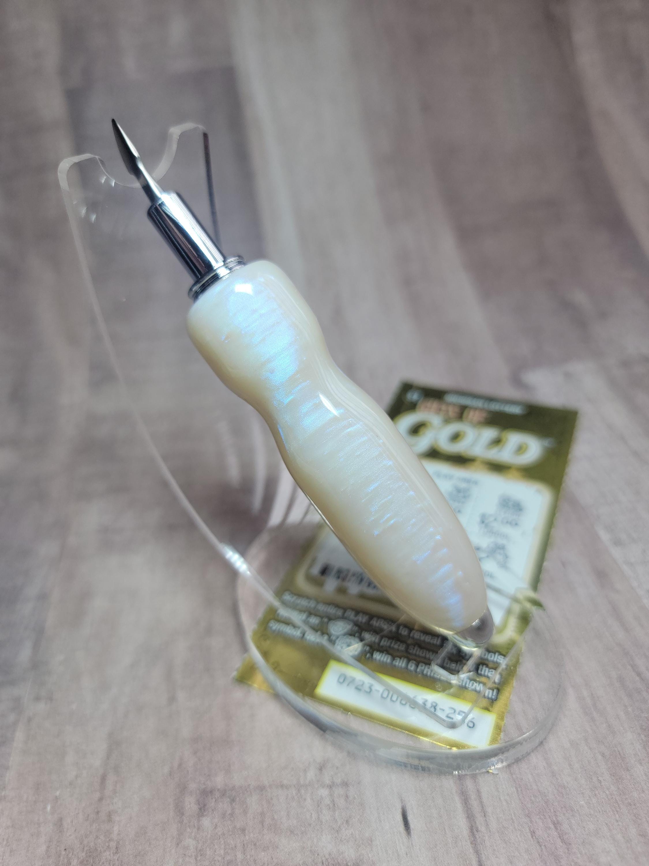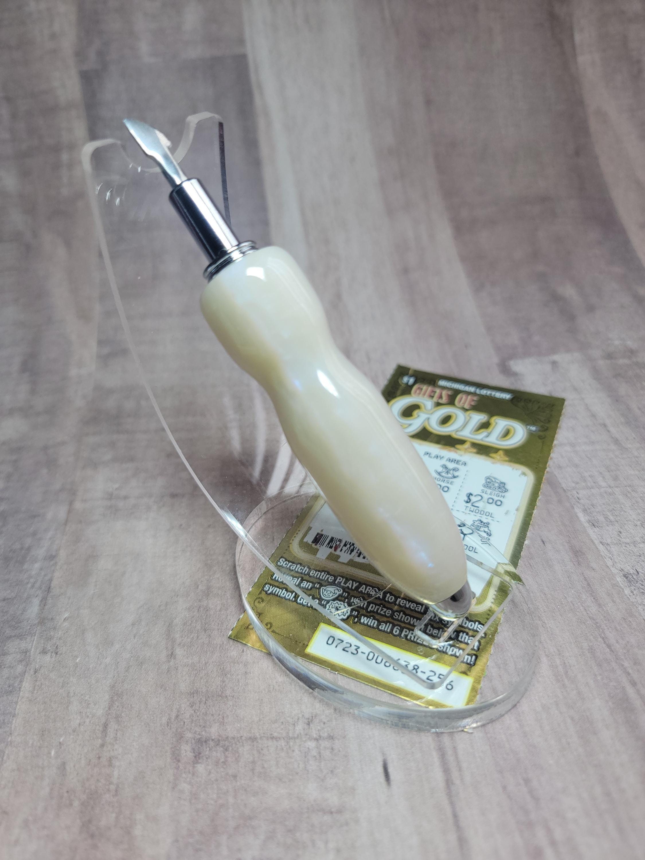 This ticket scraper was hand turned in our Metro Detroit workshop from a pearly white acrylic. The scratching tool conveniently can be flipped into the handle for safe keeping.