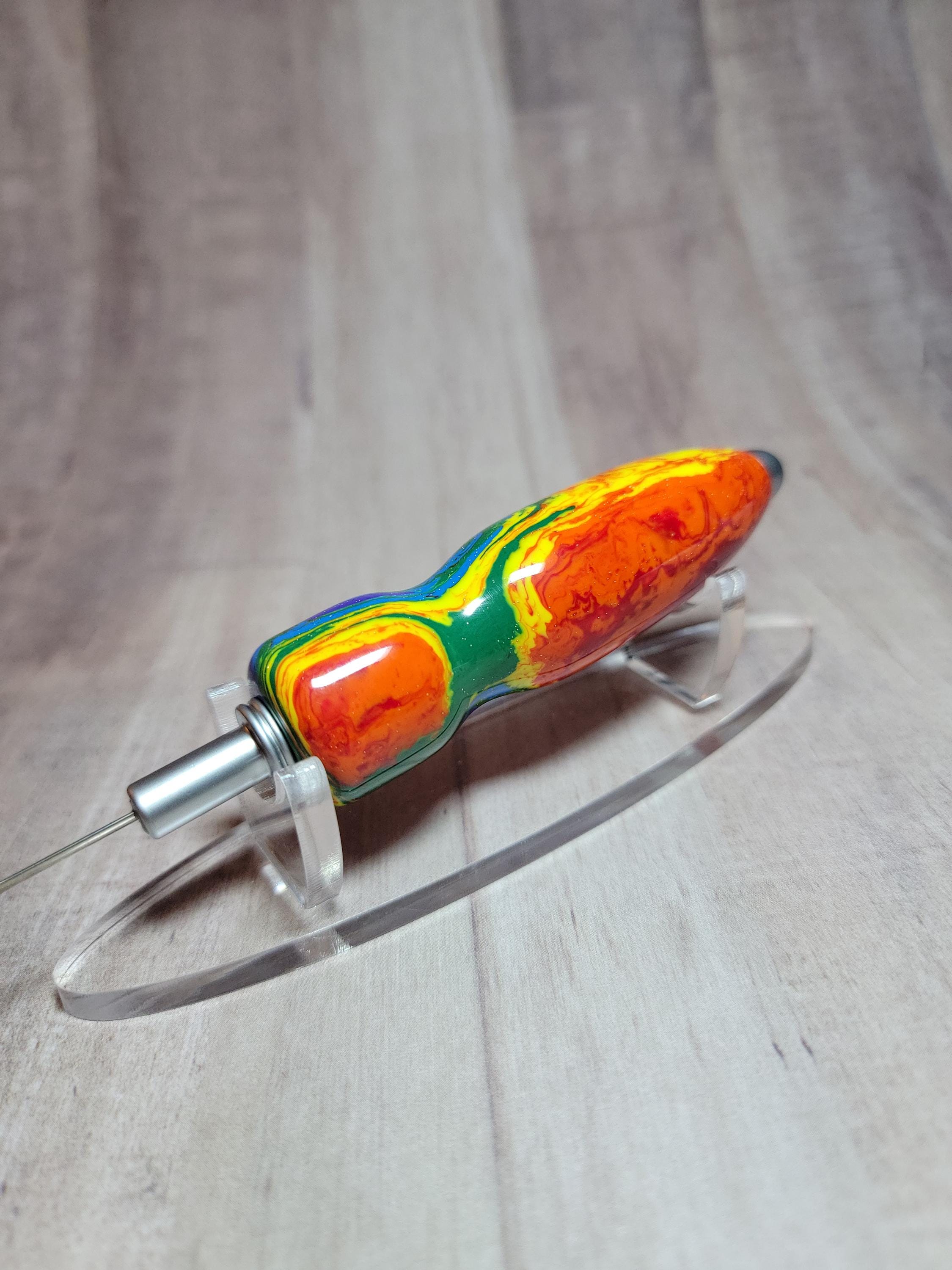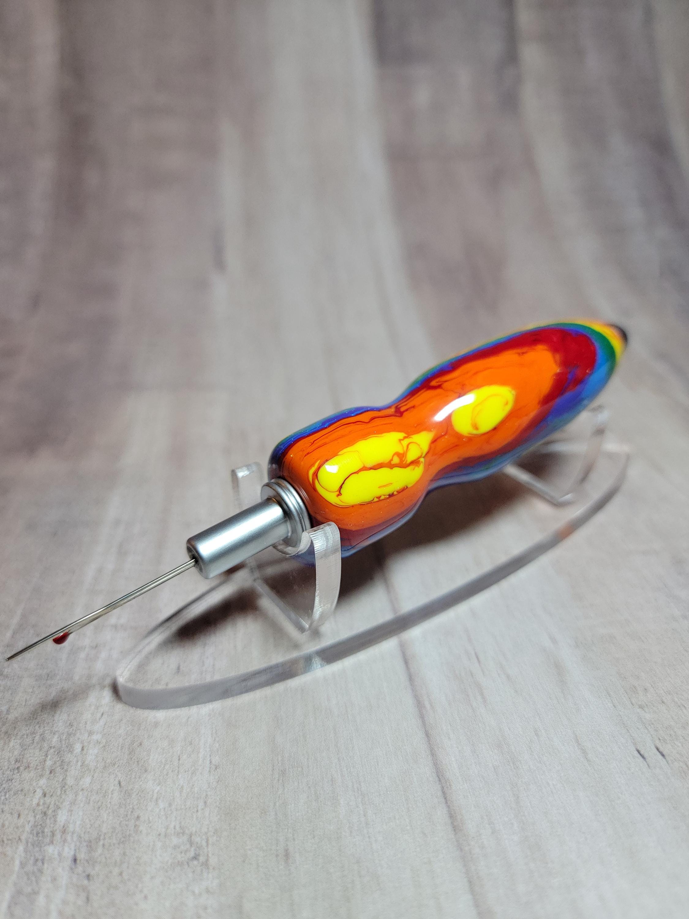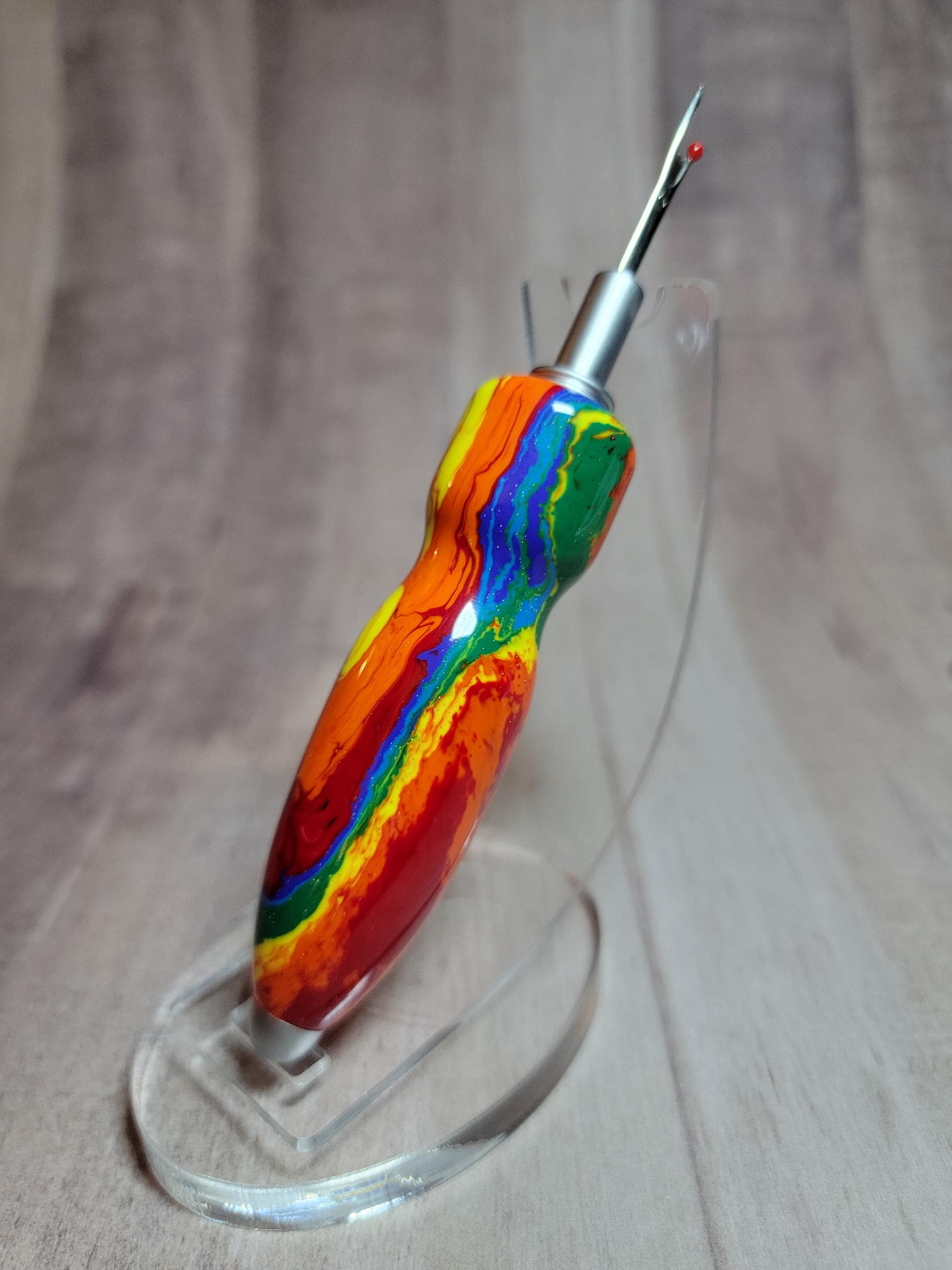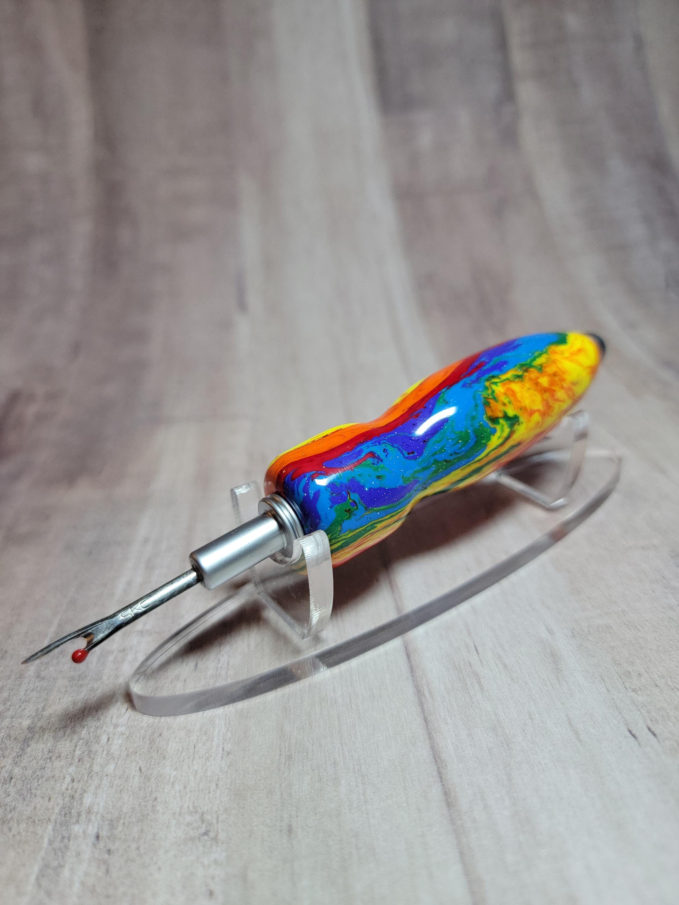This ergonomic seam ripper was hand turned in our Metro Detroit workshop from a melted rainbow with white speckles acrylic.