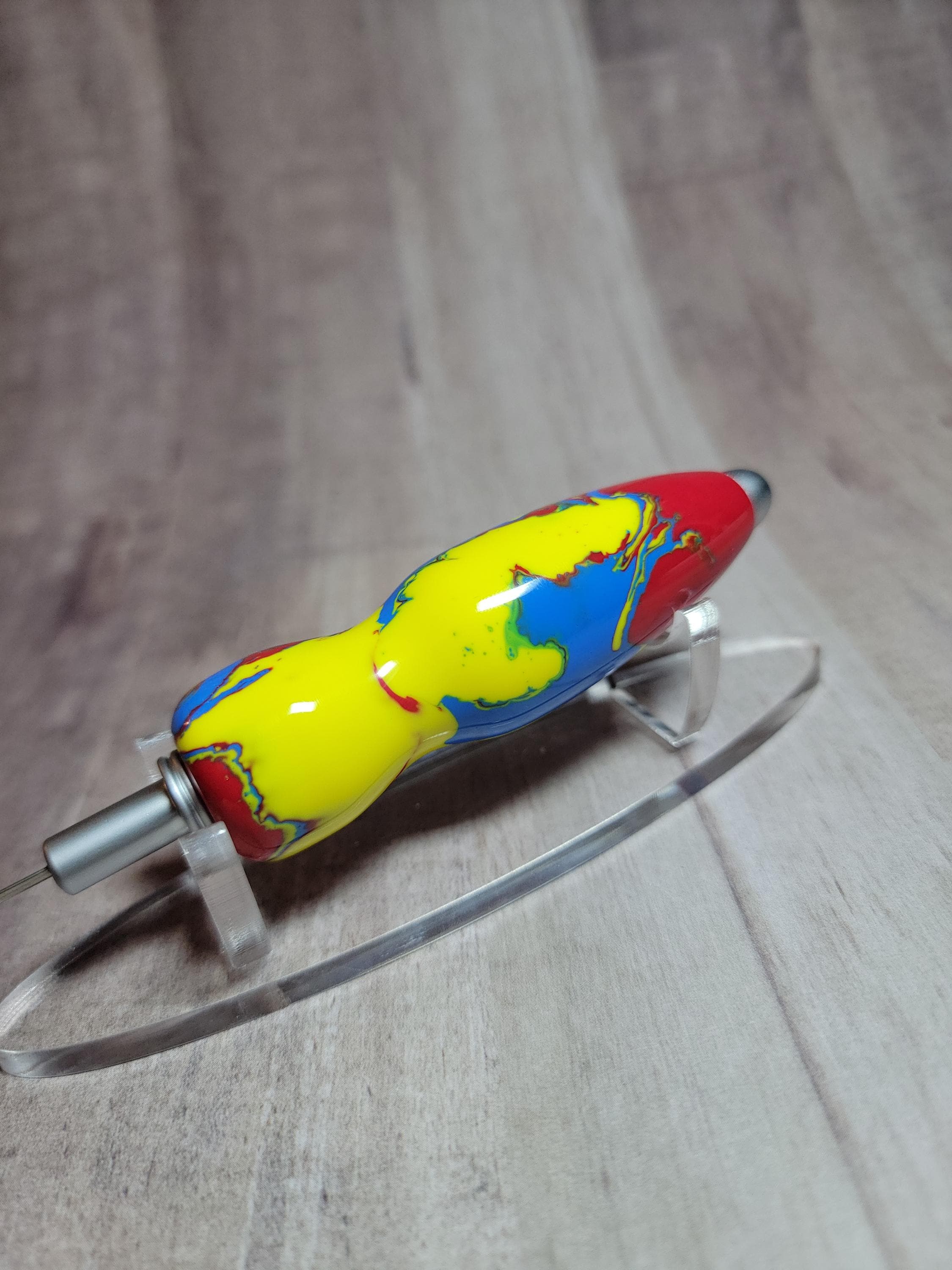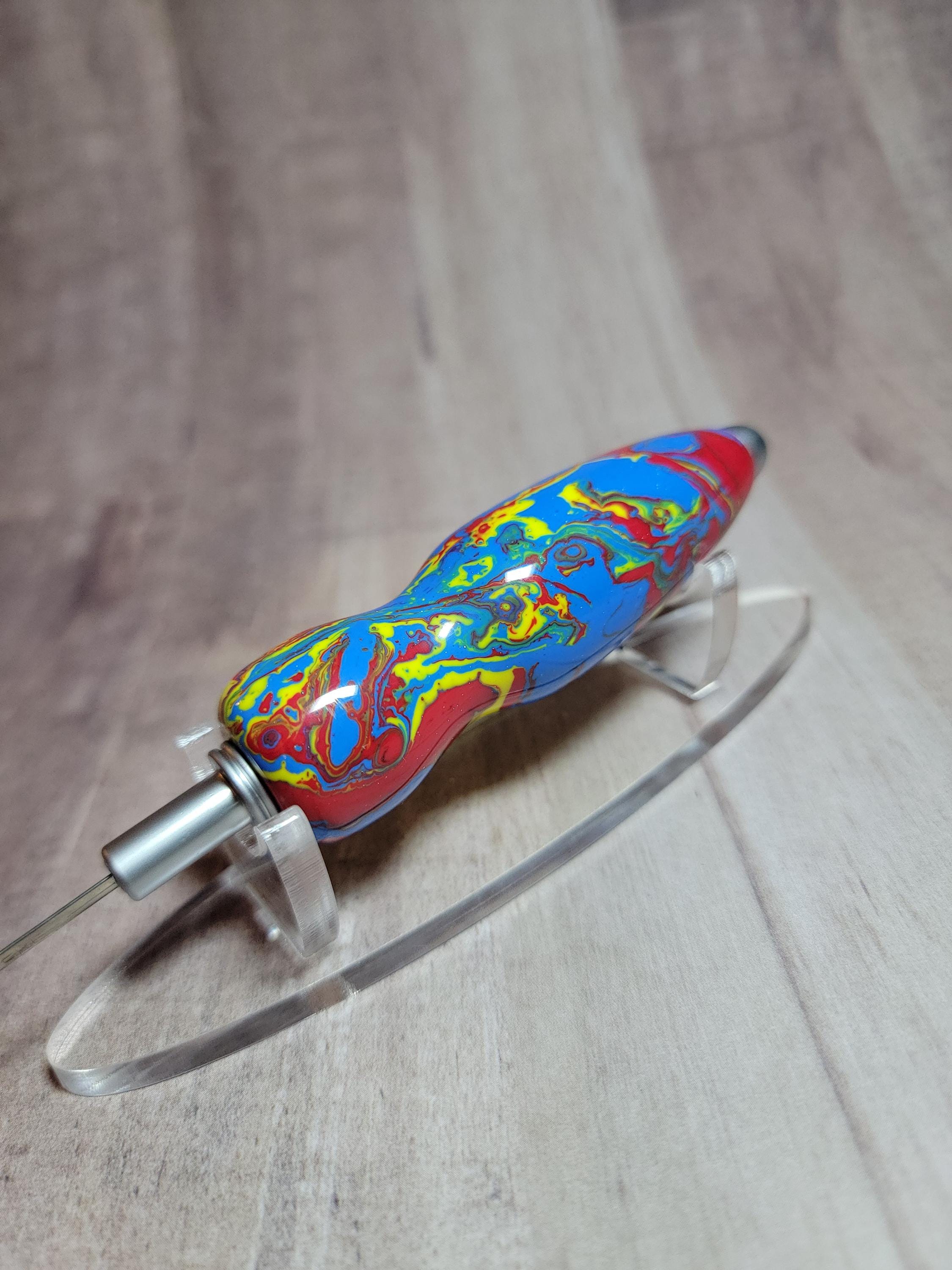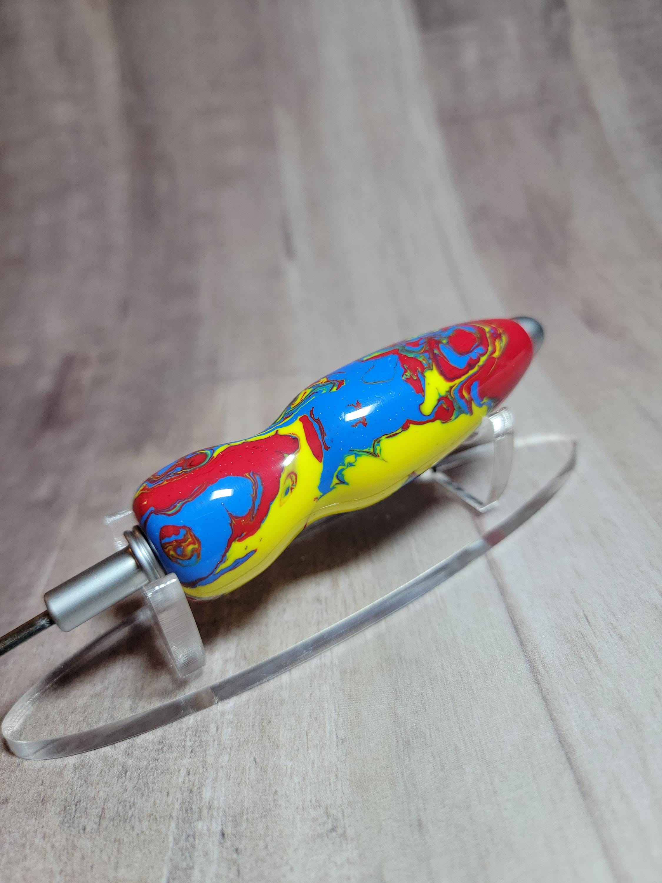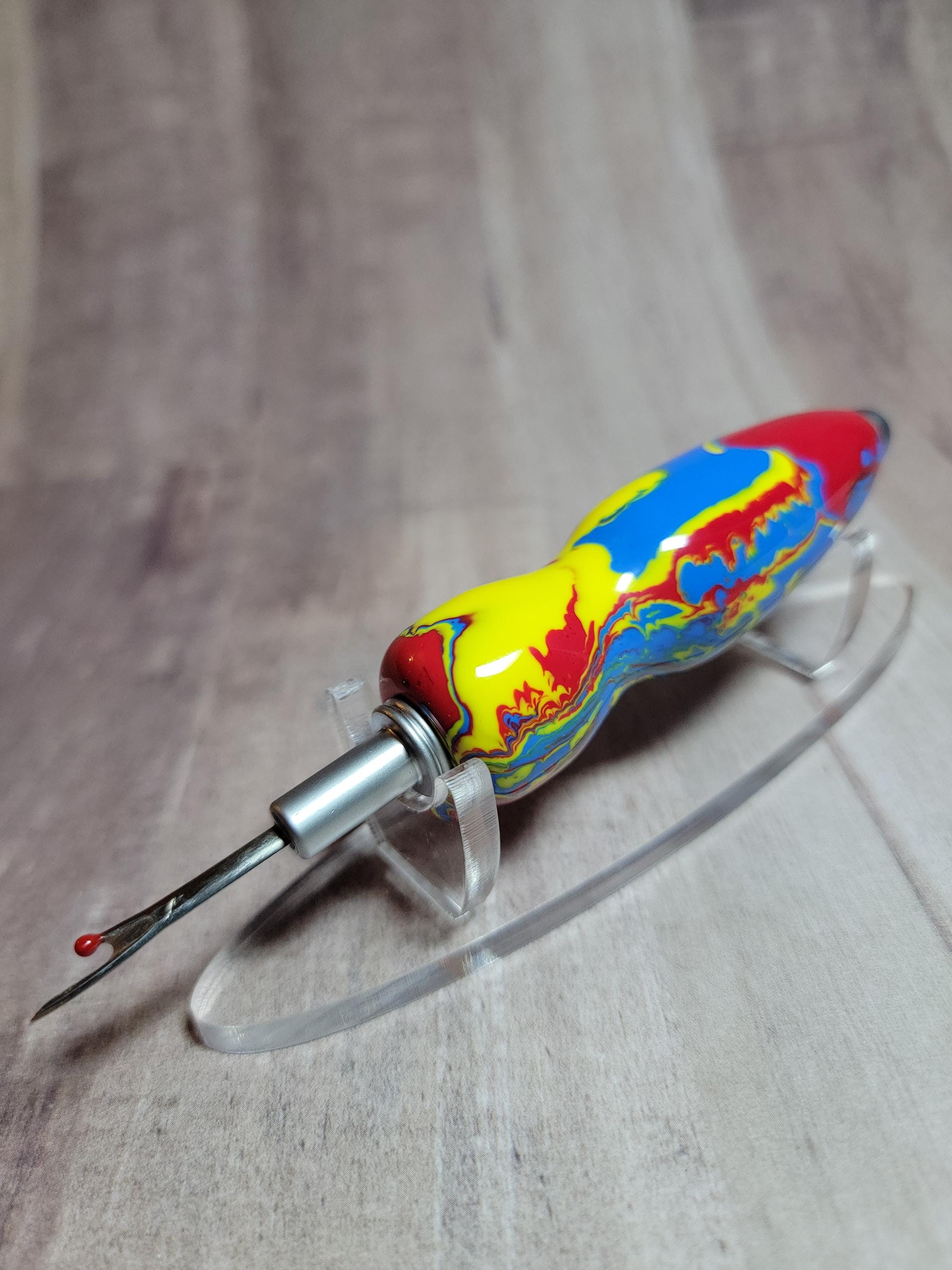 This ergonomic seam ripper was hand turned in our Metro Detroit workshop from a red, yellow and blue acrylic.