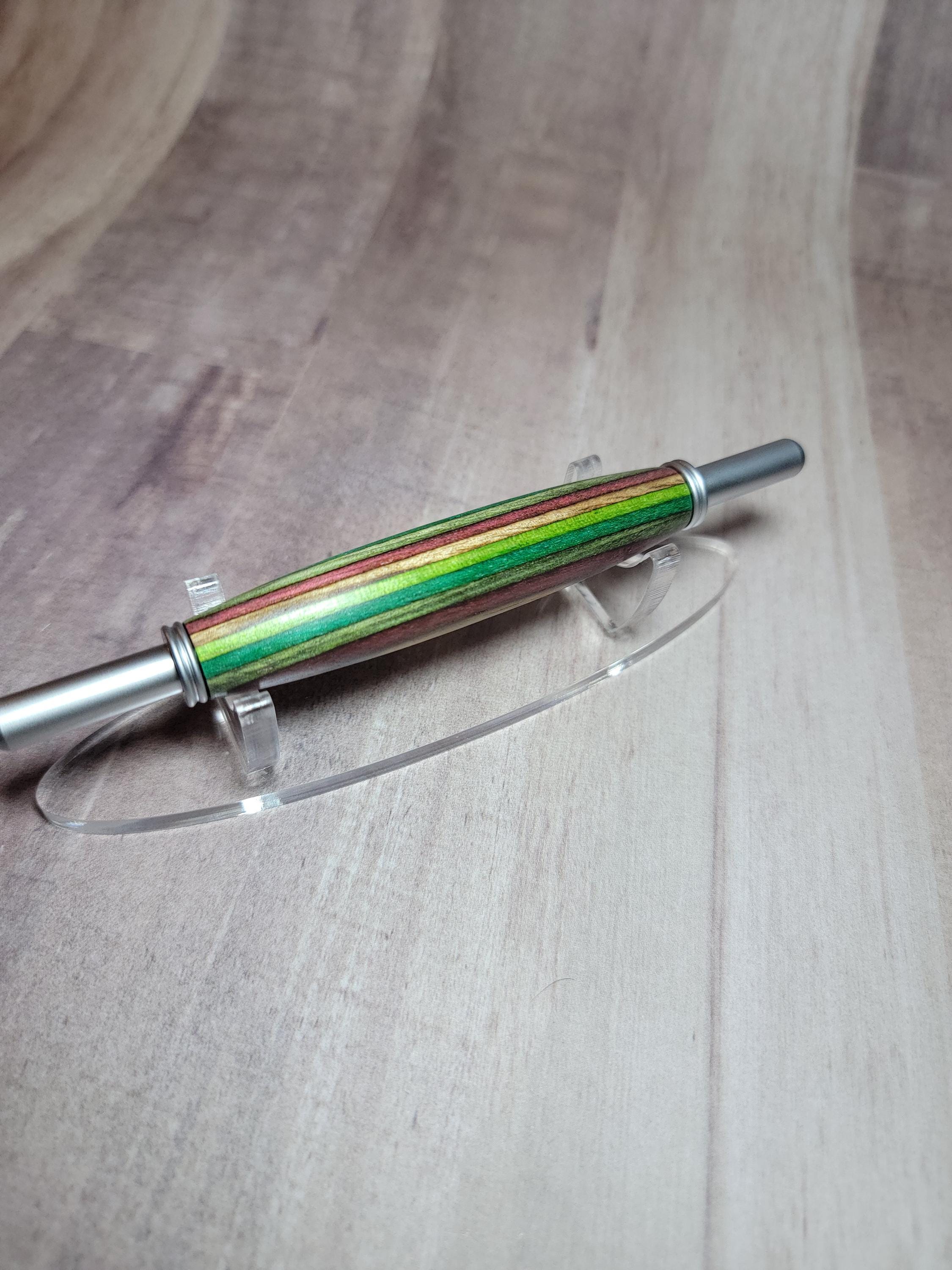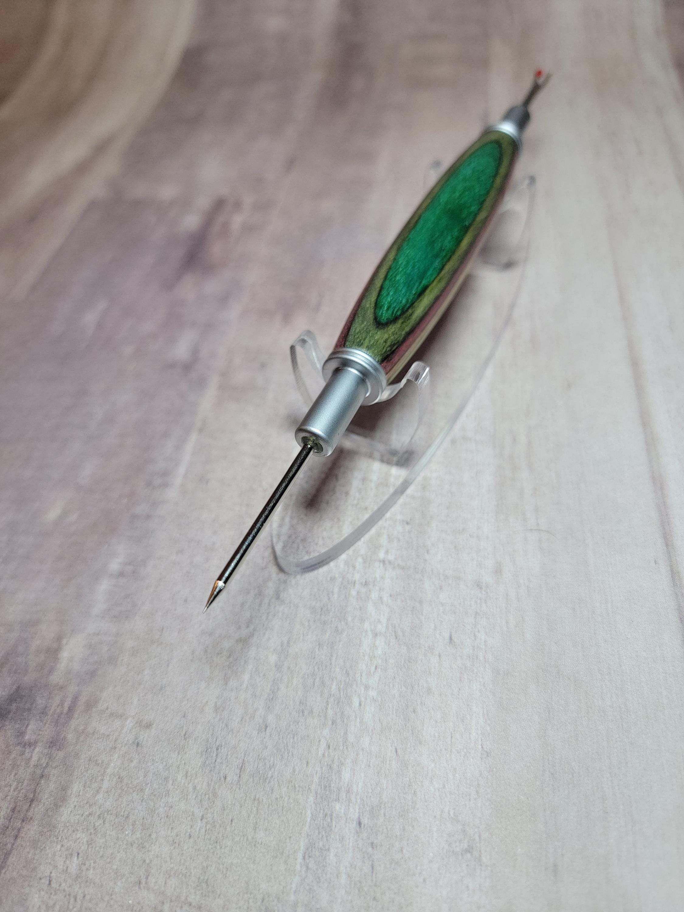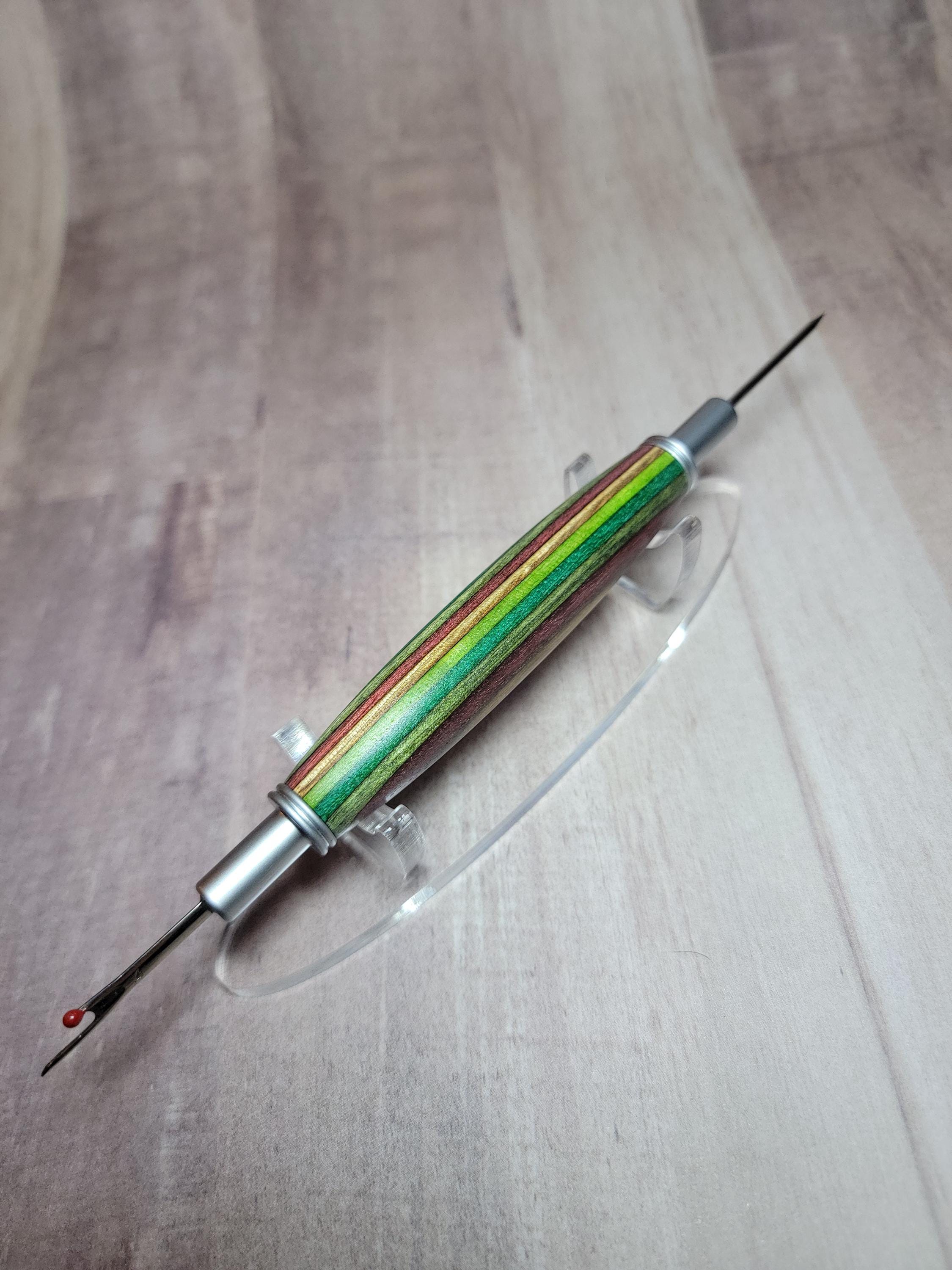 This sewing and quilting tool was hand turned in our Metro Detroit workshop from a fun stacked and dyed dark rainbow wood.