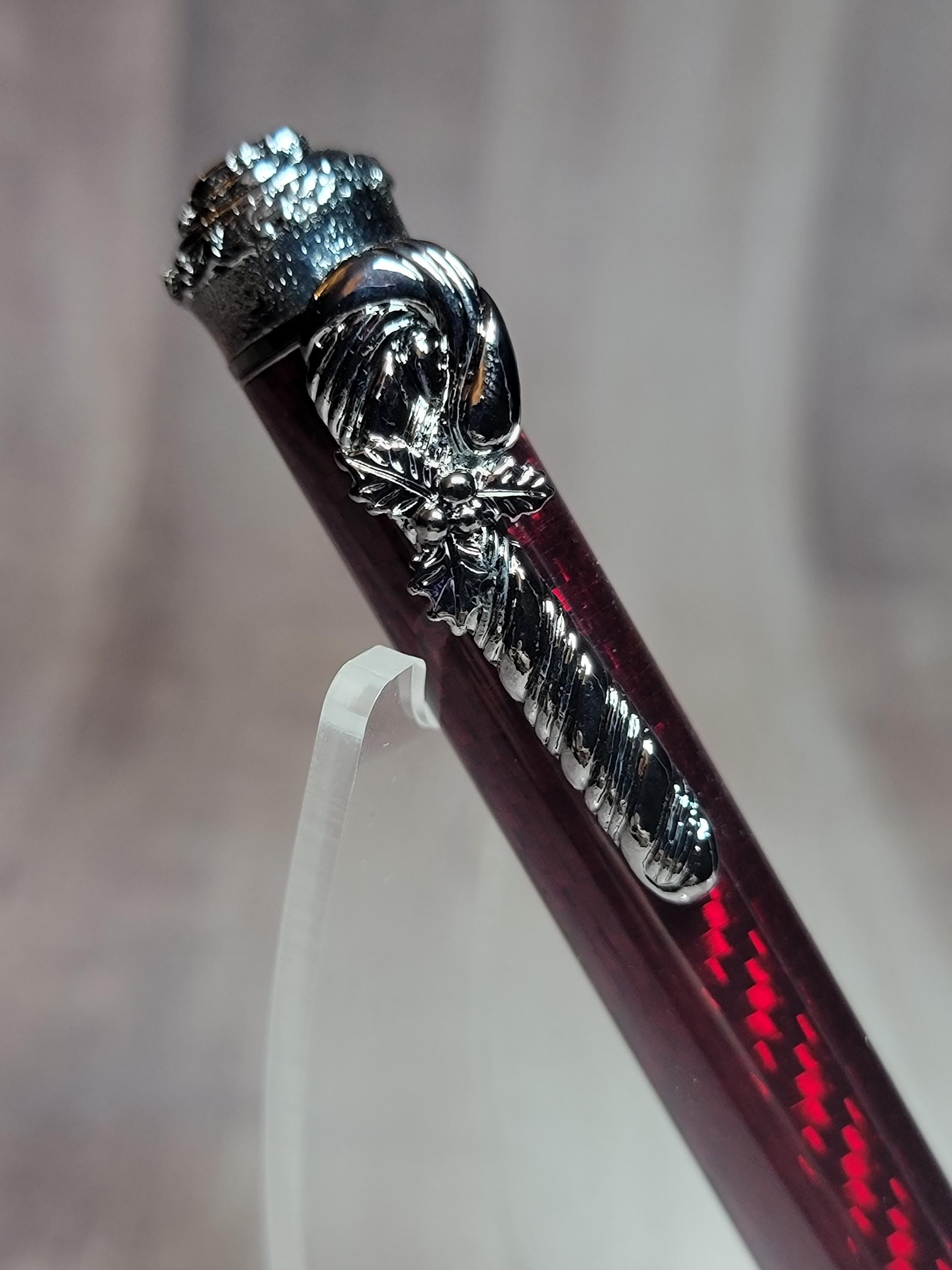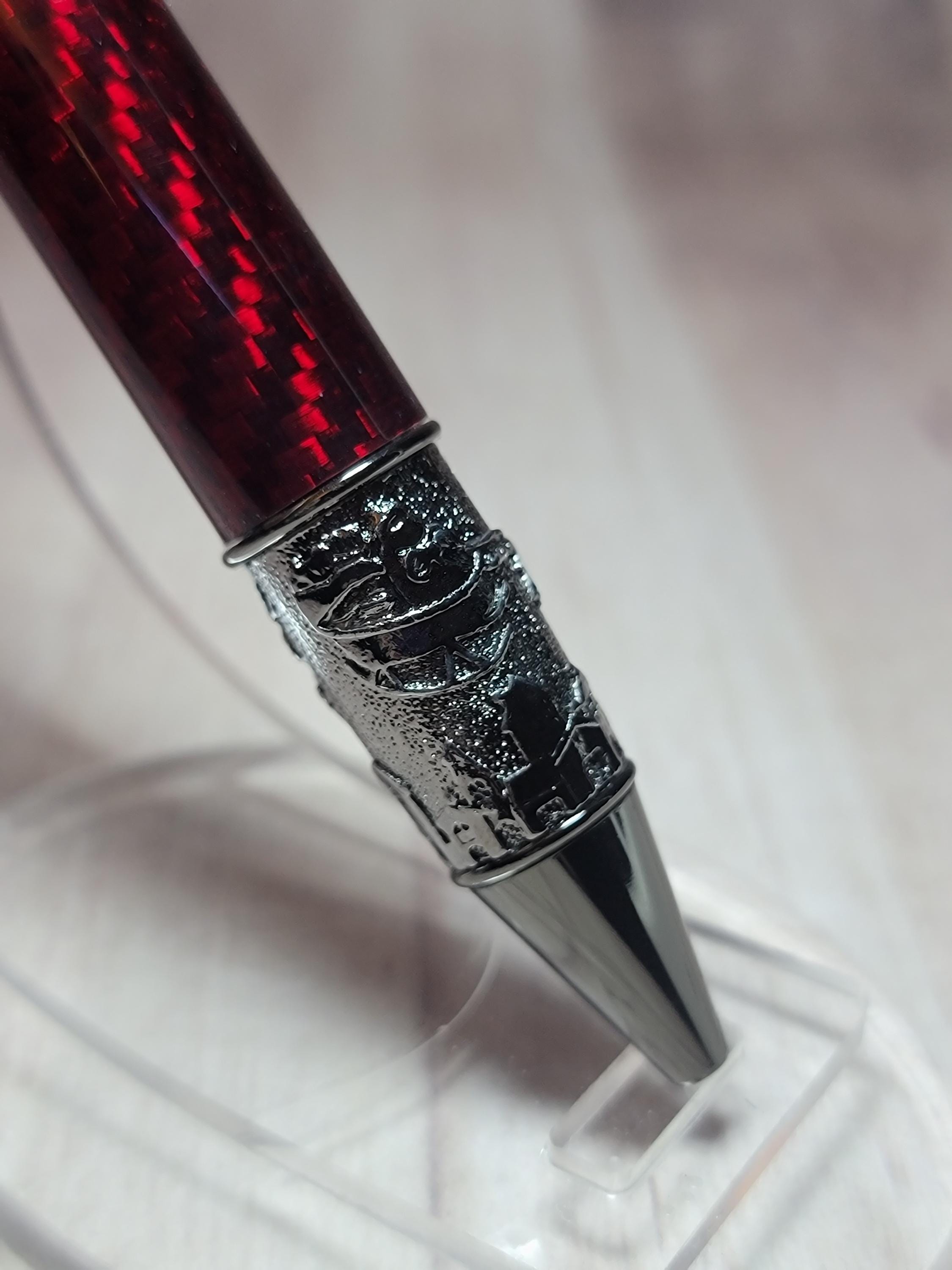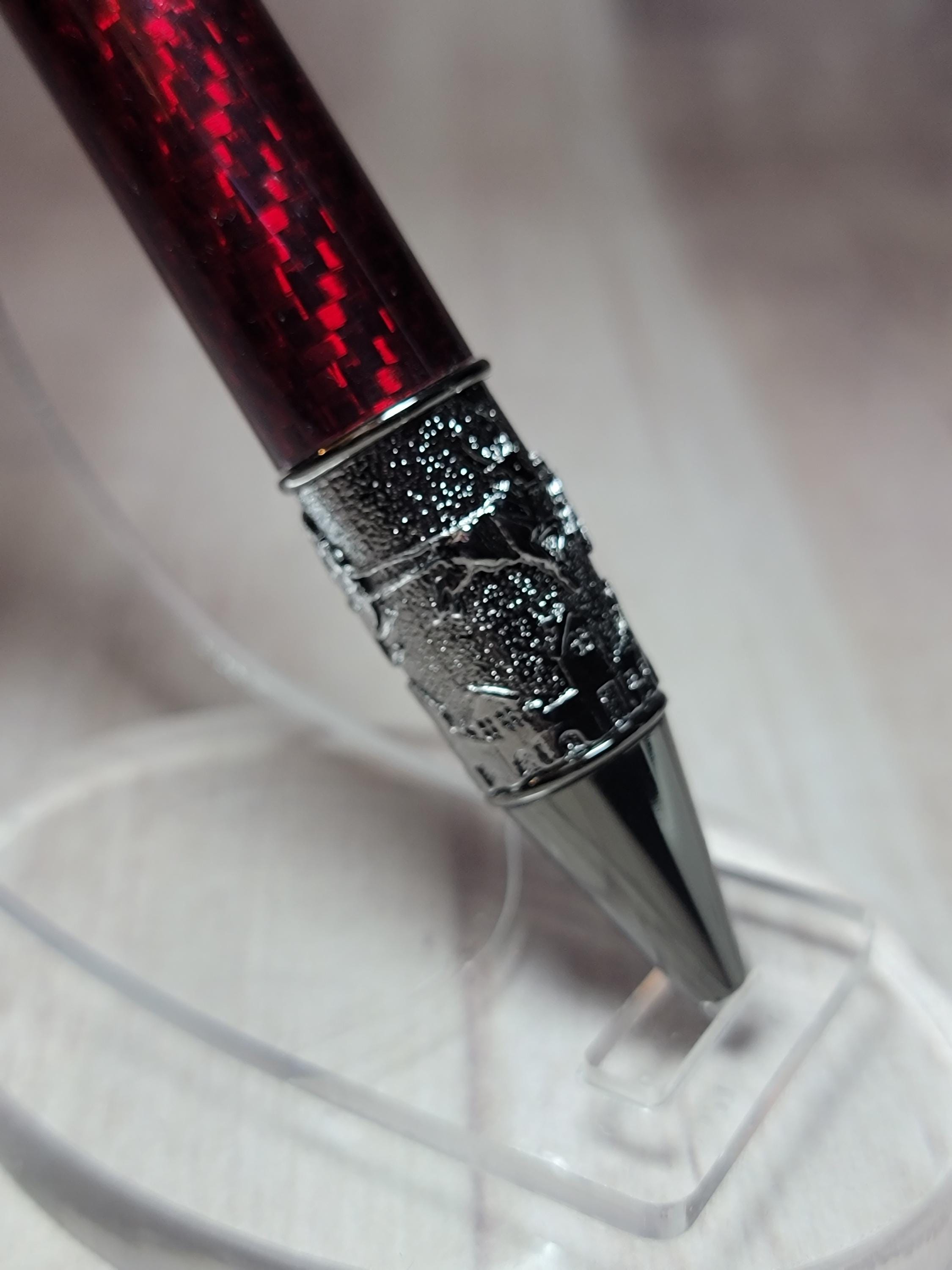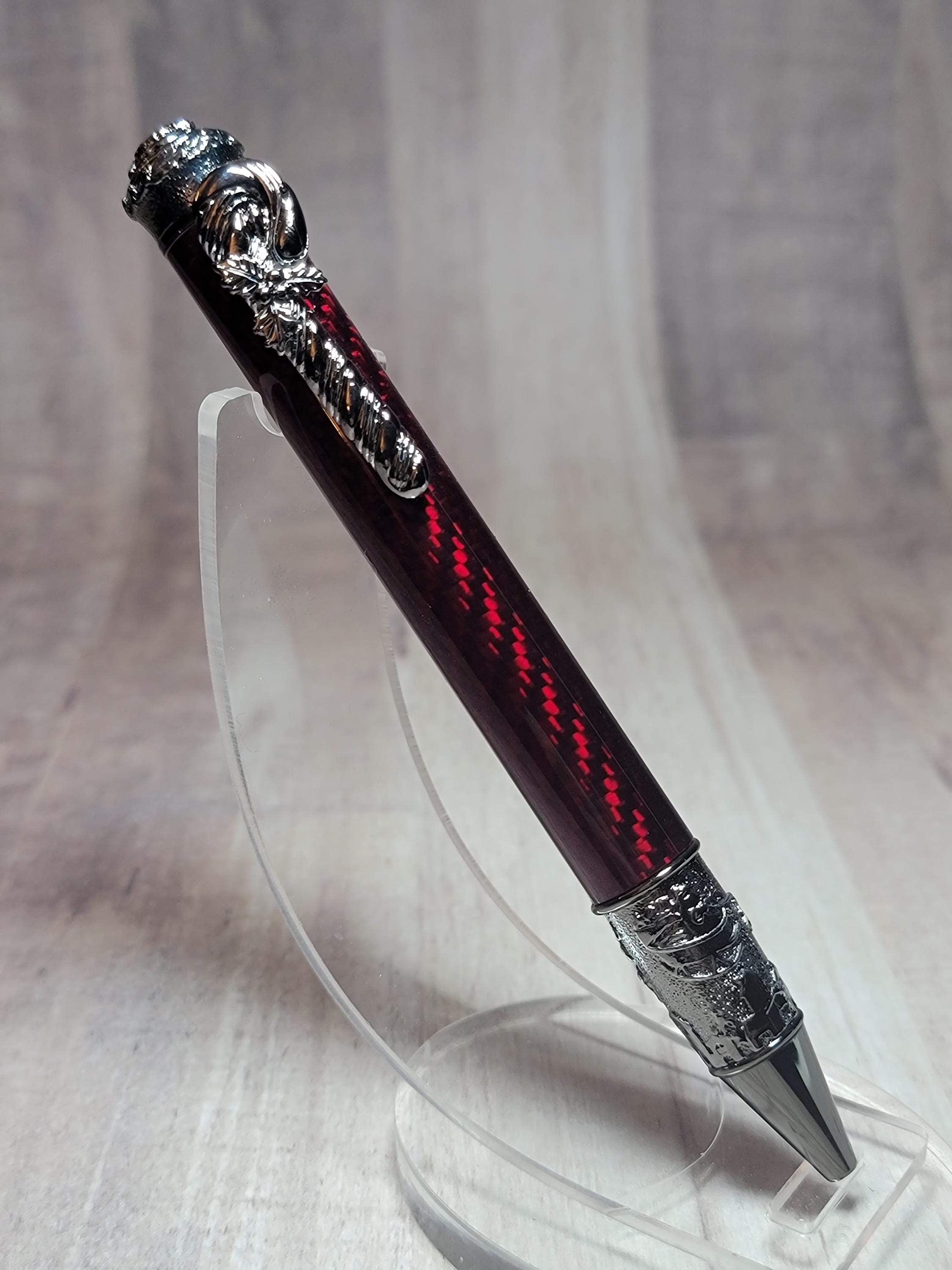 This is a ballpoint twist pen made with a beautiful red carbon fiber acrylic. The pen features gunmetal hardware and a smooth writing experience.