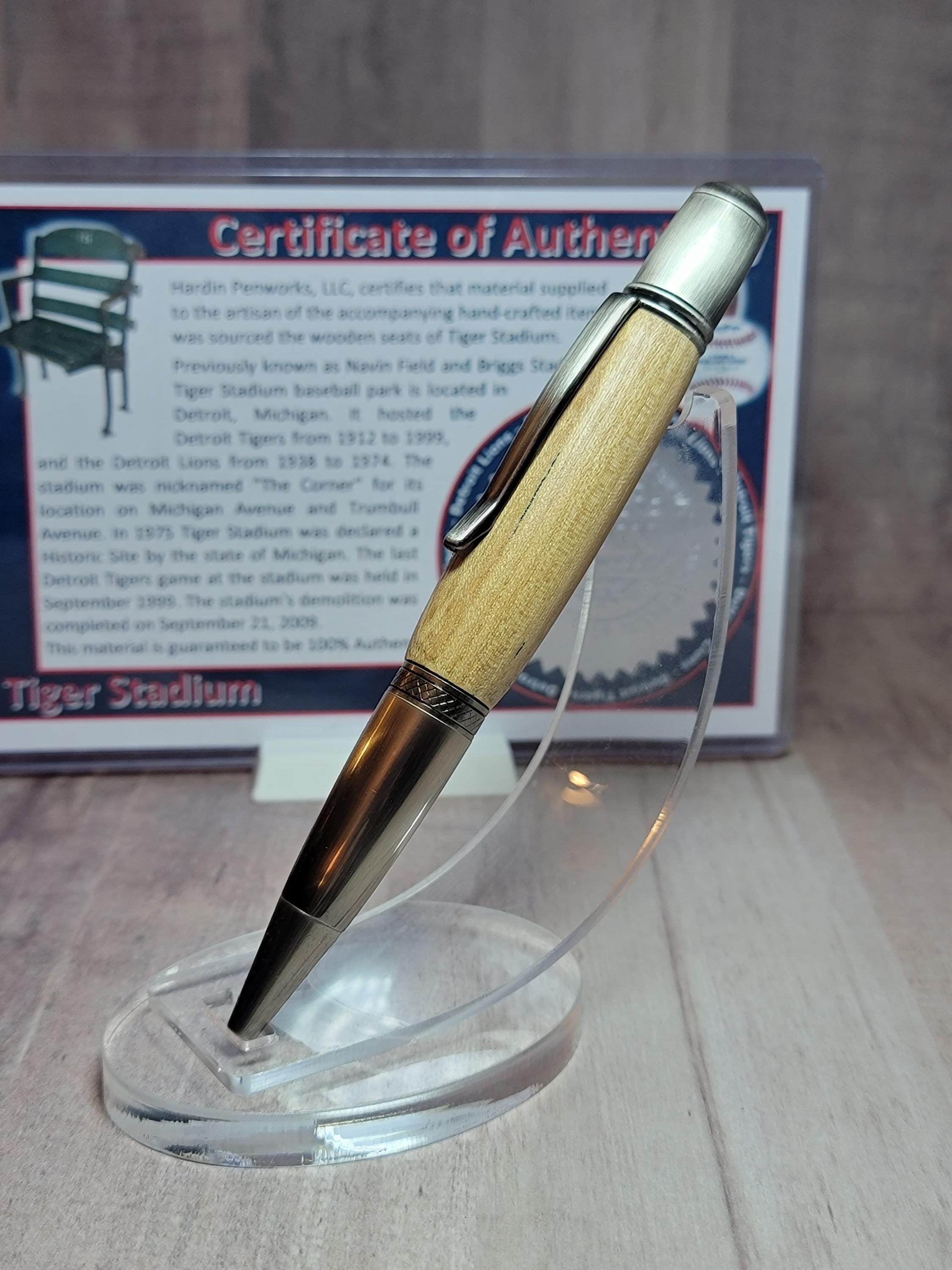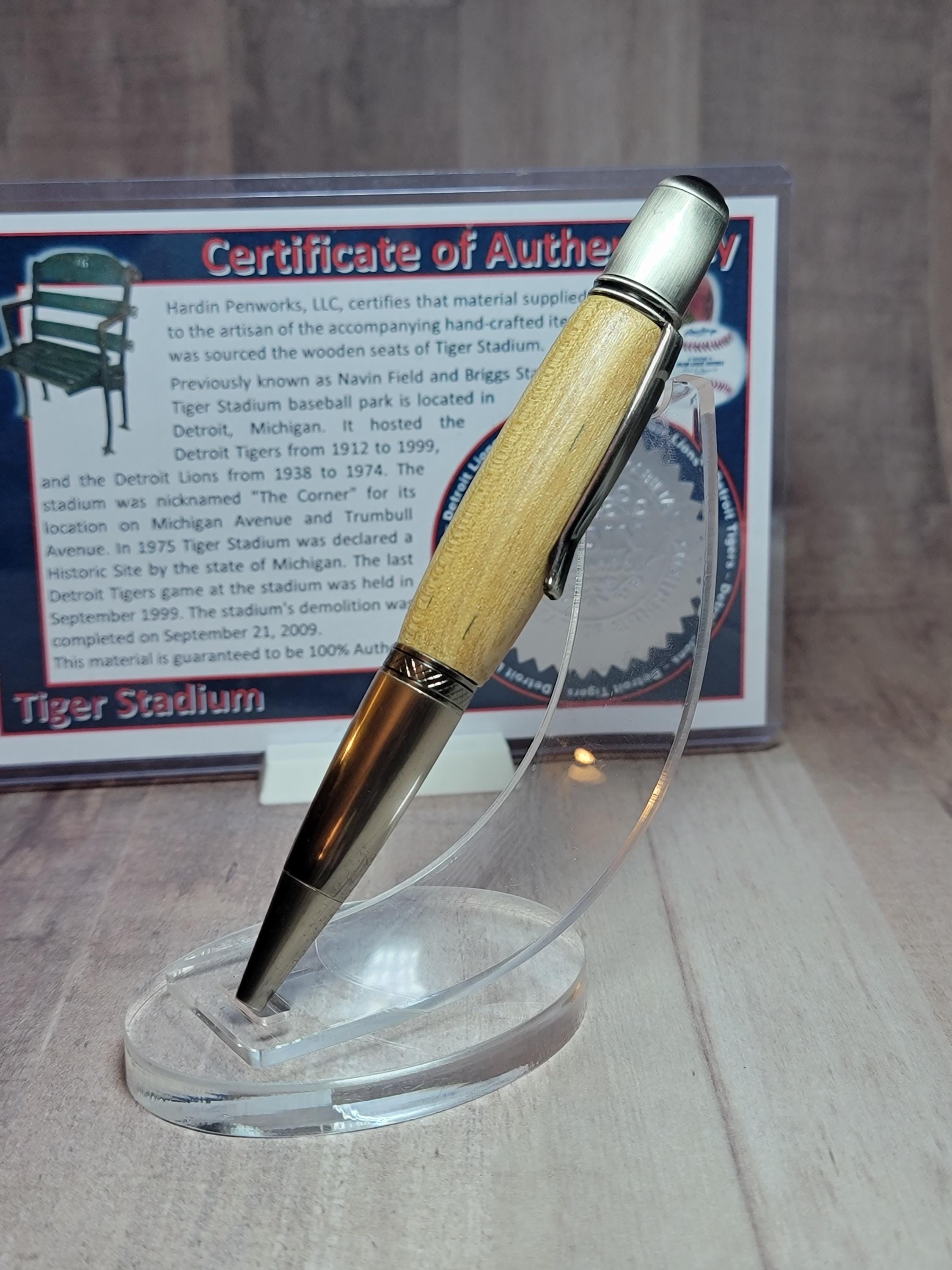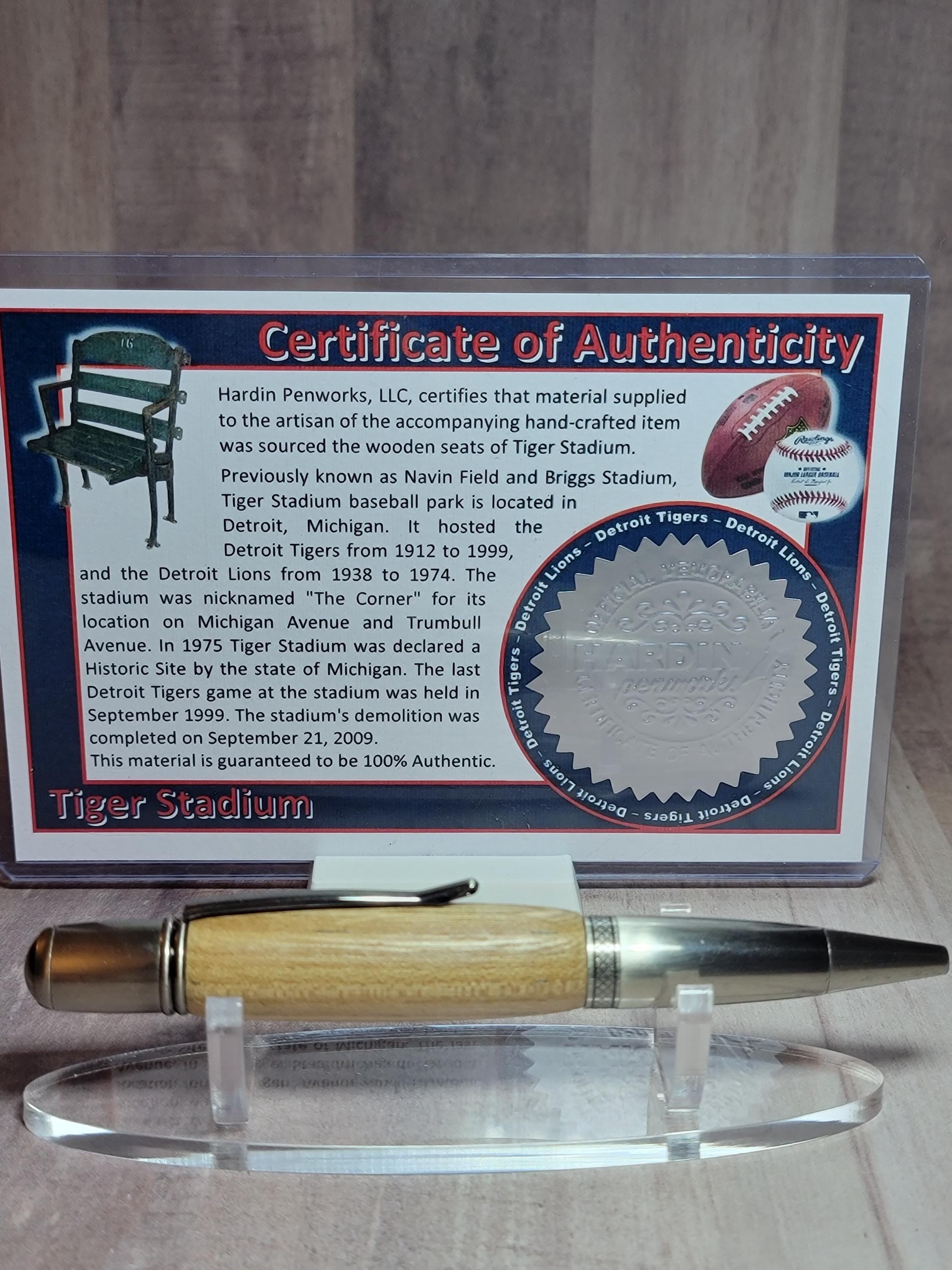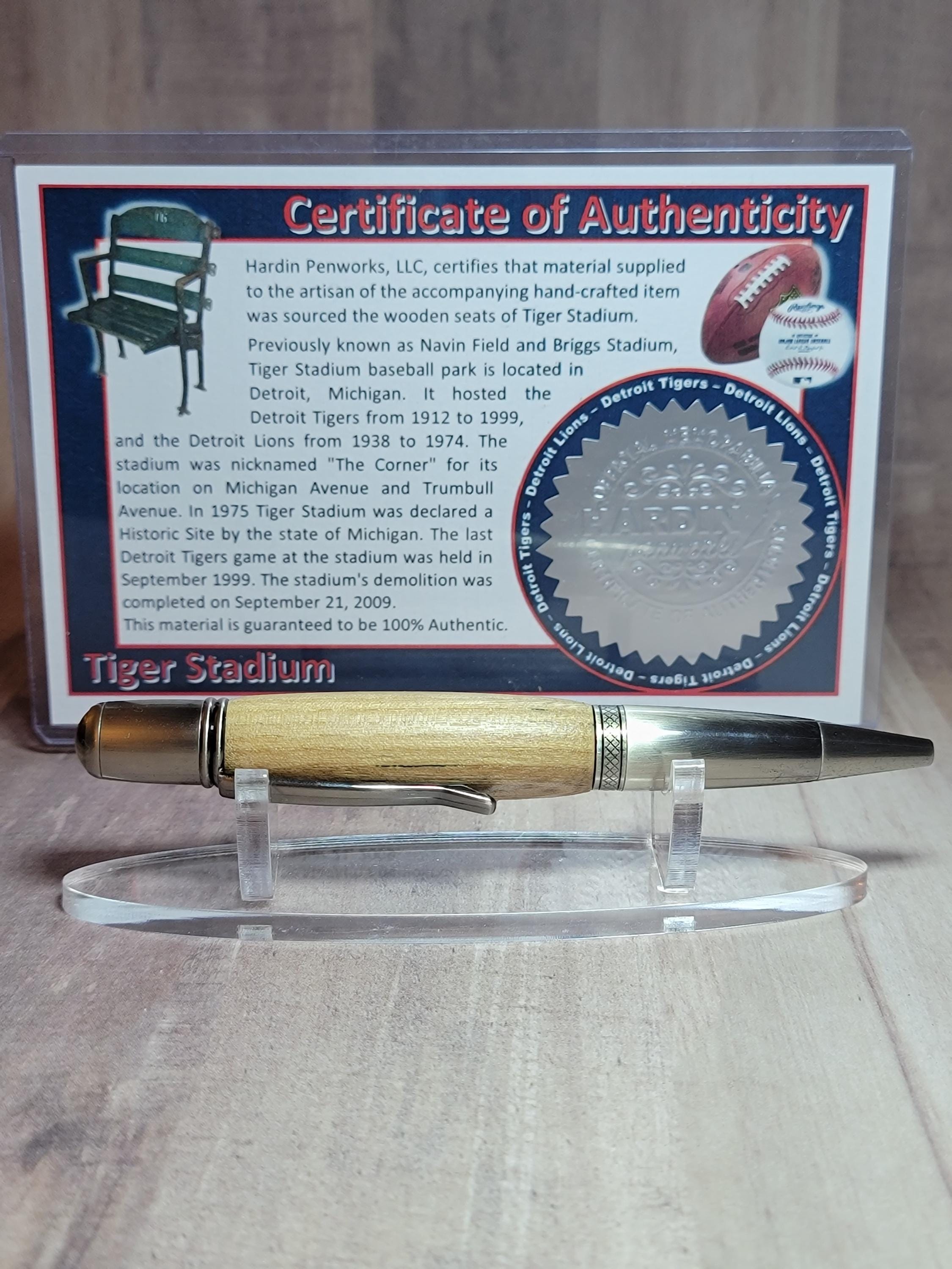 Hardin Penworks, LLC, certifies that material supplied to the artisan of the accompanying hand-crafted item was sourced from the wood stadium seats of Tiger Stadium.