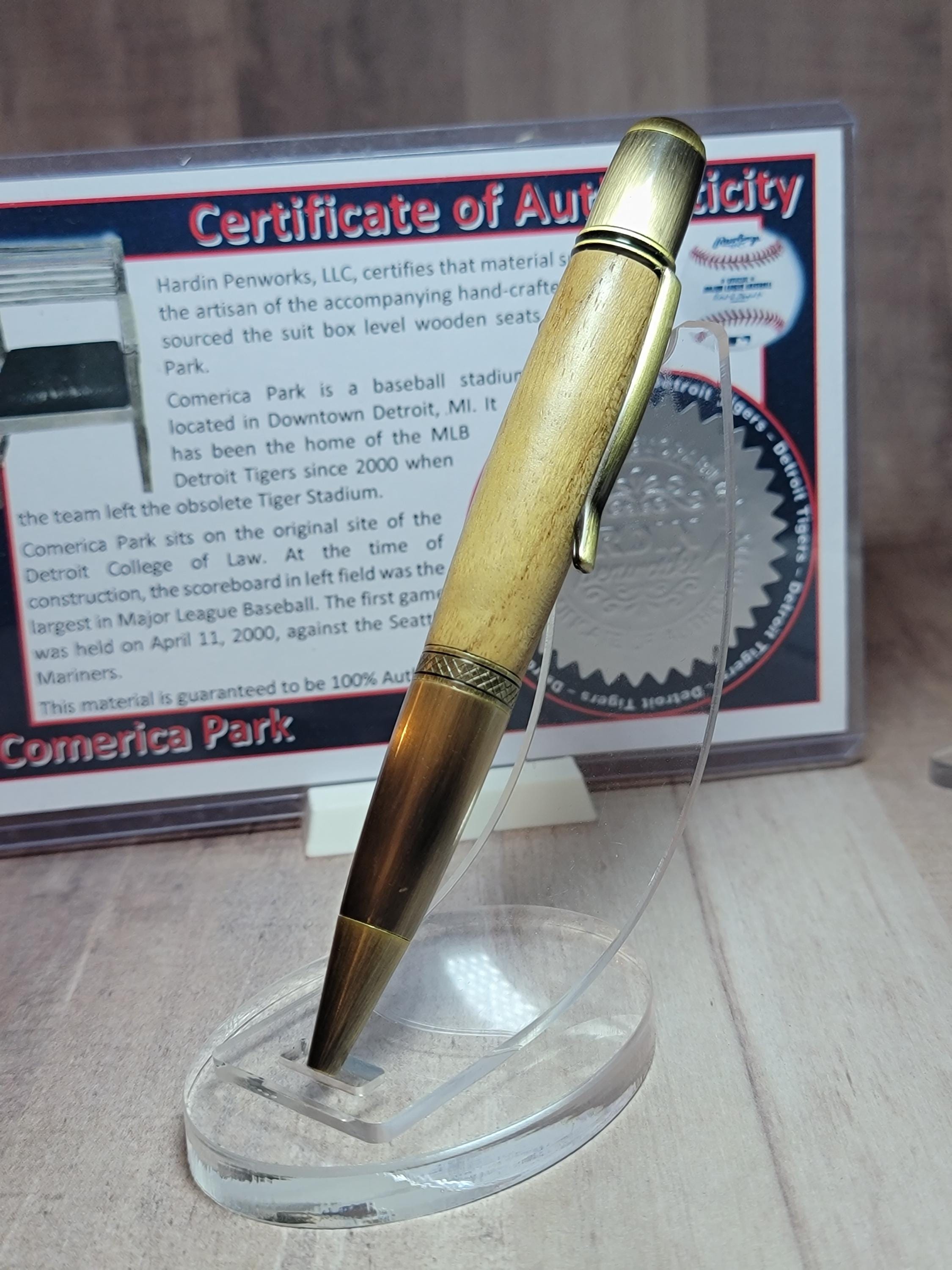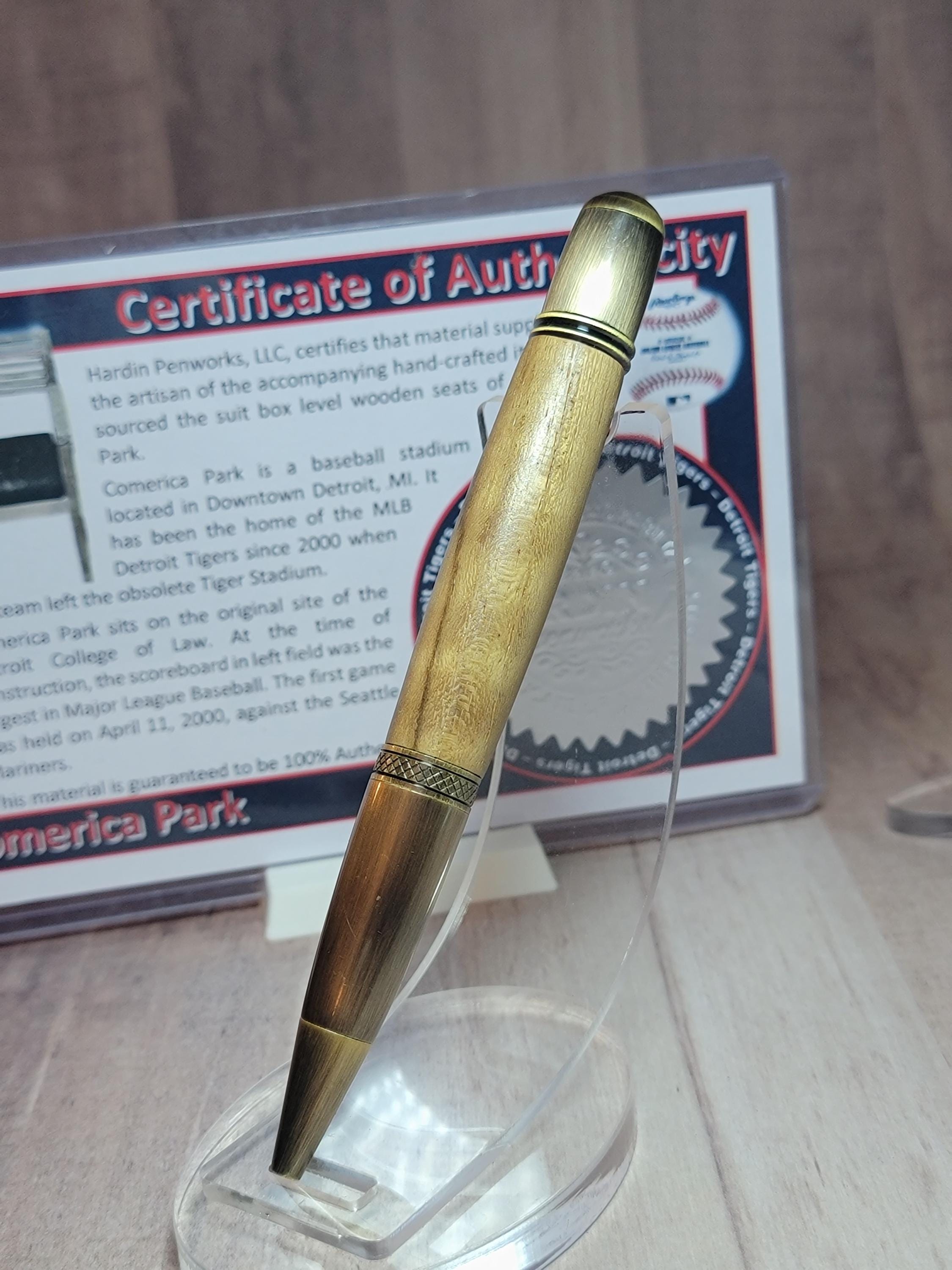 This hand turned pen is made from wood suite seating from Comerica Park in Detroit, the home of the Detroit Tigers. Along with the pen, you will receive a certificate of authenticity. This pen features a smooth twist mechanism and bronze hardware.