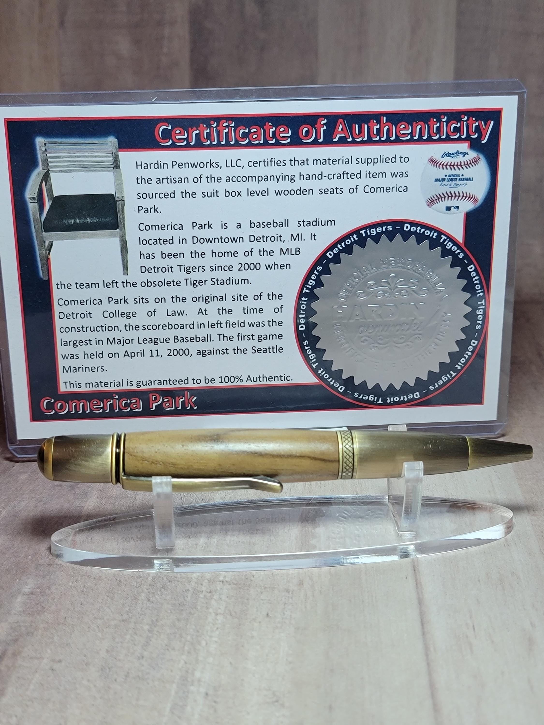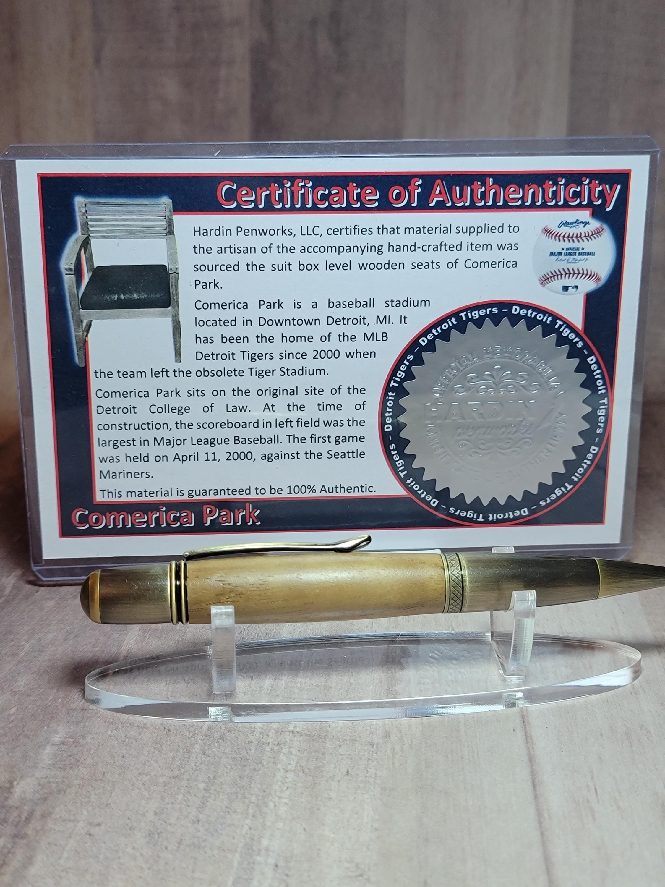Hardin Penworks, LLC, certifies that material supplied to the artisan of the accompanying hand-crafted item was sourced from the wood suite seats of Comerica Park.