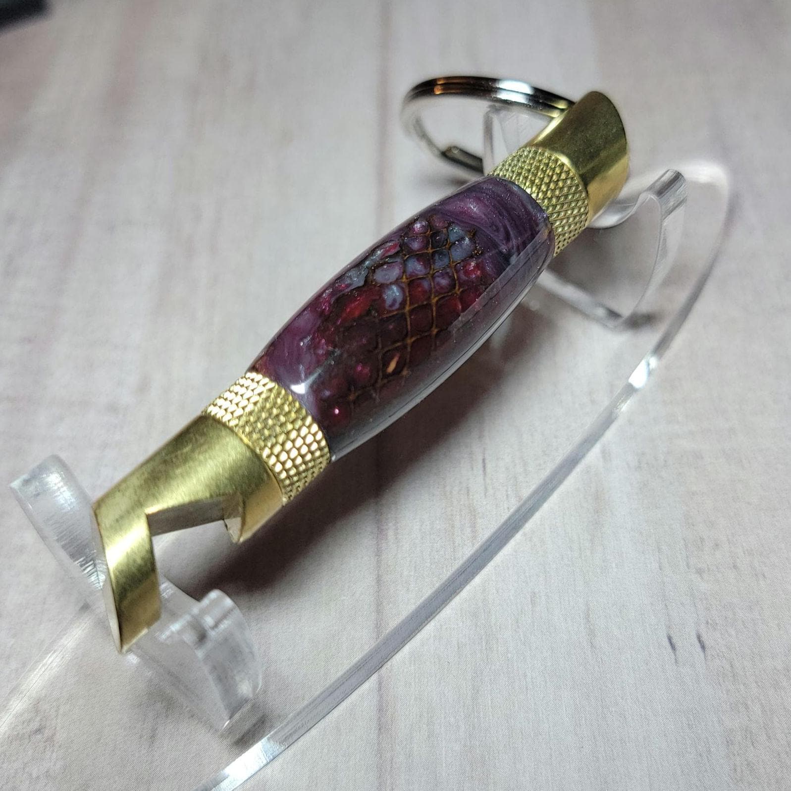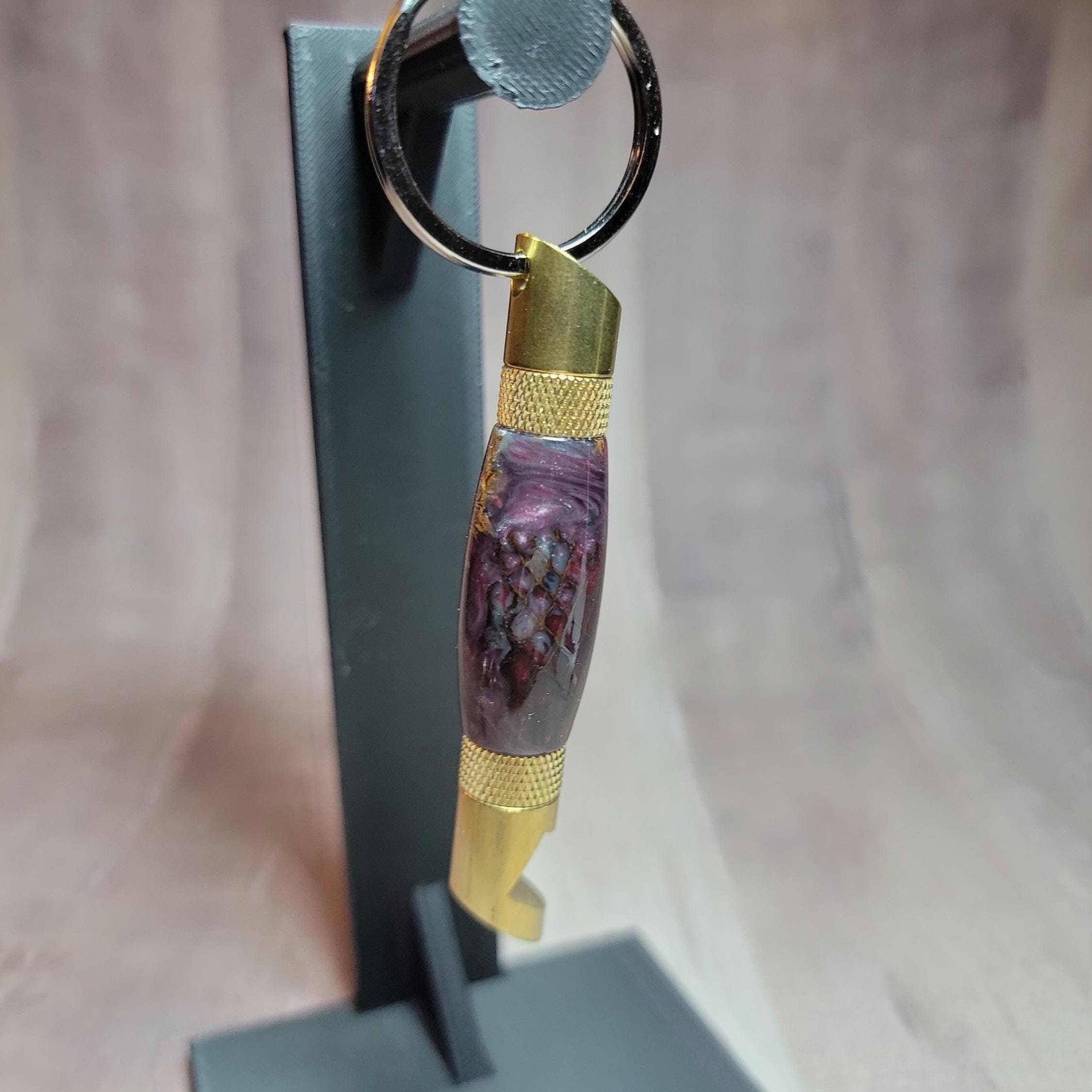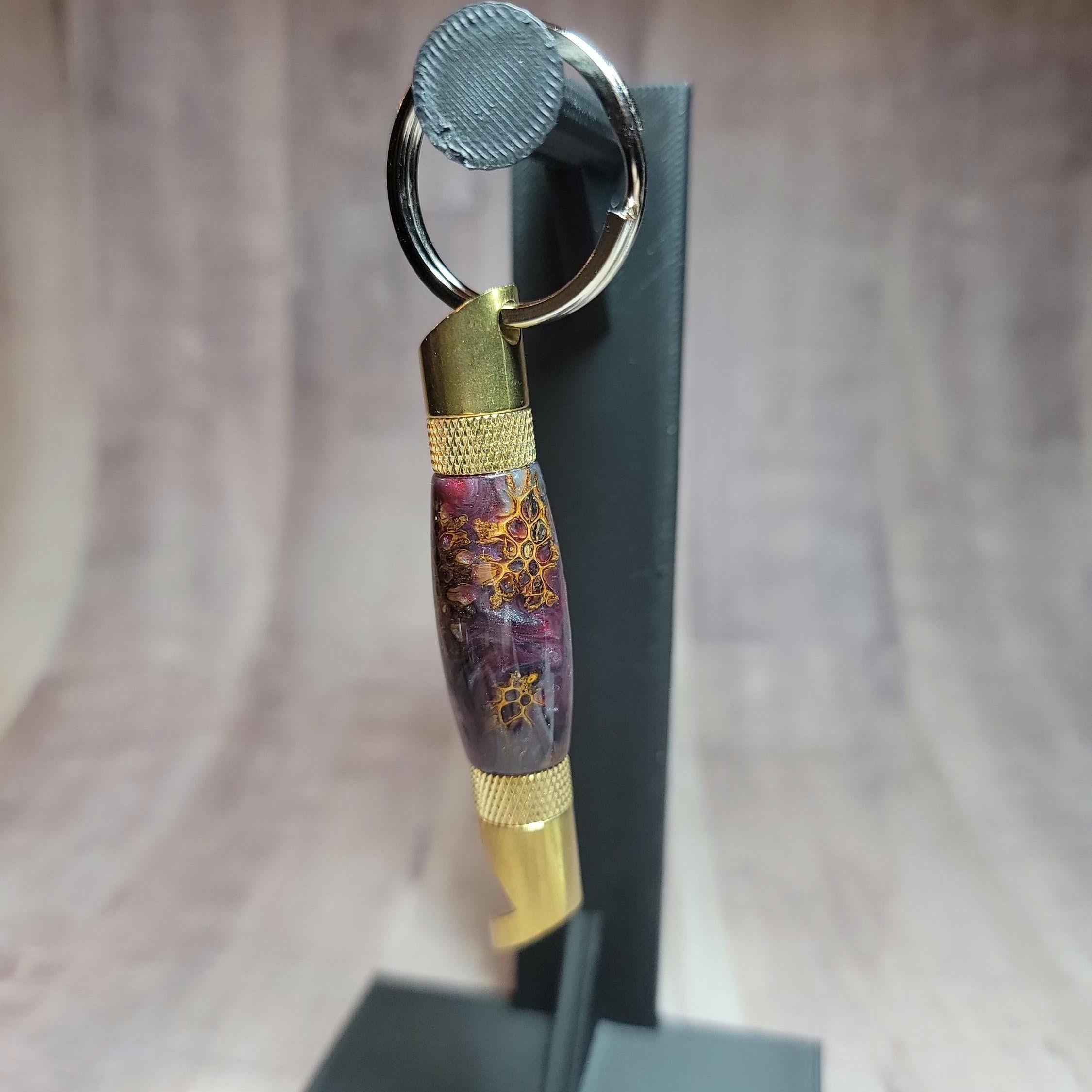 This bottle opener was hand turned in our Metro Detroit workshop from a multicolored acrylic mixed with sweetgum pods. It features a keychain handle to carry it with you everywhere.