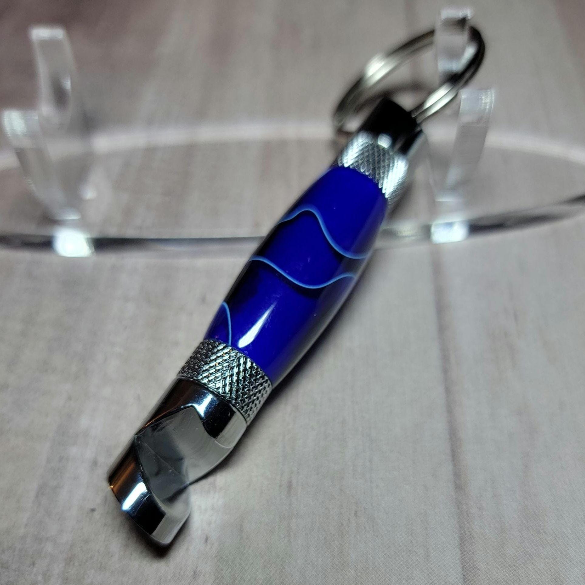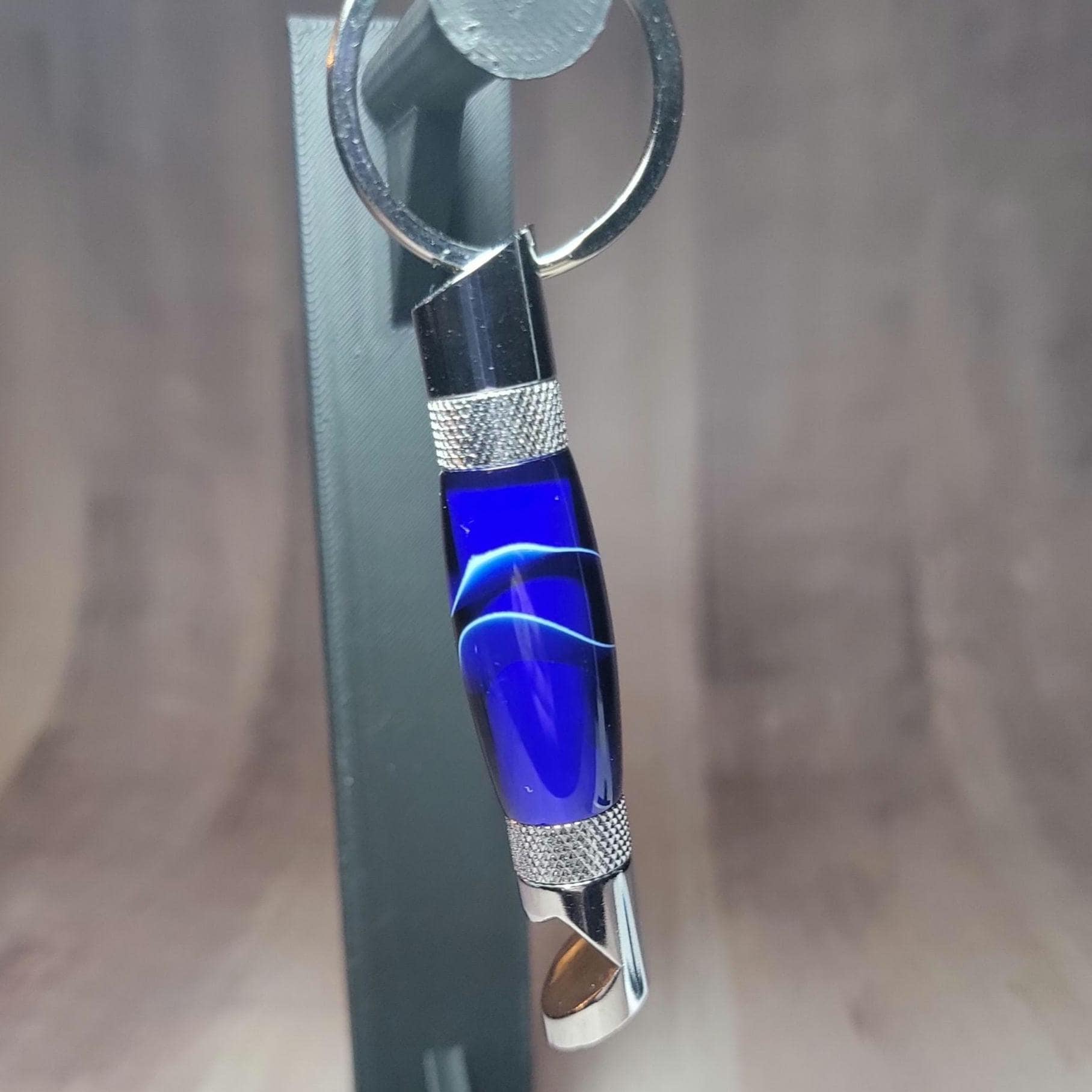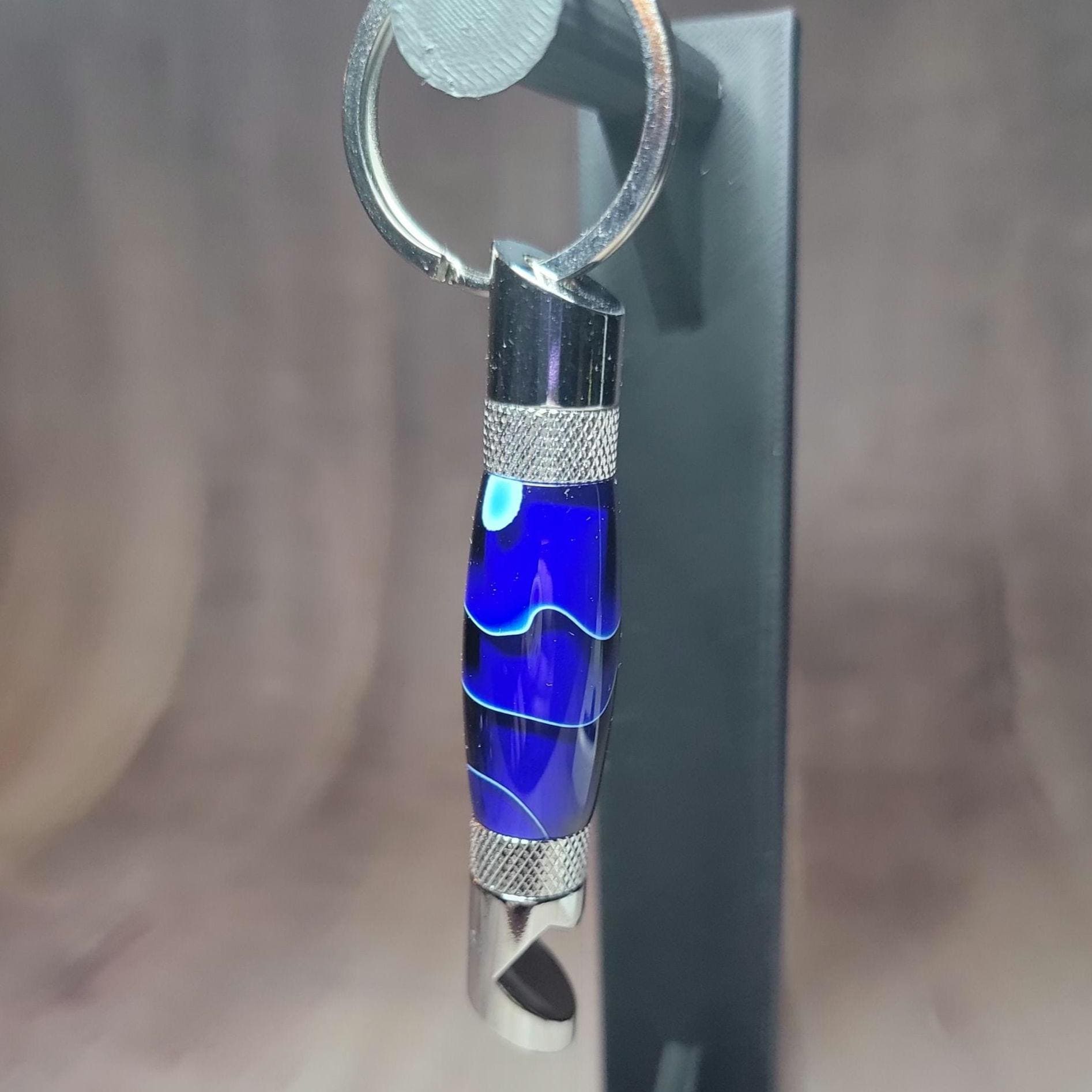 Bottle opener, bright blue. Hand turned keychain bottle opener