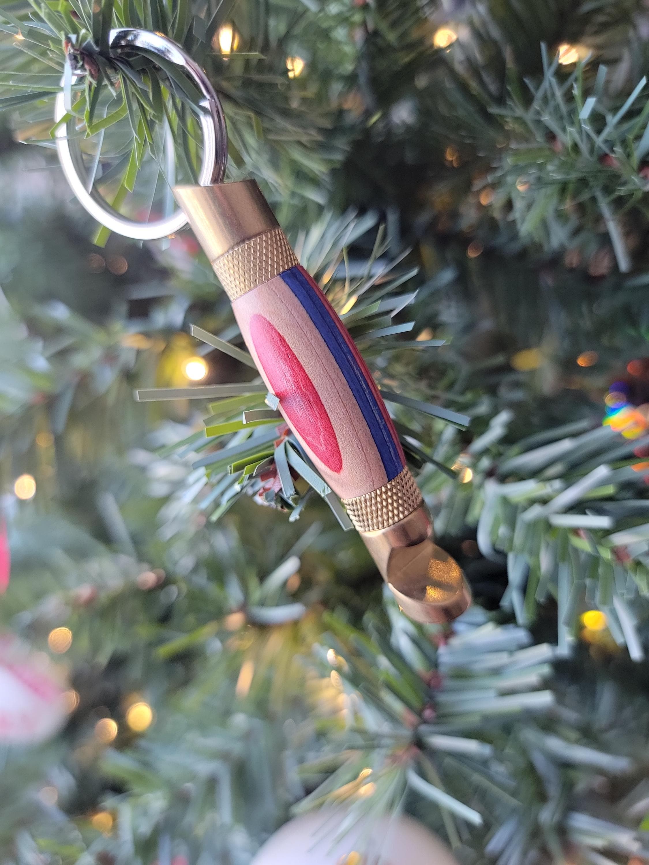 This bottle opener was hand turned in our Metro Detroit workshop from dyed wood. It features a keychain handle to carry it with you everywhere.