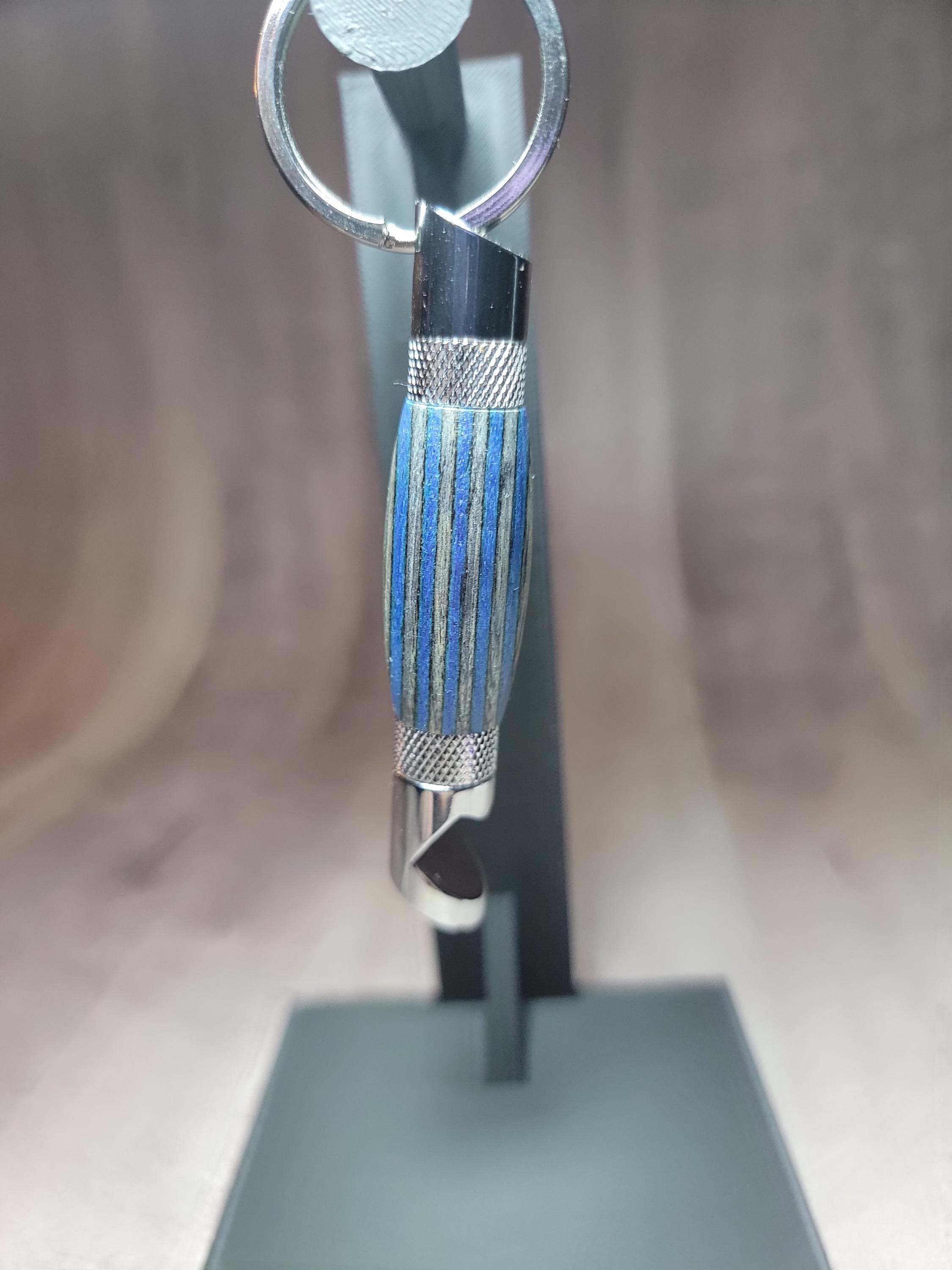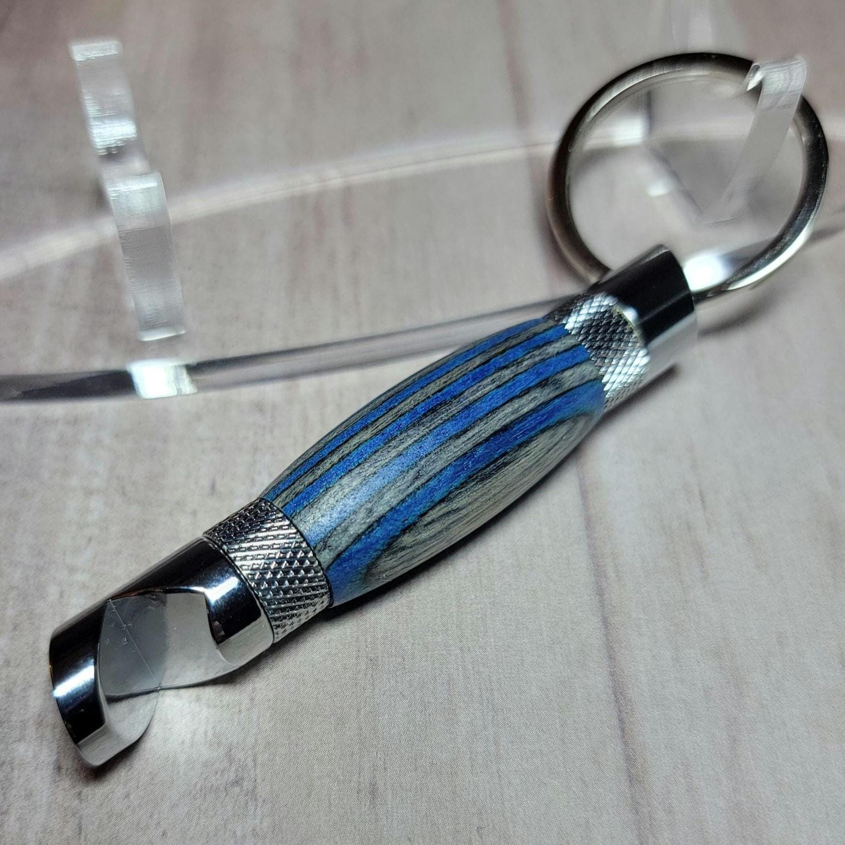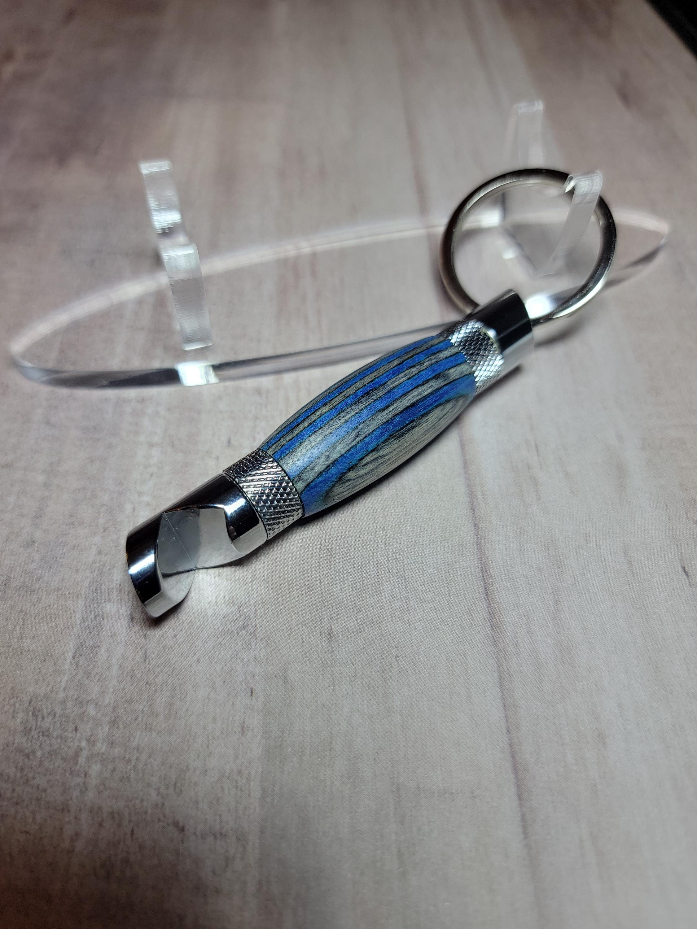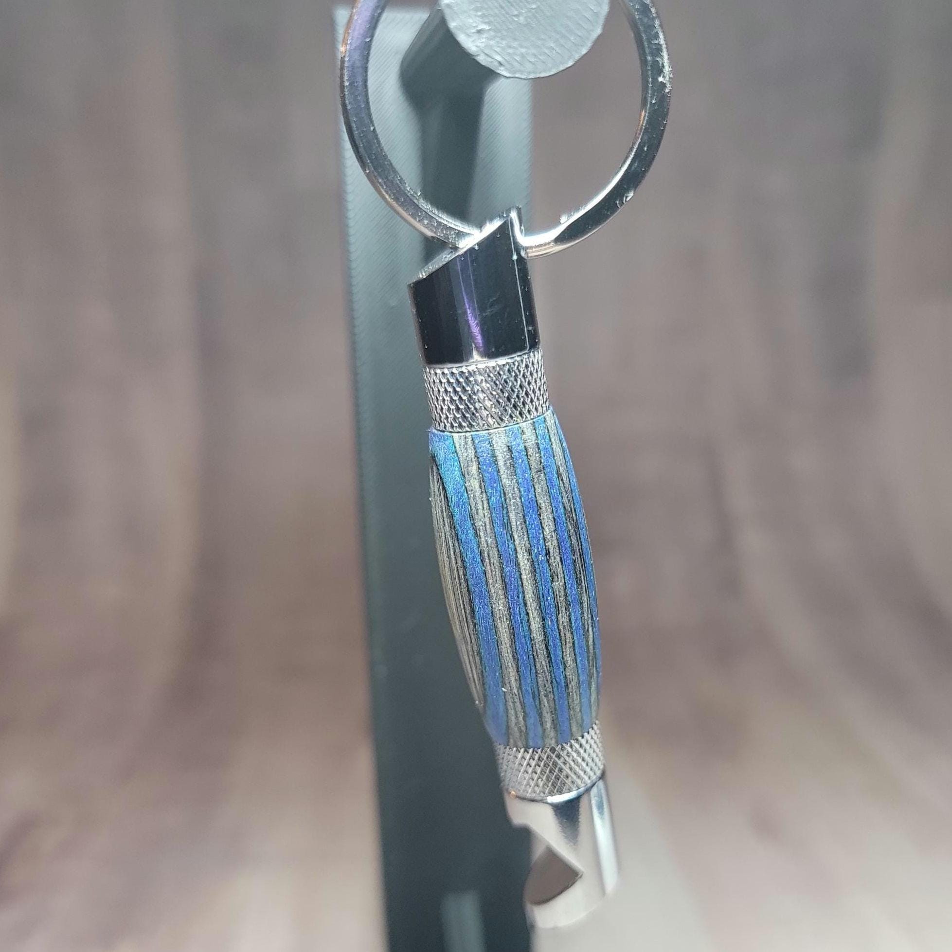 Bottle opener, wood- blue. Hand turned keychain bottle opener