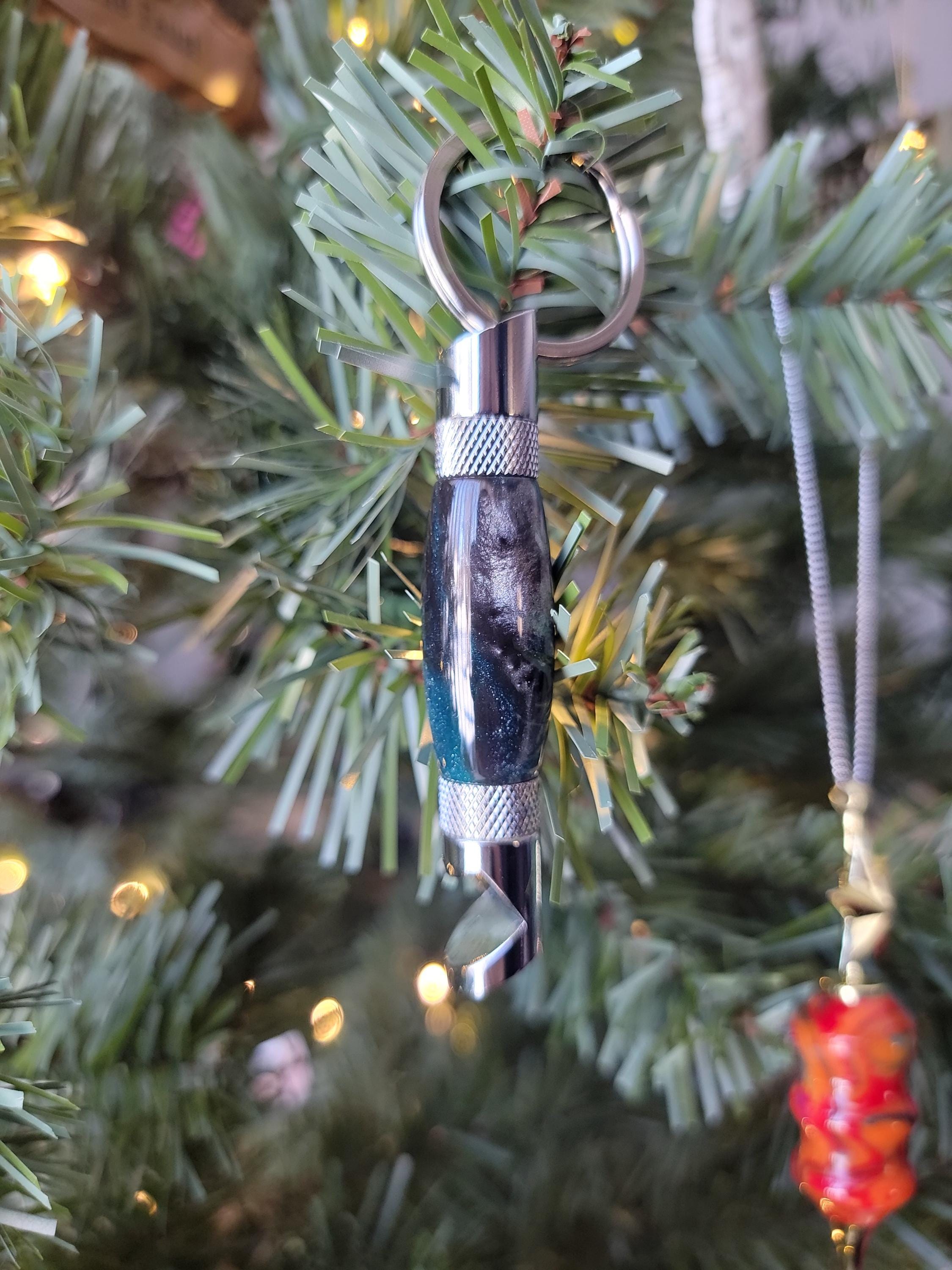 This bottle opener was hand turned in our Metro Detroit workshop from a multicolored acrylic. It features a keychain handle to carry it with you everywhere.