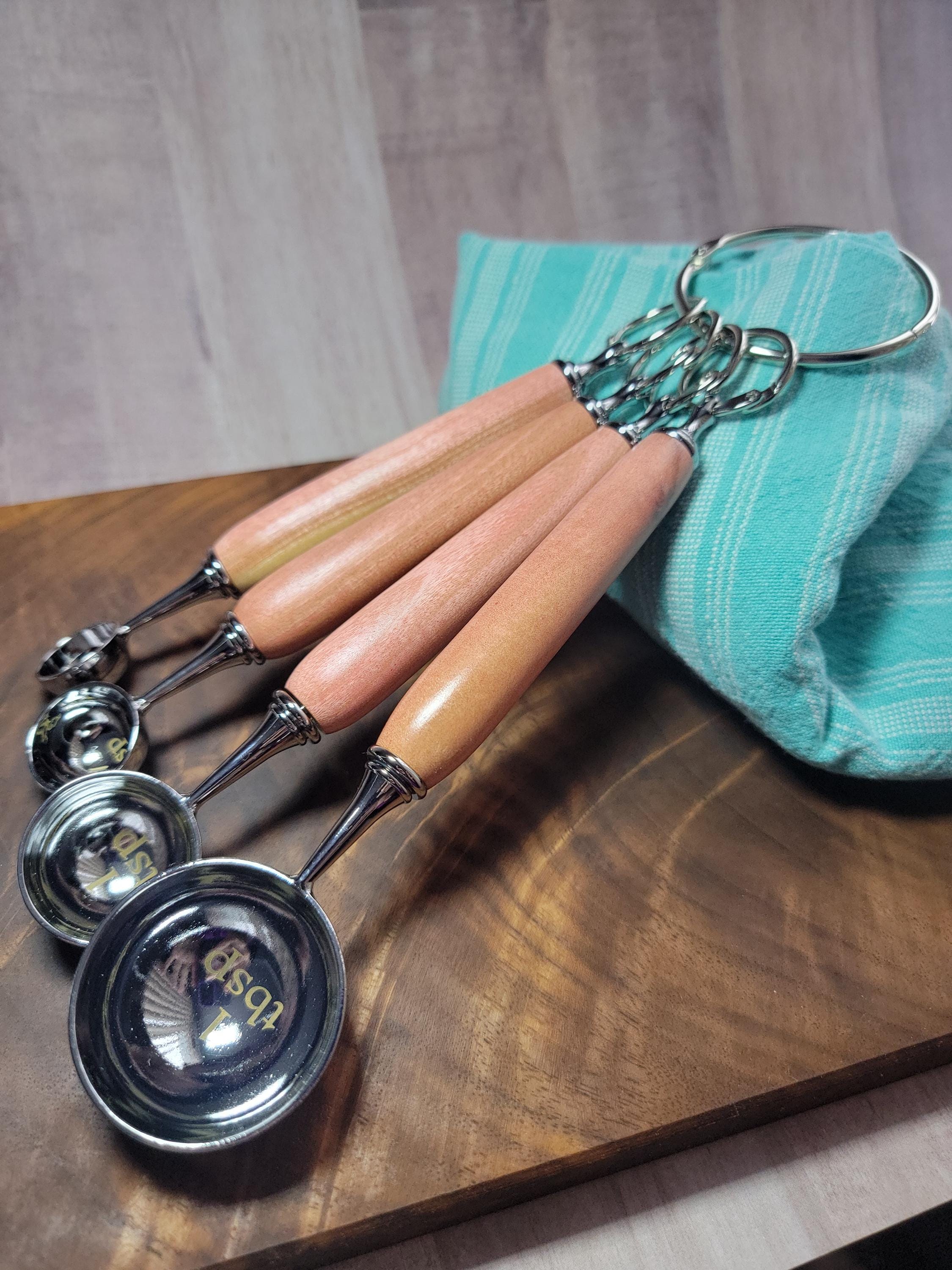 These measuring cups were hand turned out of a beautiful piece of pink ivory wood. This set features 1/4 tsp, 1/2 tsp, 1 teaspoon, and a 1 Tablespoon measure. Each spoon is engraved on the inside with the size and are made from stainless steel.