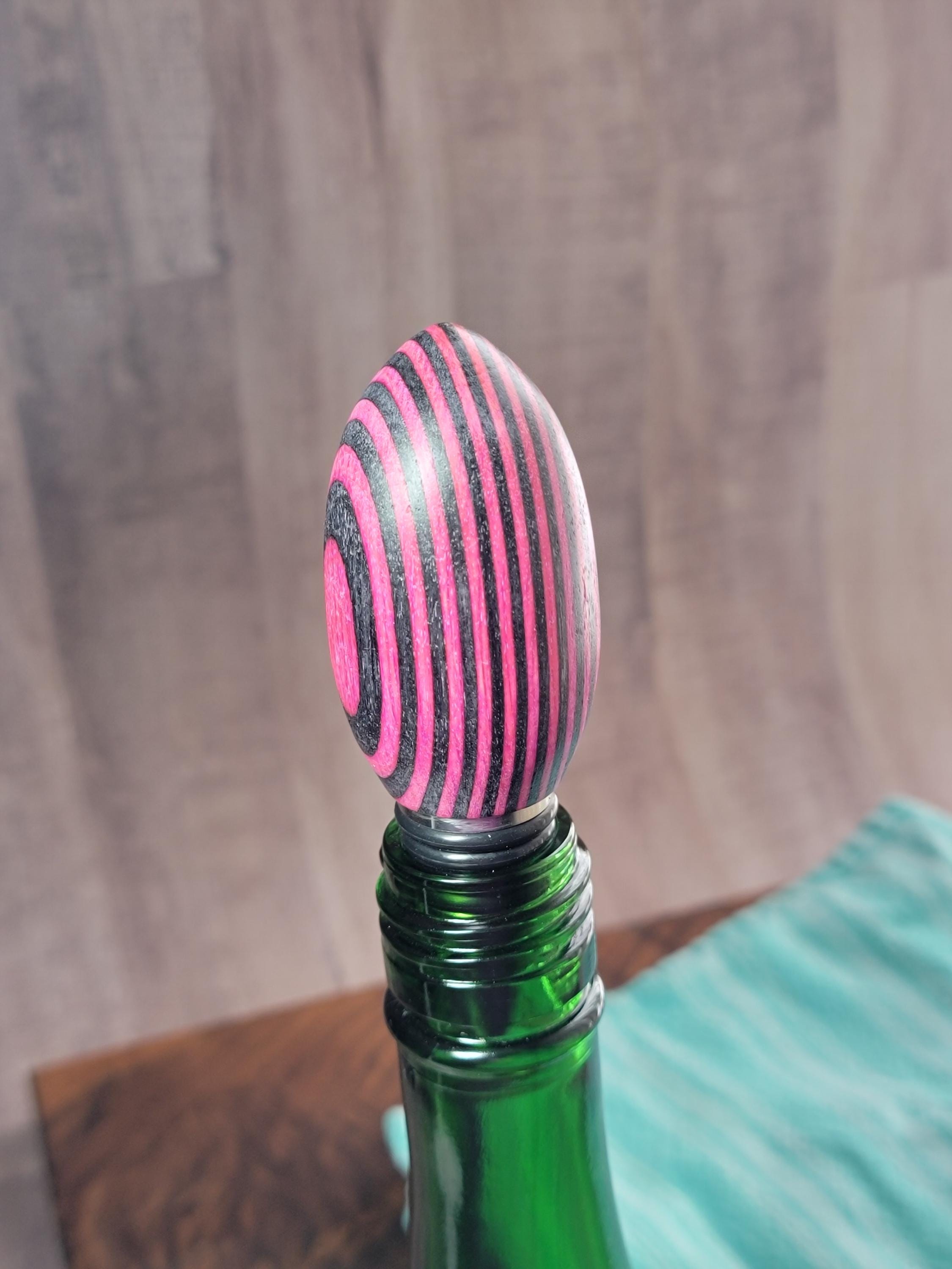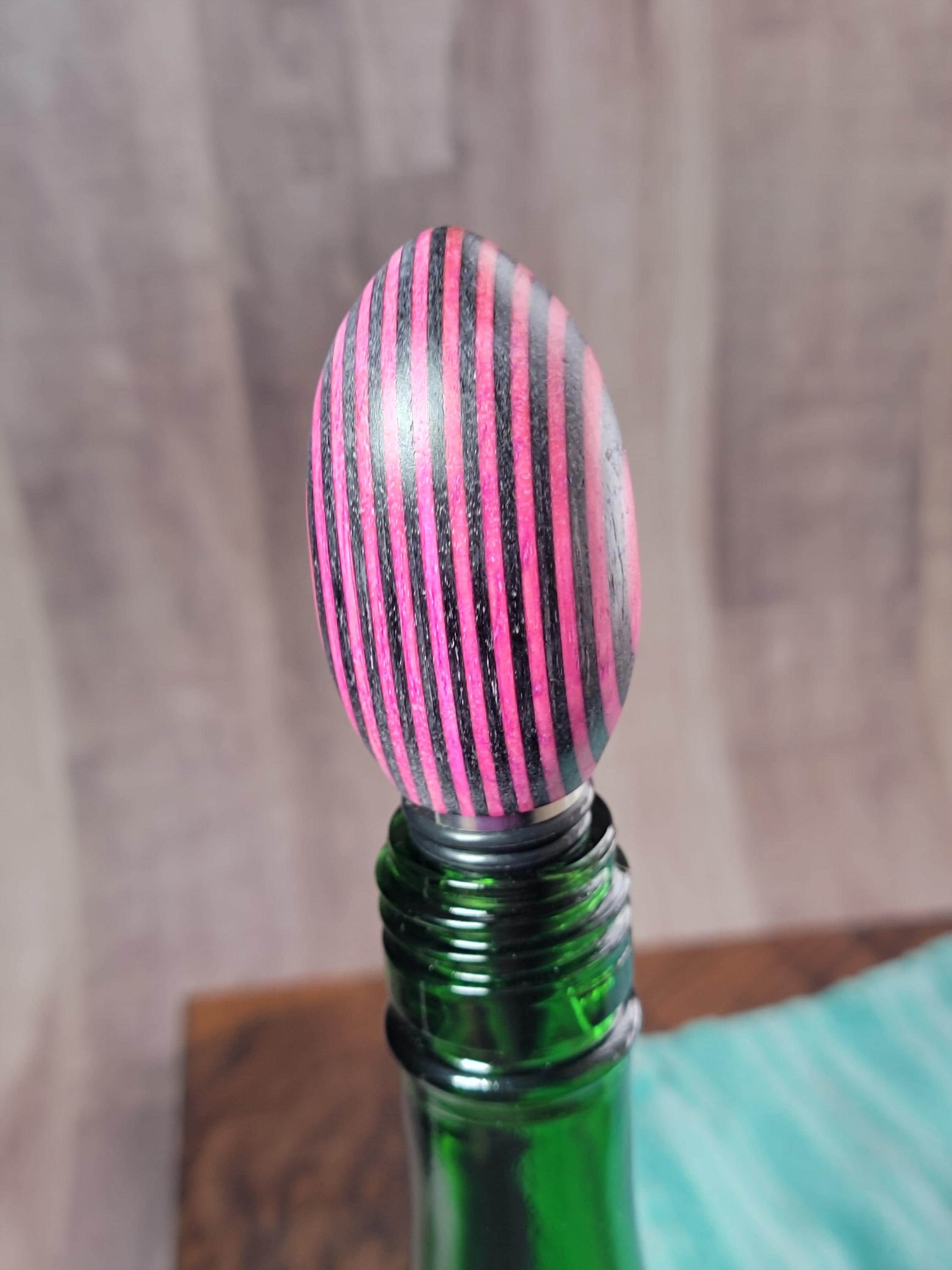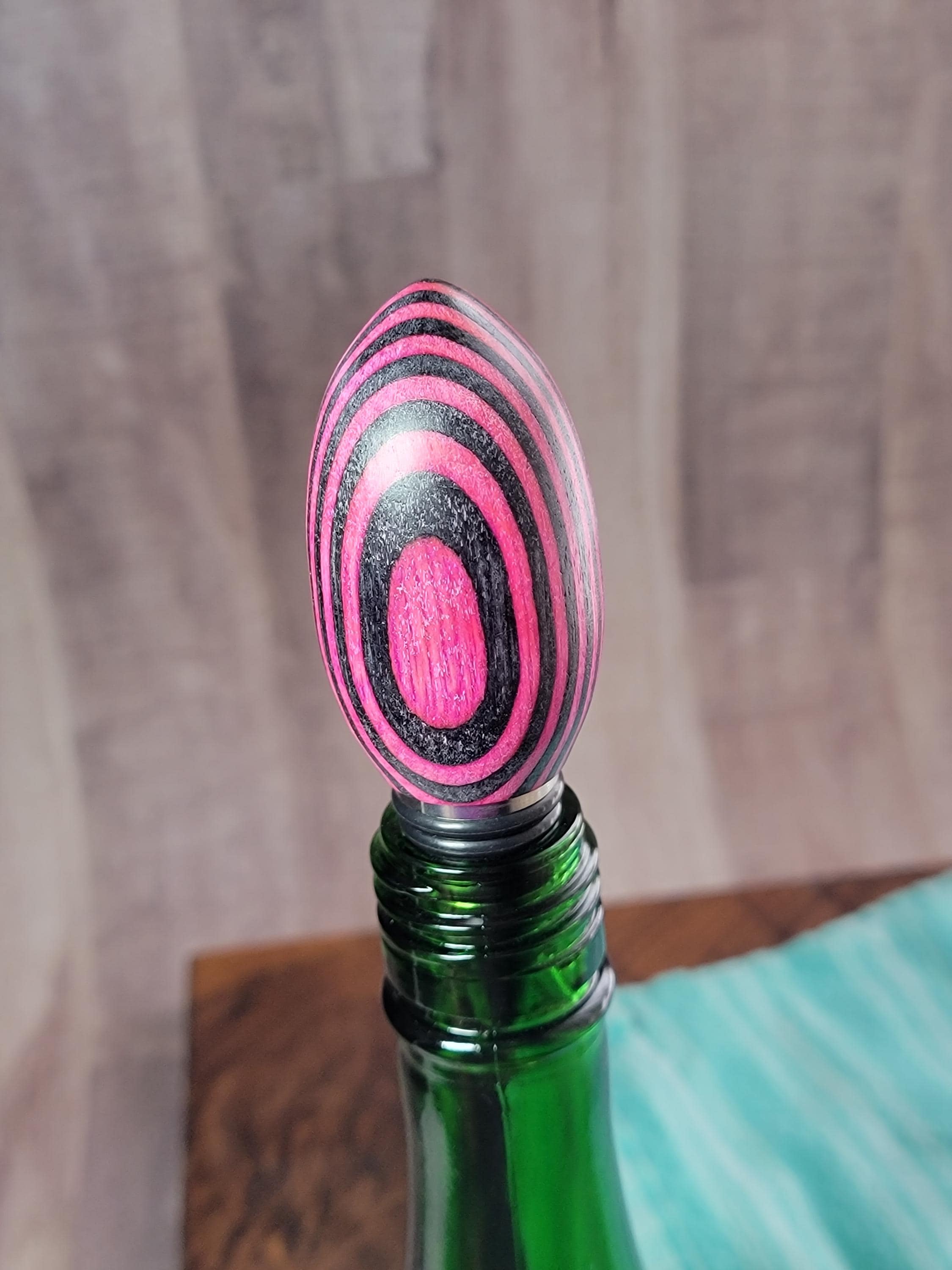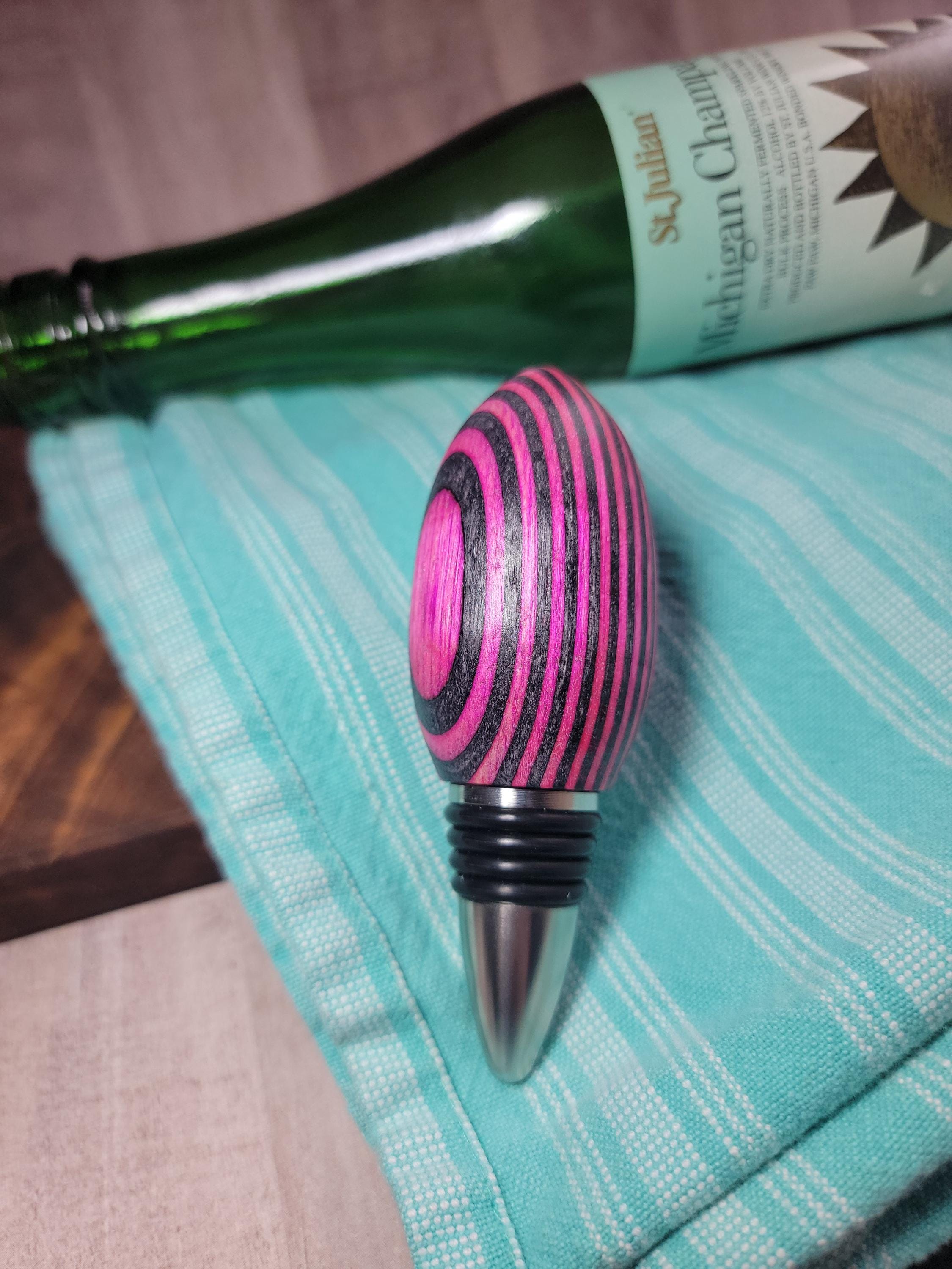 Our bottle stoppers are hand turned on a lathe in our small Metro Detroit family workshop. The stopper portions are made from stainless steel with rubber o-rings. The stopper can be unscrewed from the wood portion for easy cleaning.