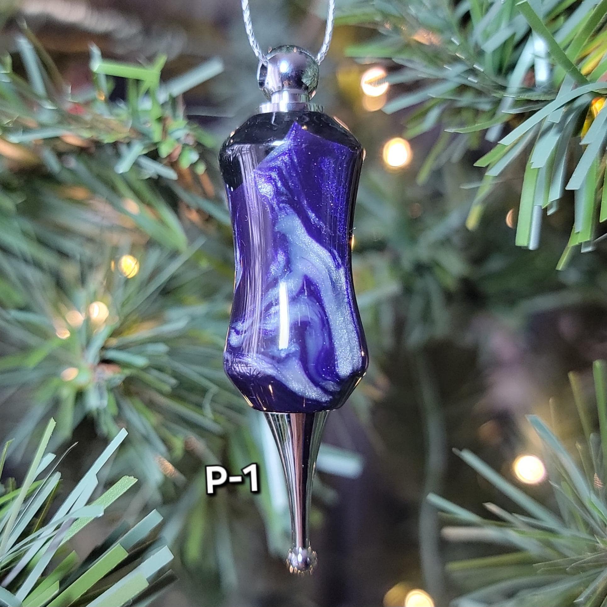 When we make our various items on our lathes, we are often left with a small piece of acrylic leftover. We have now turned those into beautiful ornaments for your tree. Ornaments measure an average of 2-3 inches in total length, and around 1 inch in width.