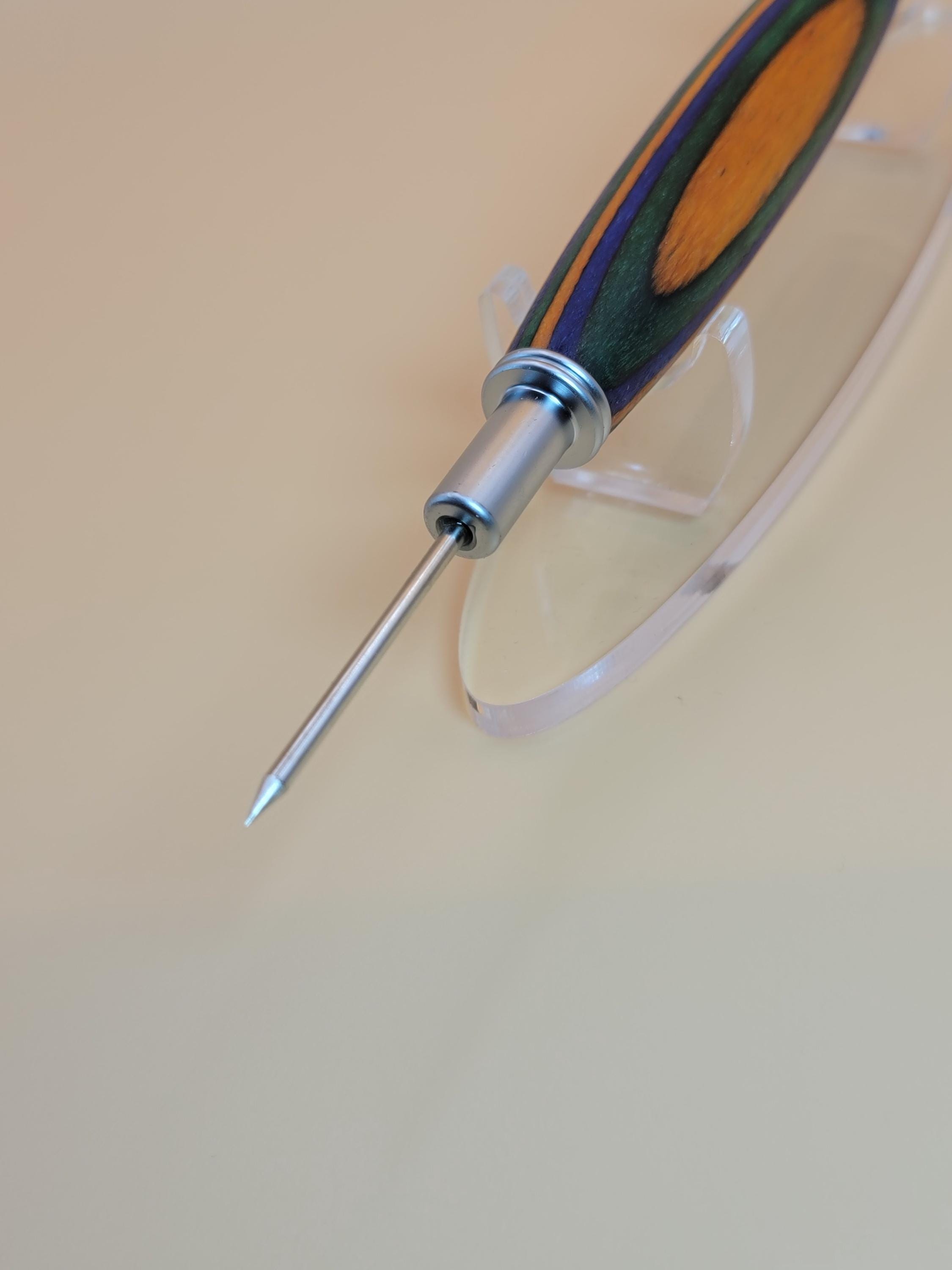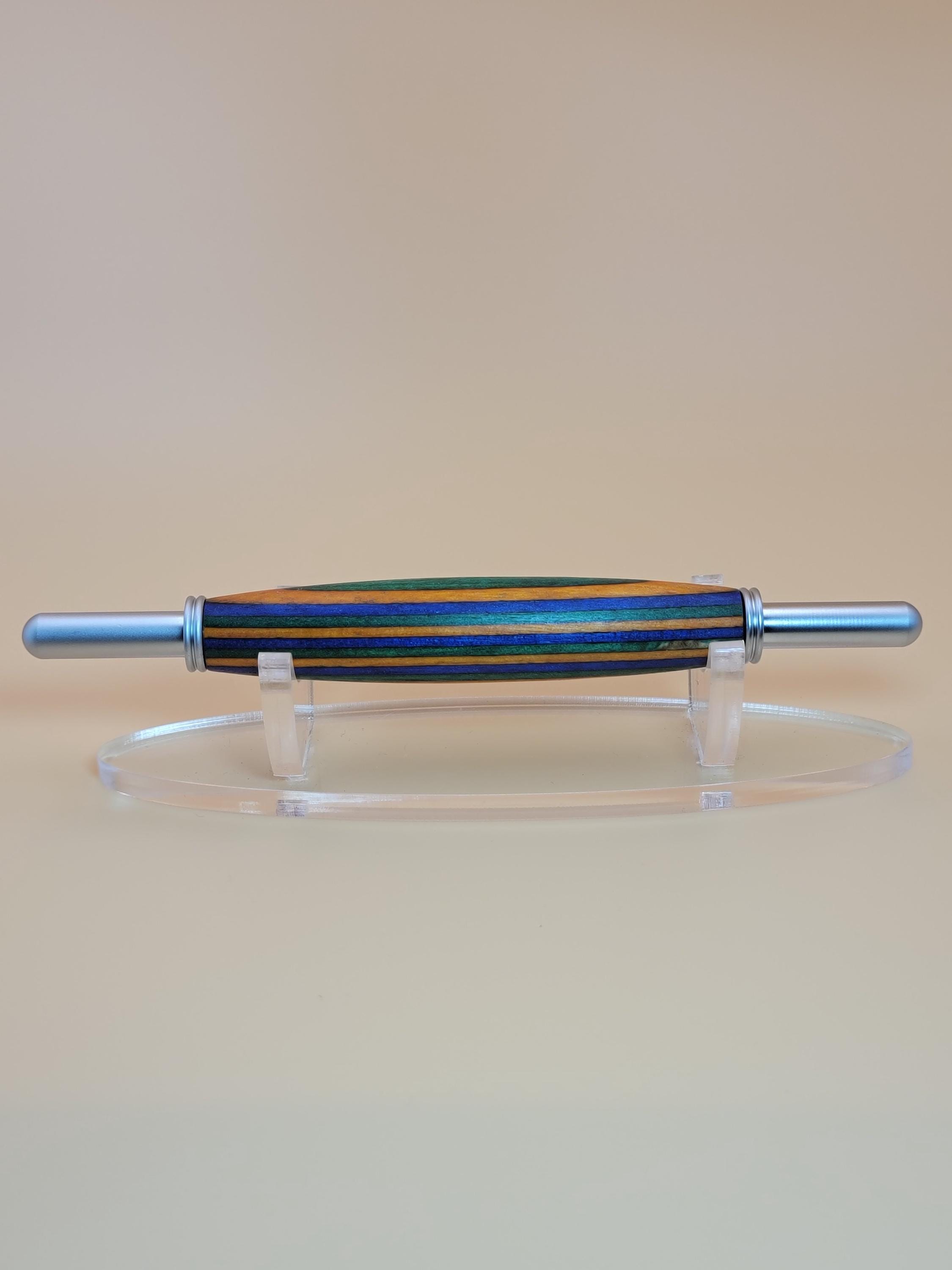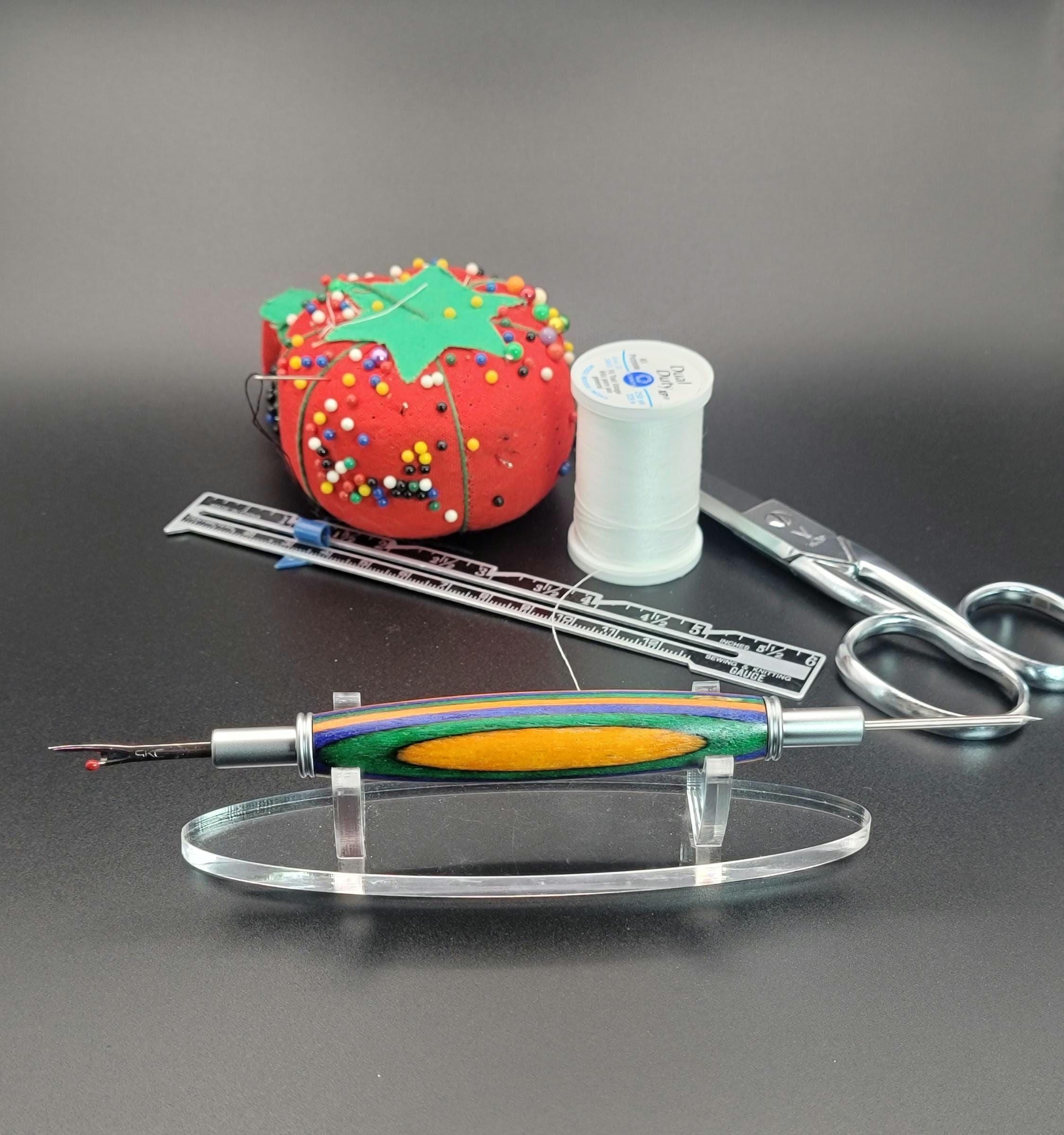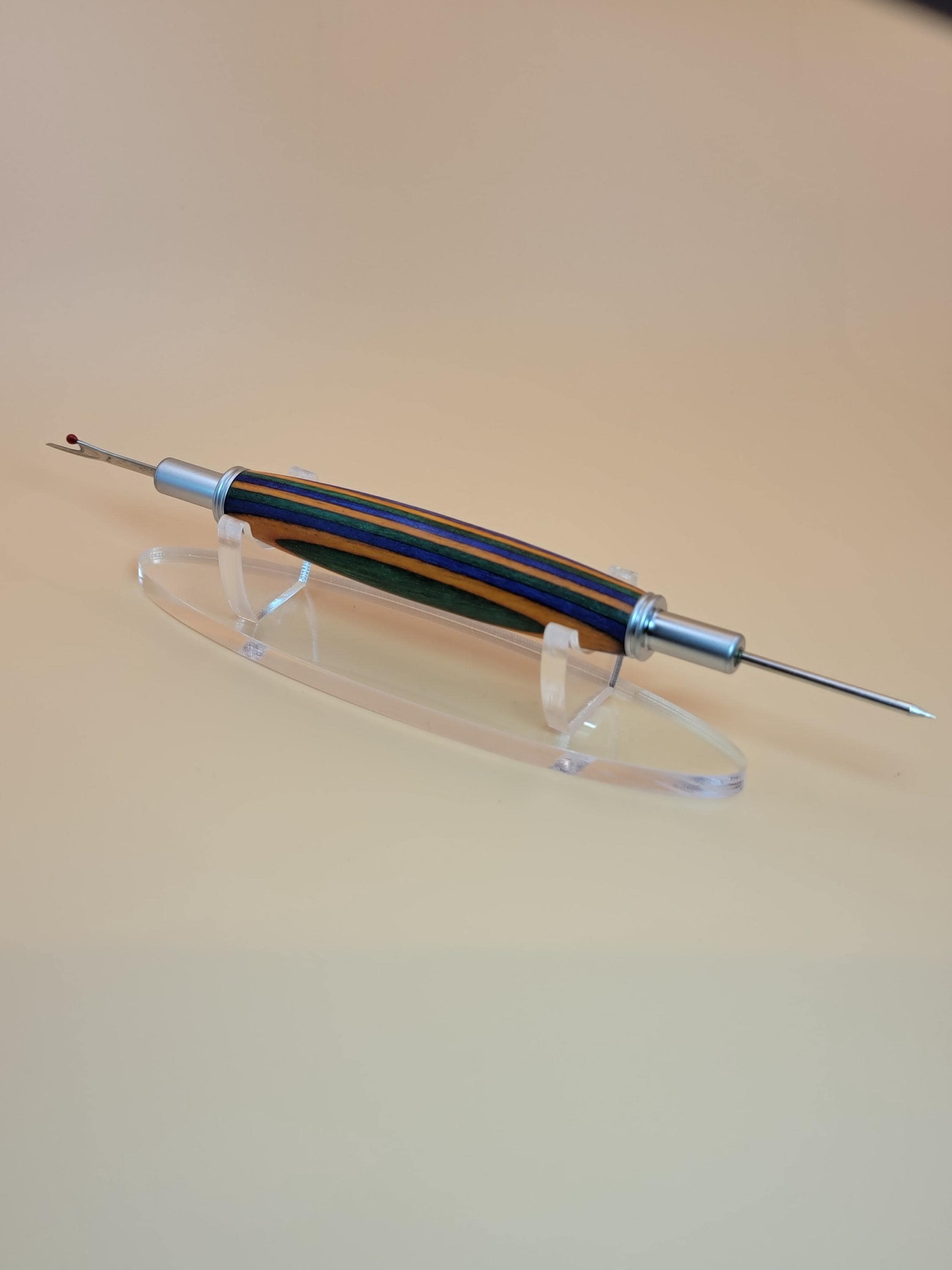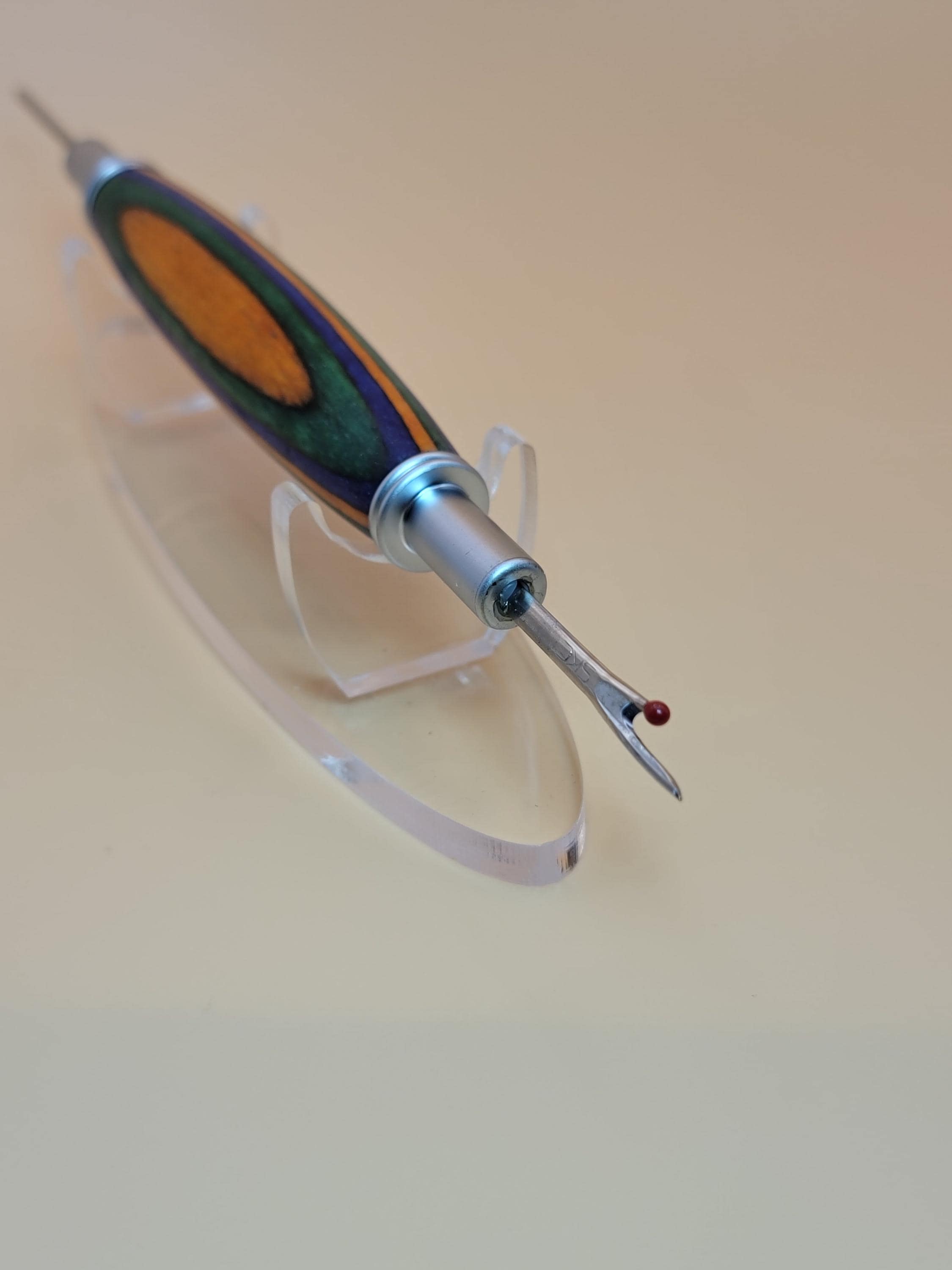This sewing and quilting tool was hand turned in our Metro Detroit workshop from a fun stacked and dyed blue, green & orange wood.