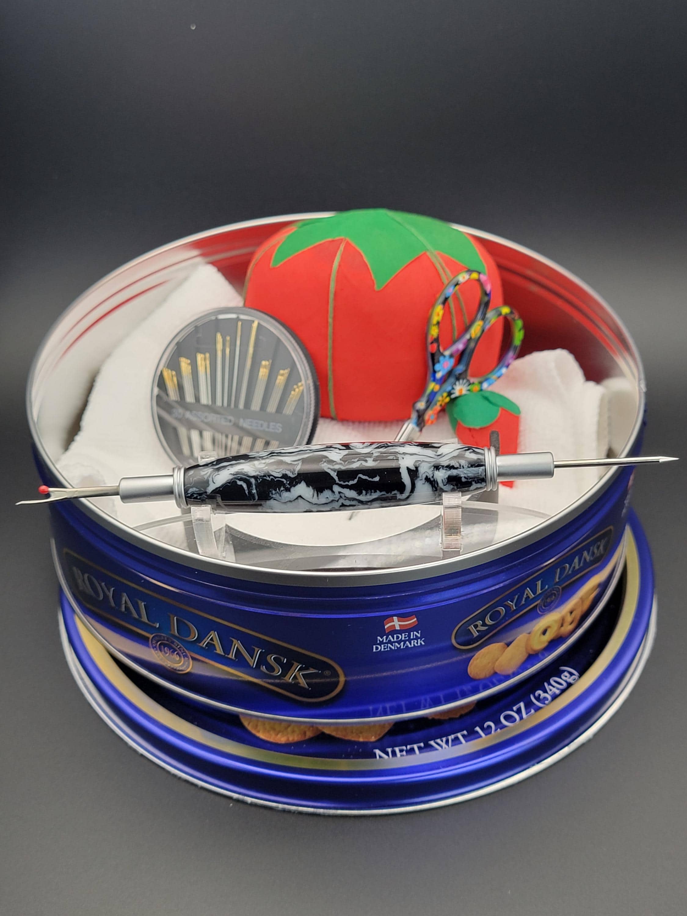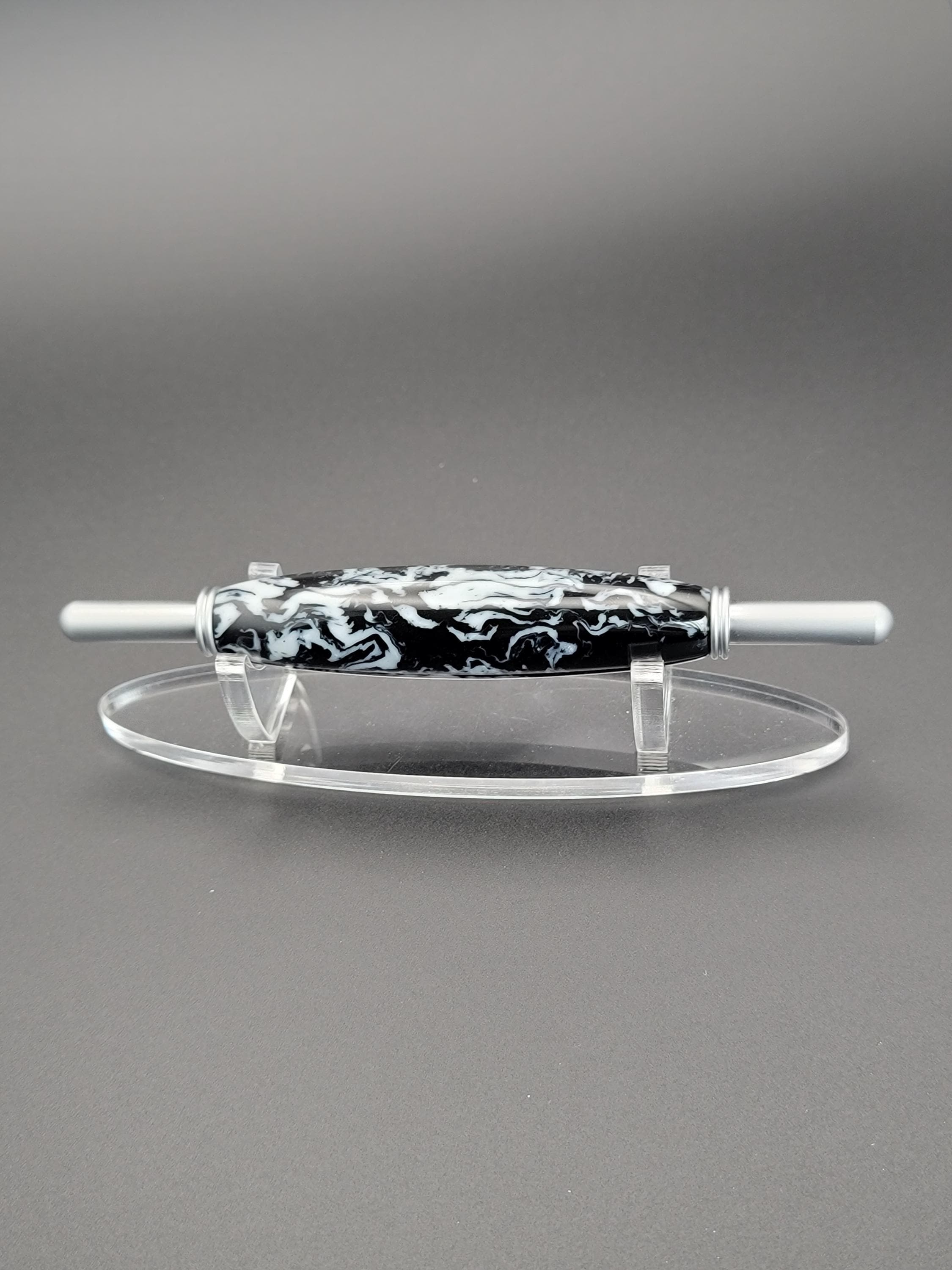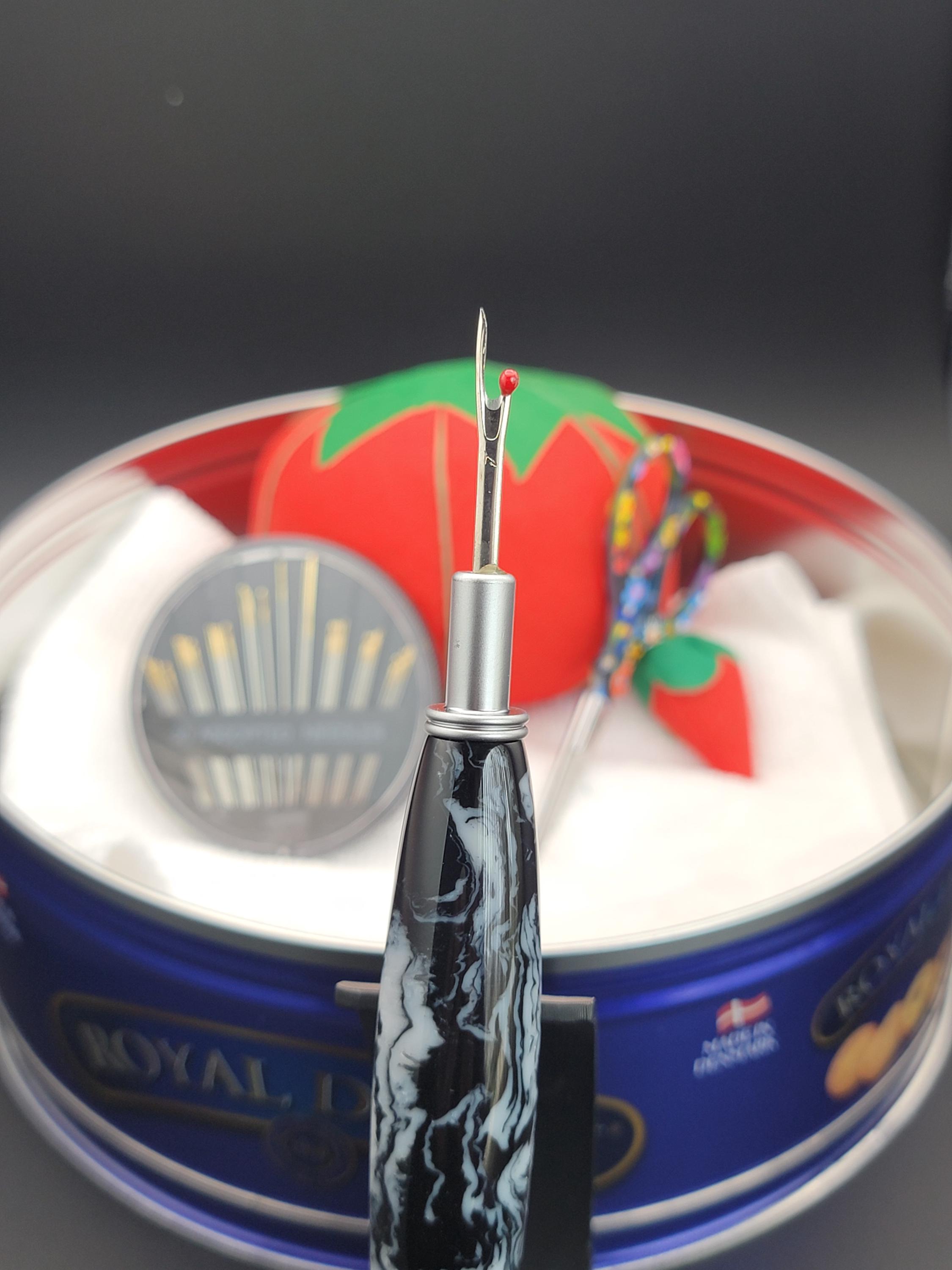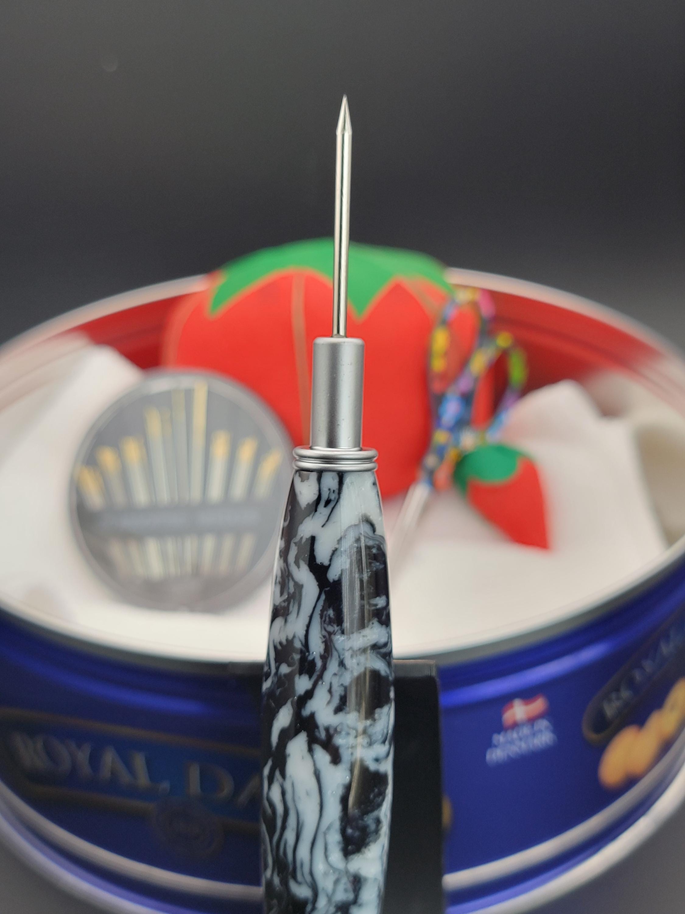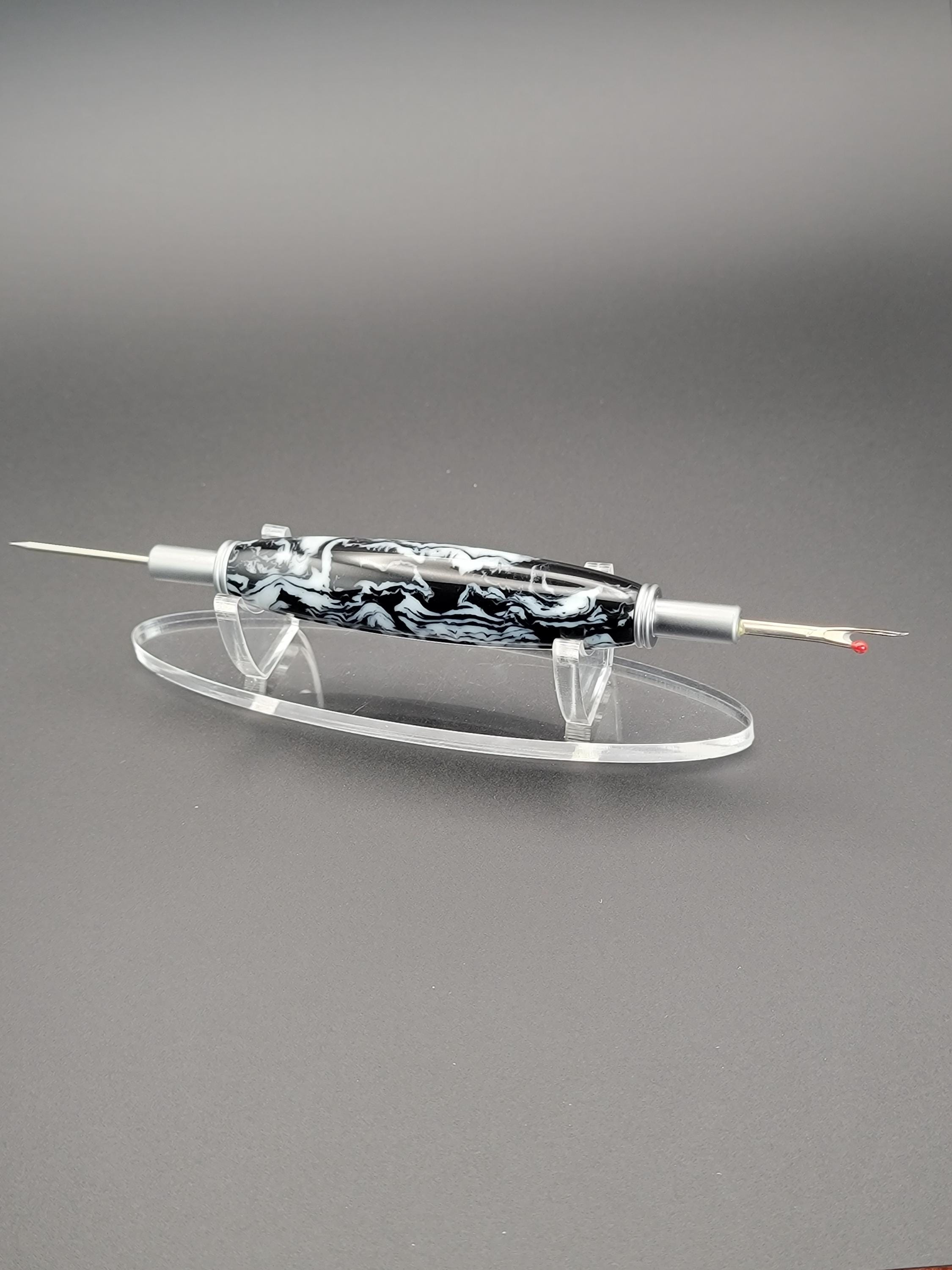 This sewing and quilting tool was hand turned in our Metro Detroit workshop from a black and white acrylic.