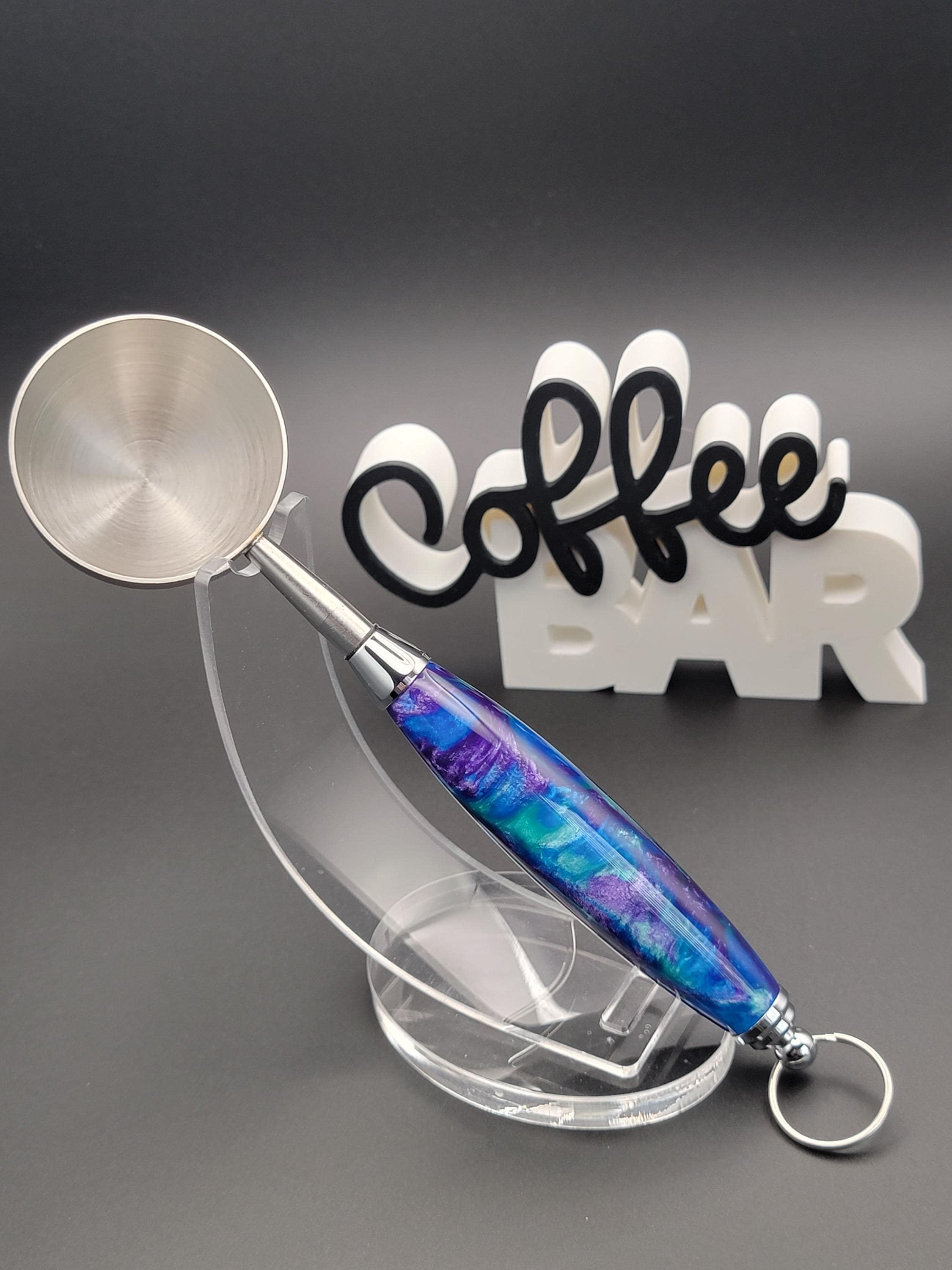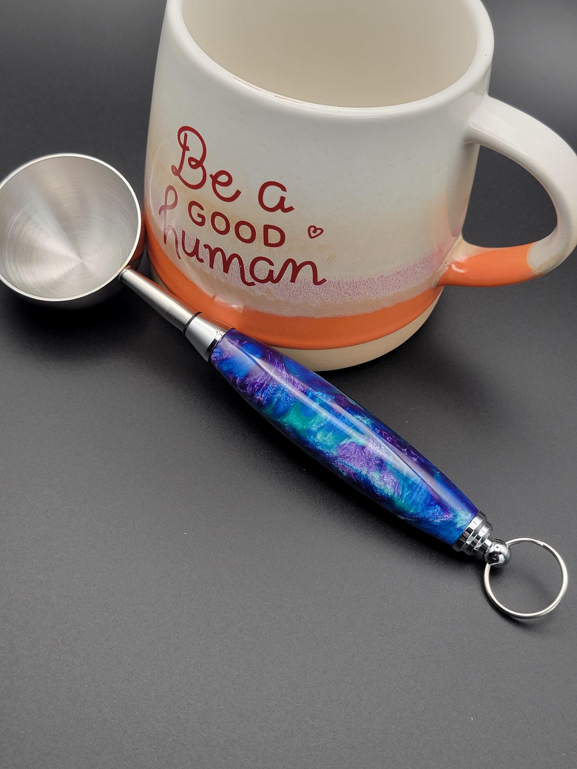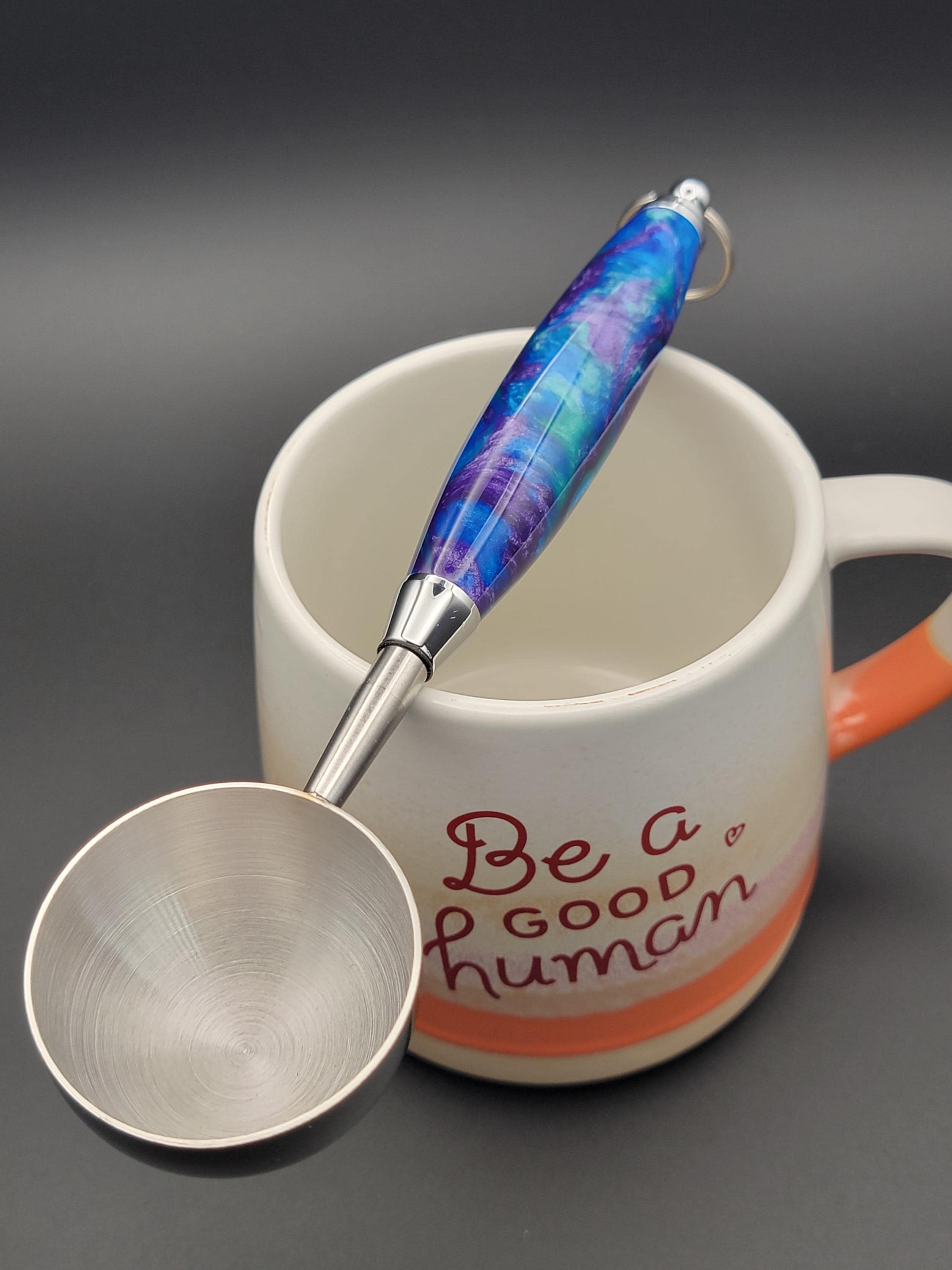 This stunning handmade coffee scoop is made from peacock colors of acrylic.