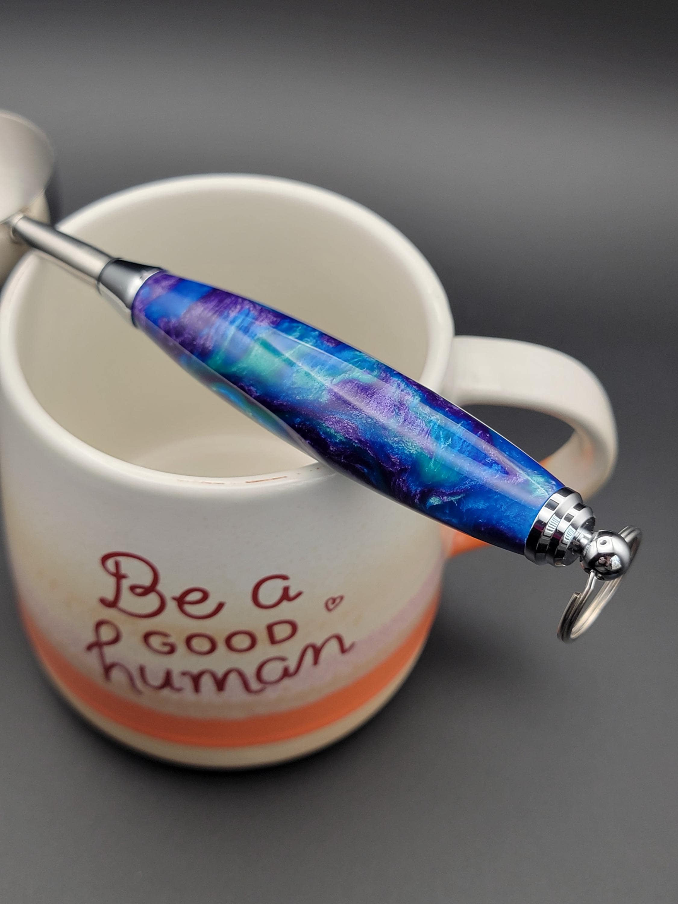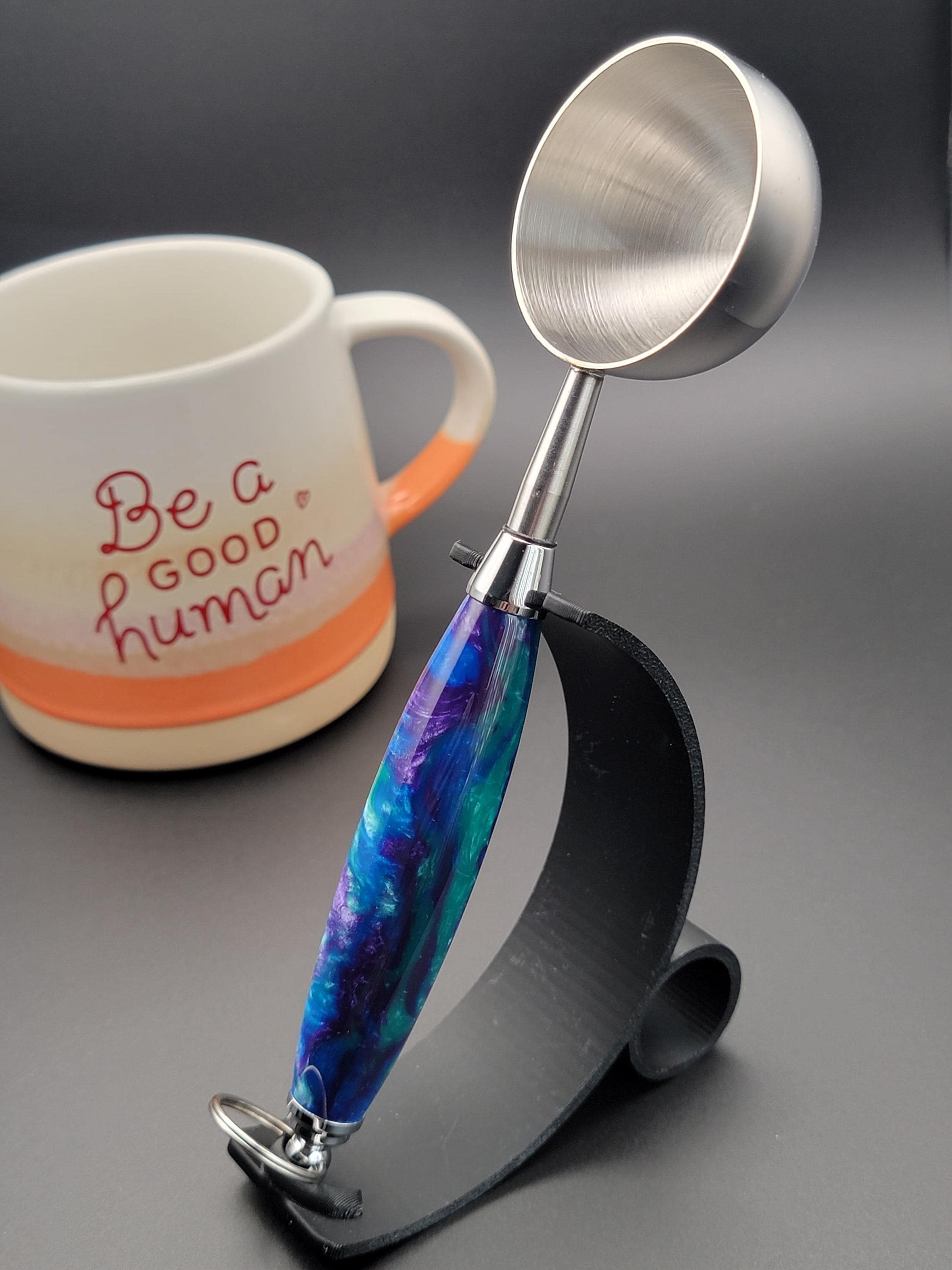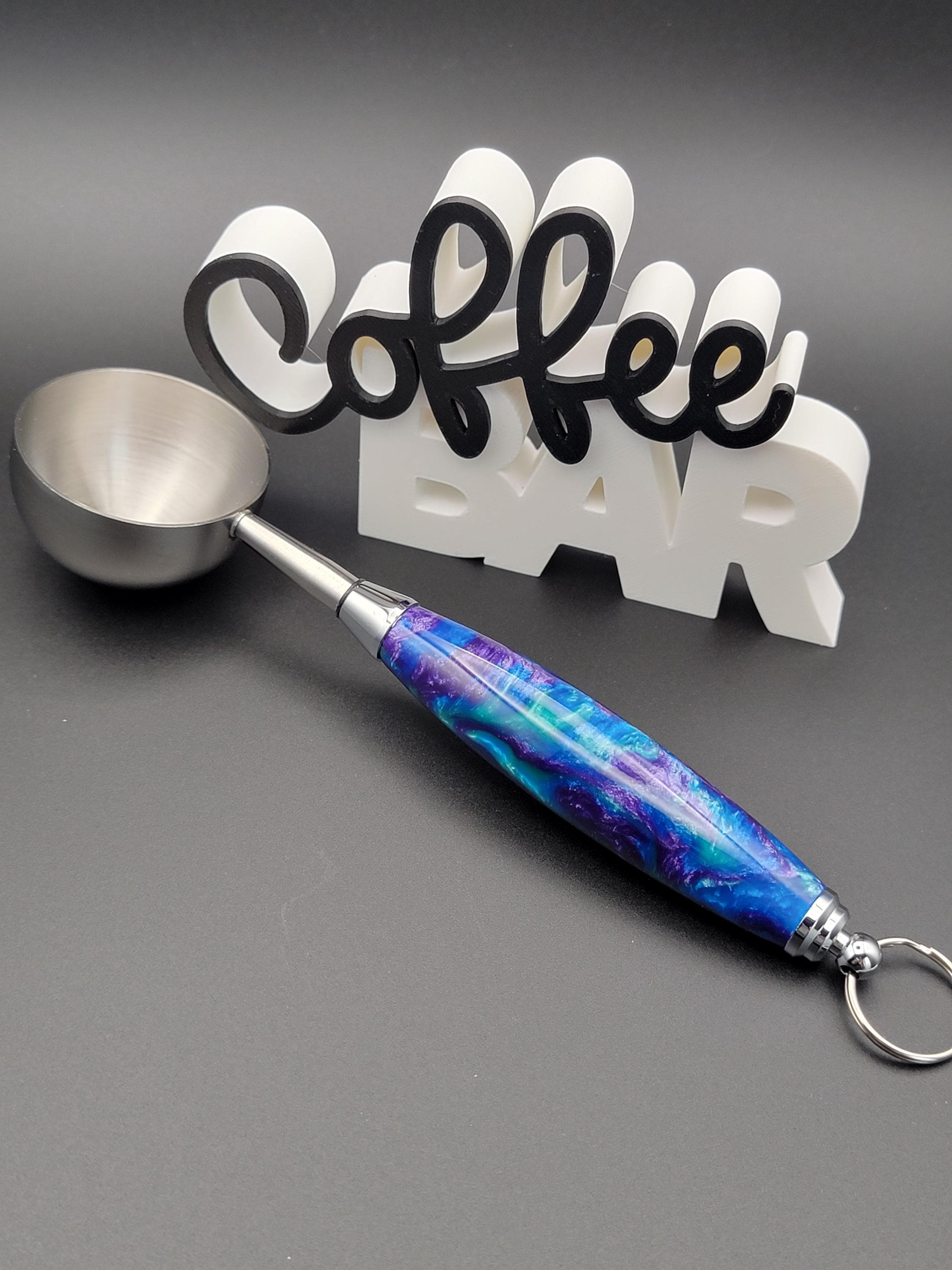 This stunning handmade coffee scoop is made from peacock colors of acrylic.