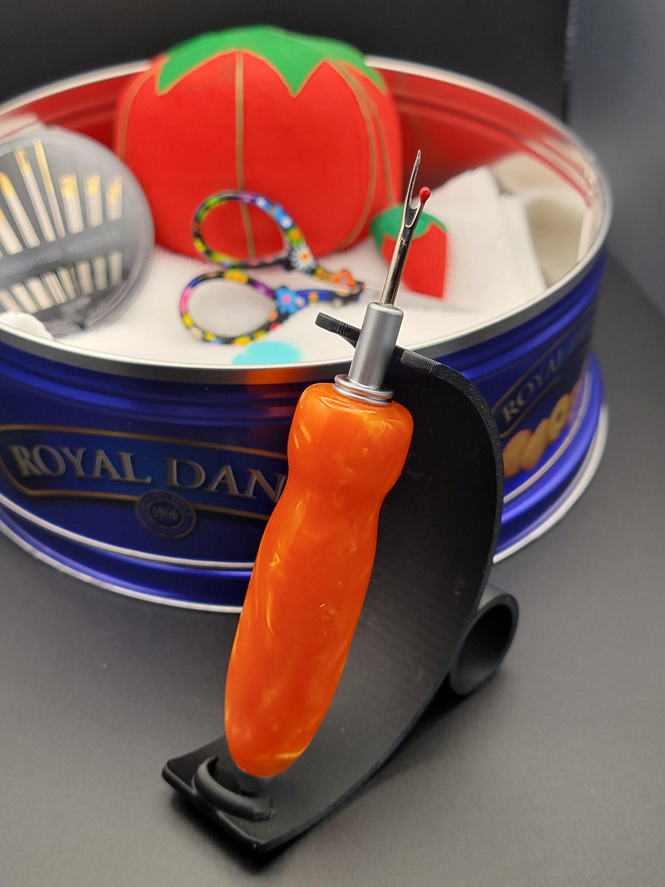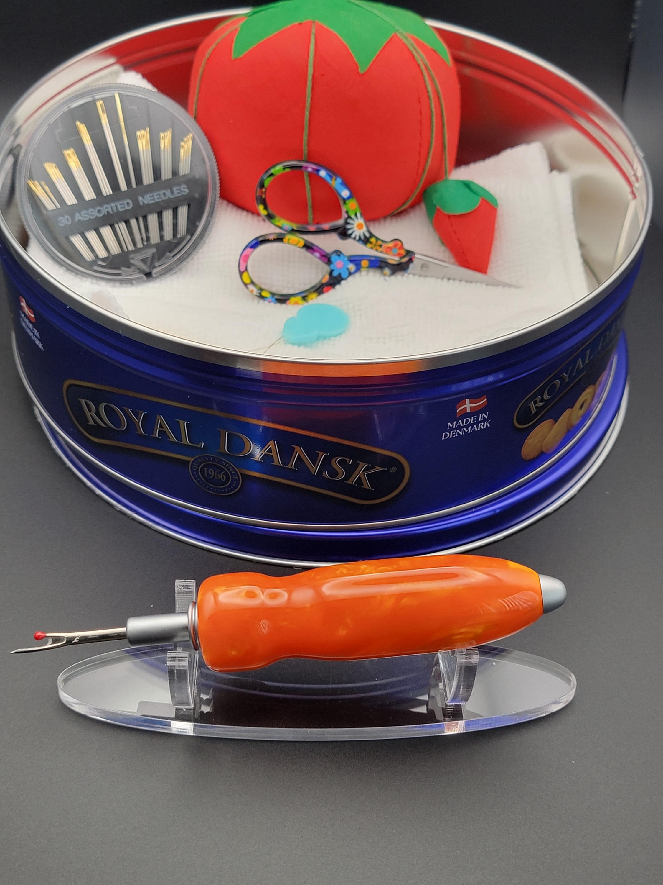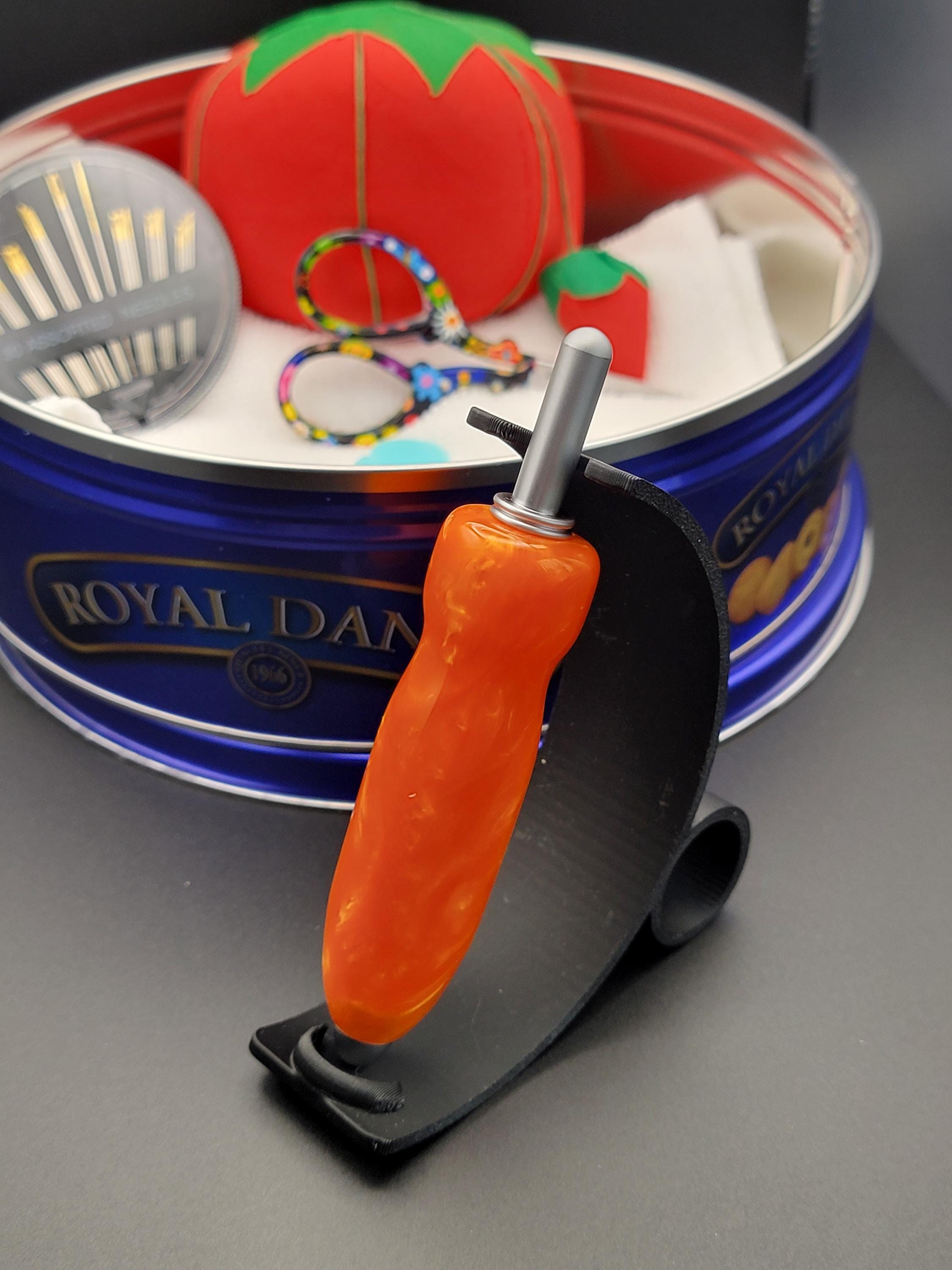 This ergonomic seam ripper was hand turned in our Metro Detroit workshop from a swirly sky orange acrylic.