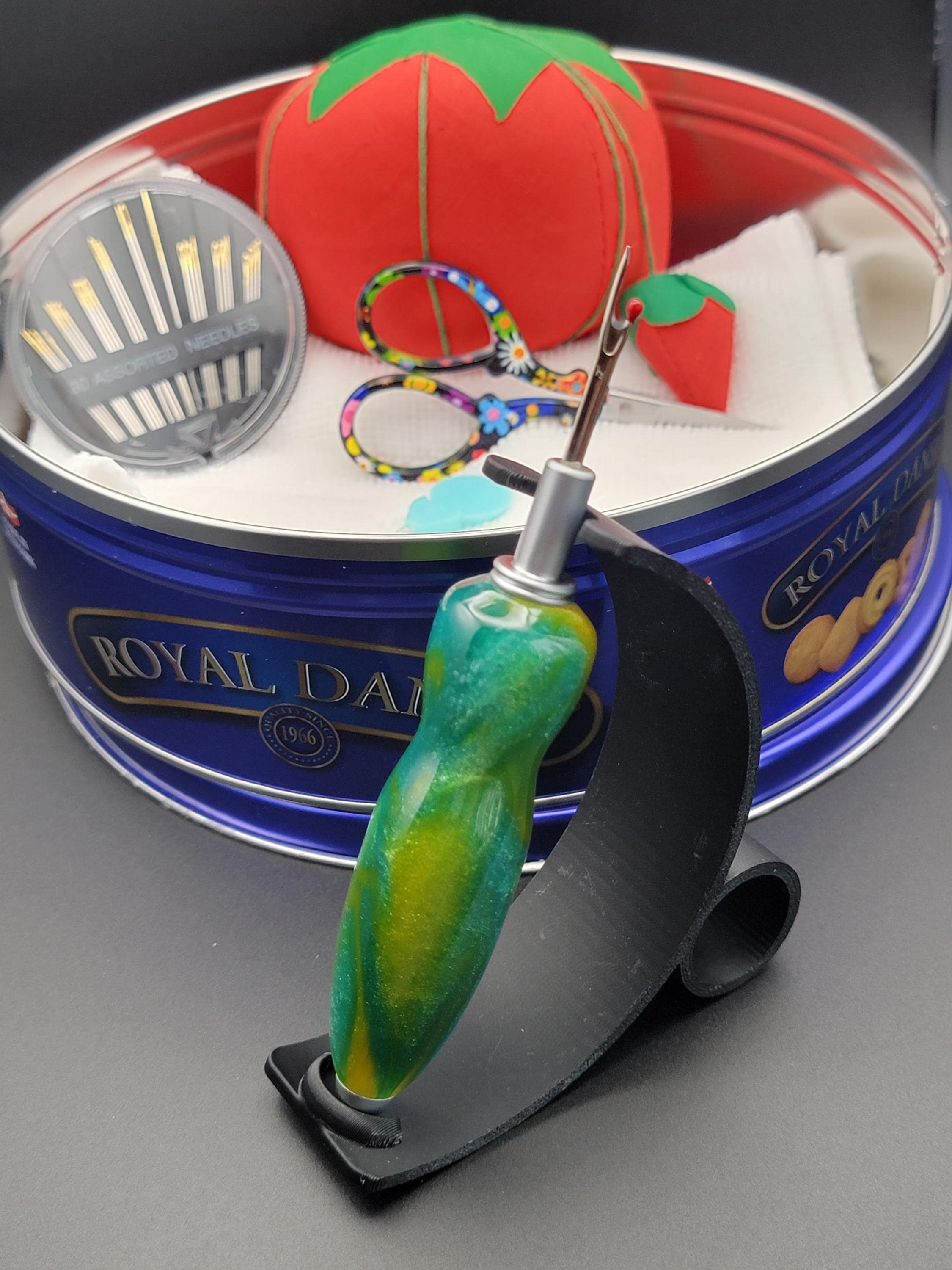 This ergonomic seam ripper was hand turned in our Metro Detroit workshop from a swirly green and yellow acrylic.