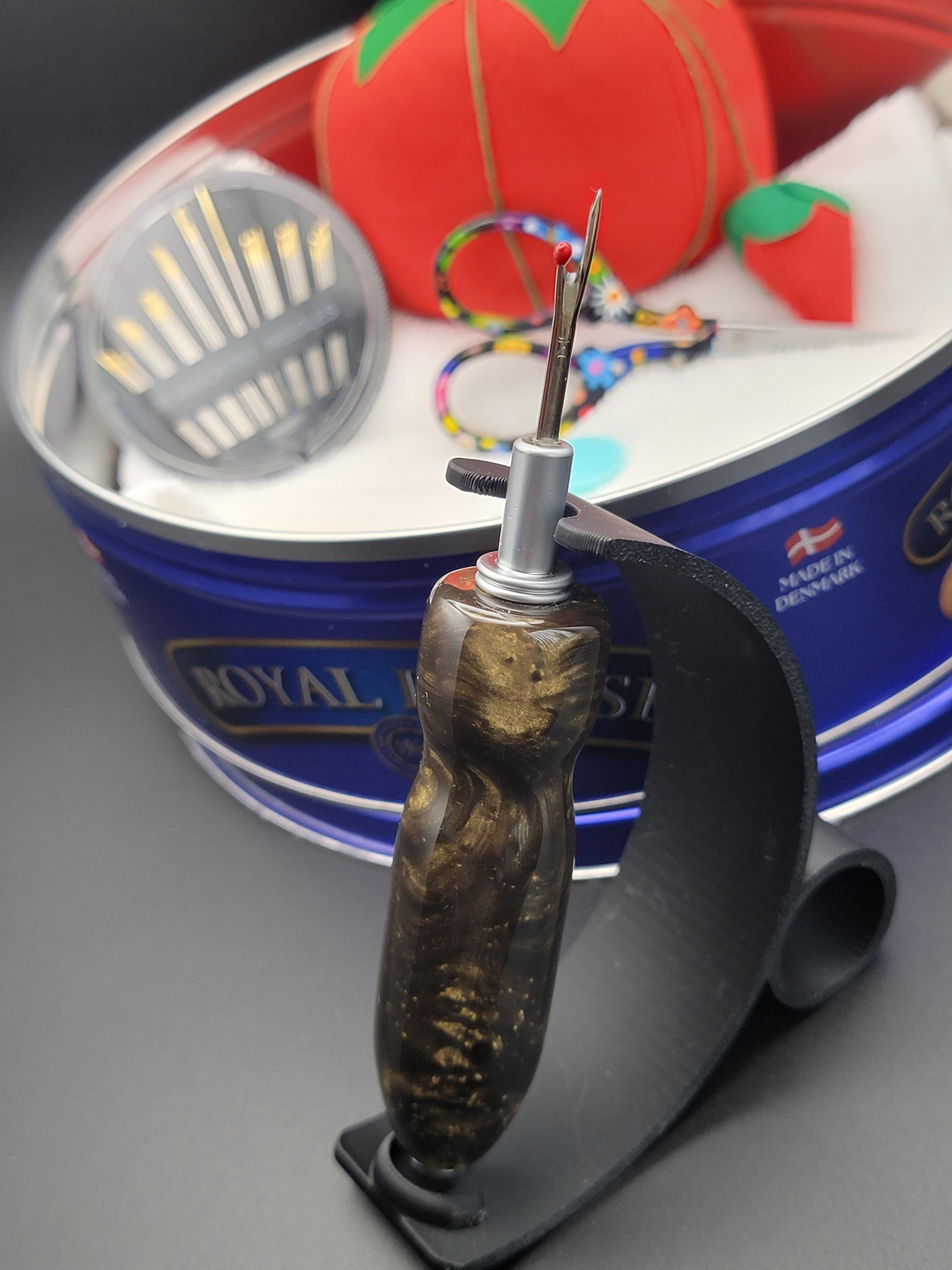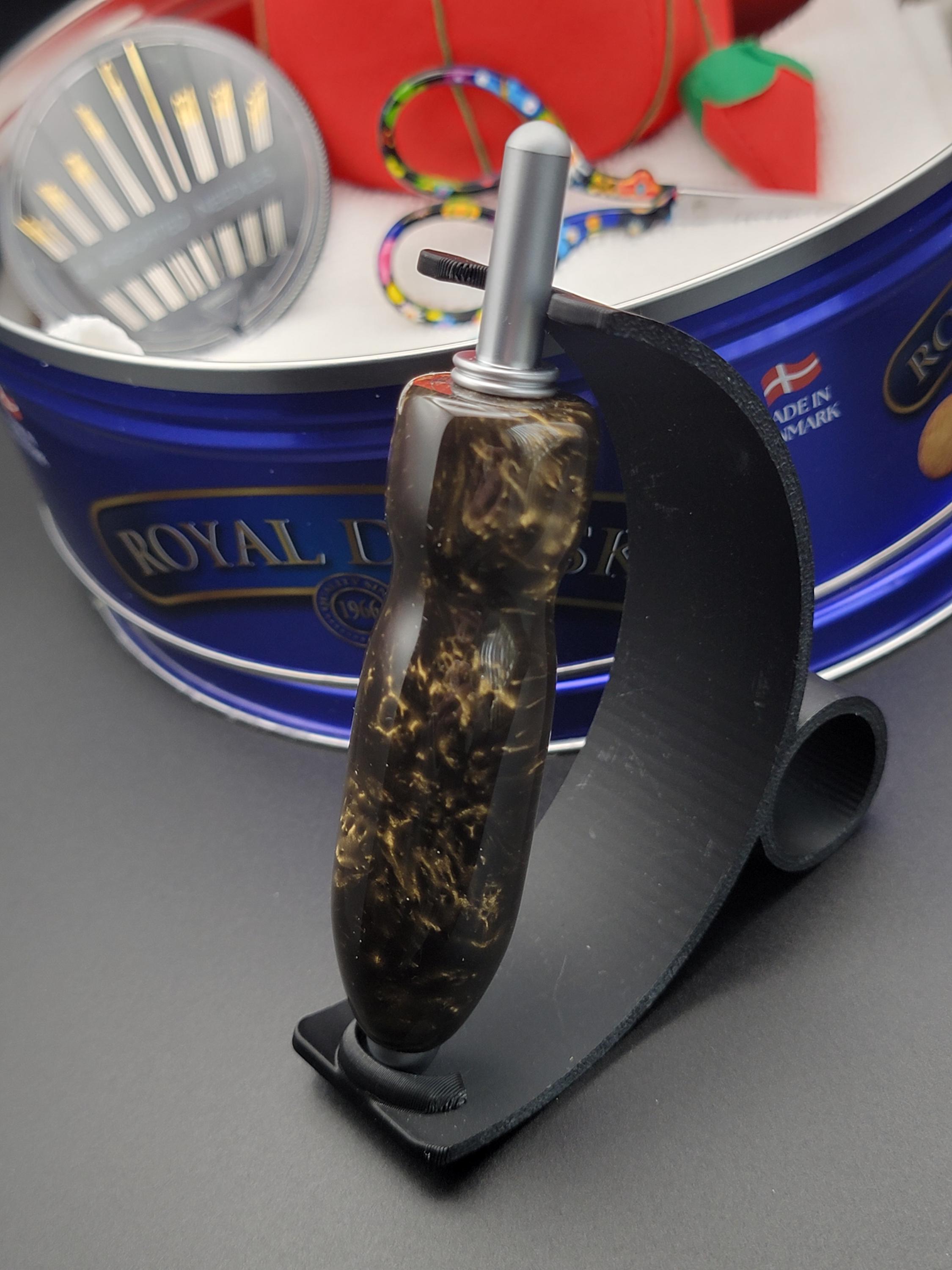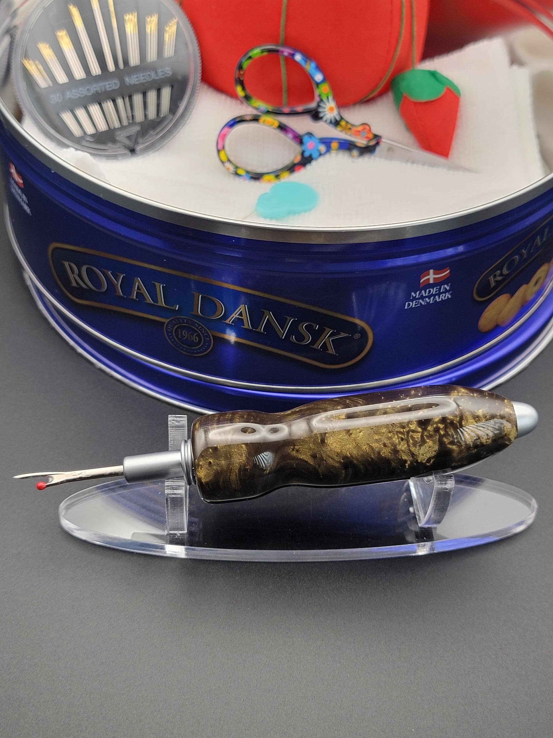 This ergonomic seam ripper was hand turned in our Metro Detroit workshop from a swirly gold and black acrylic.