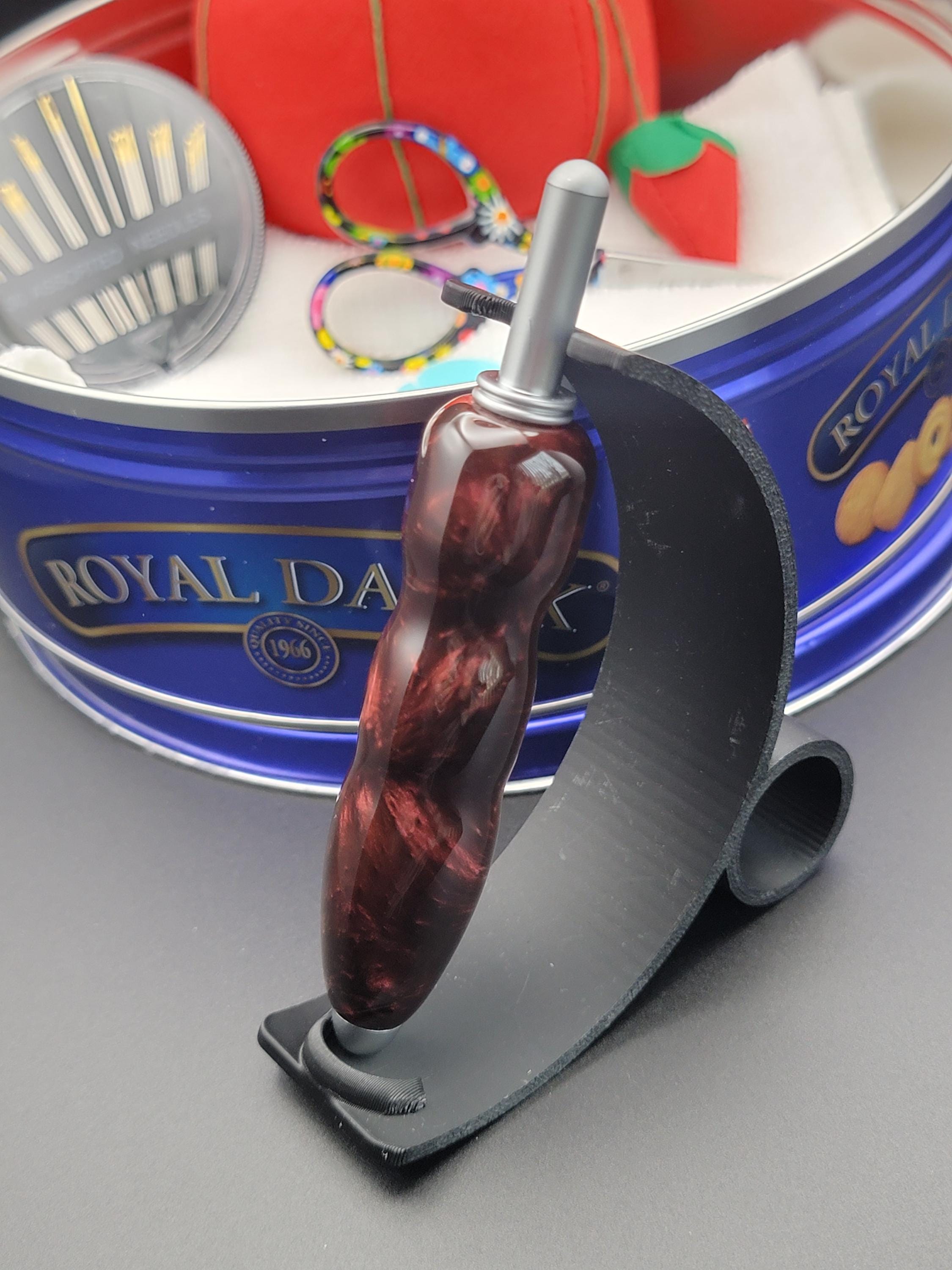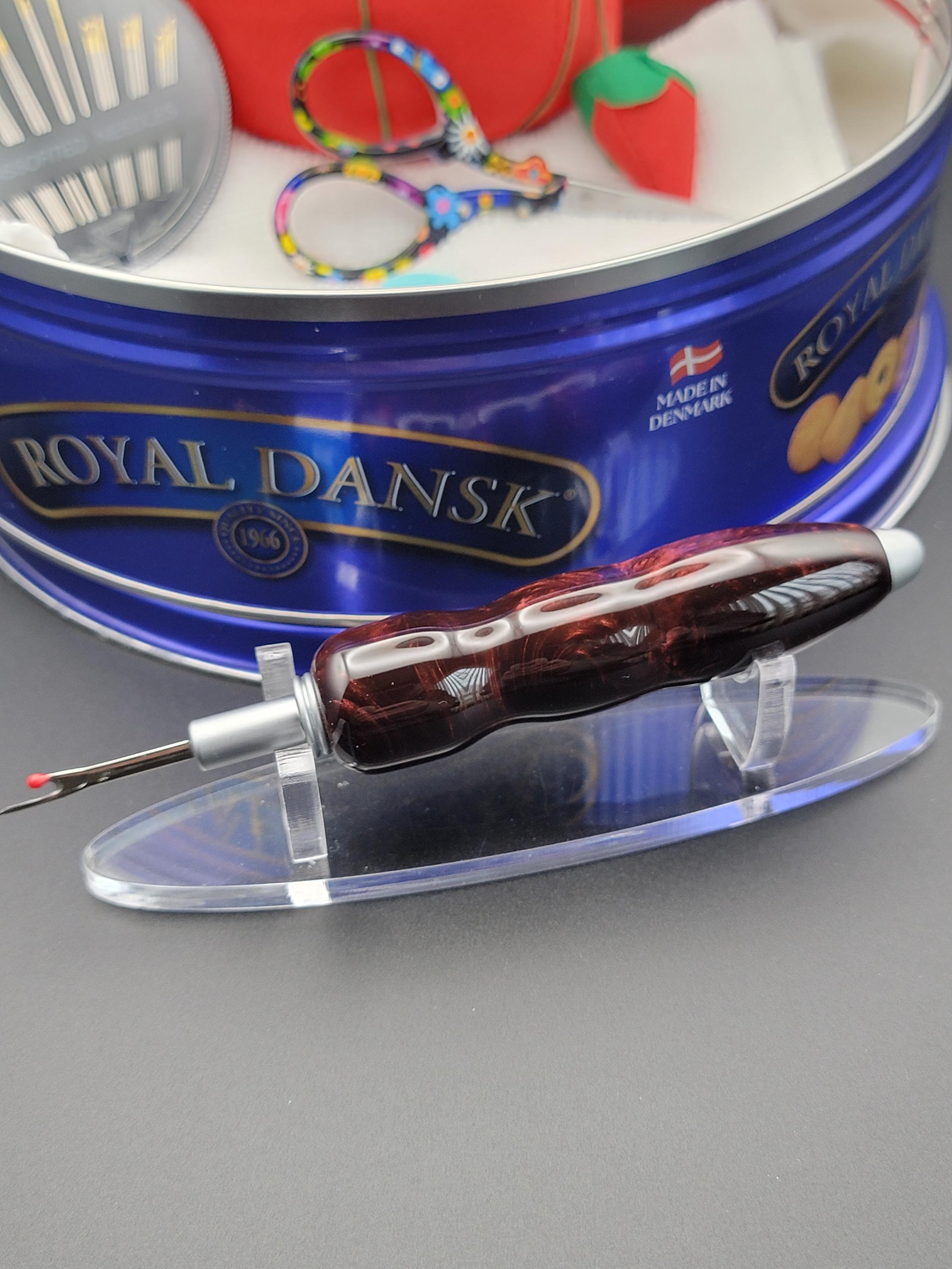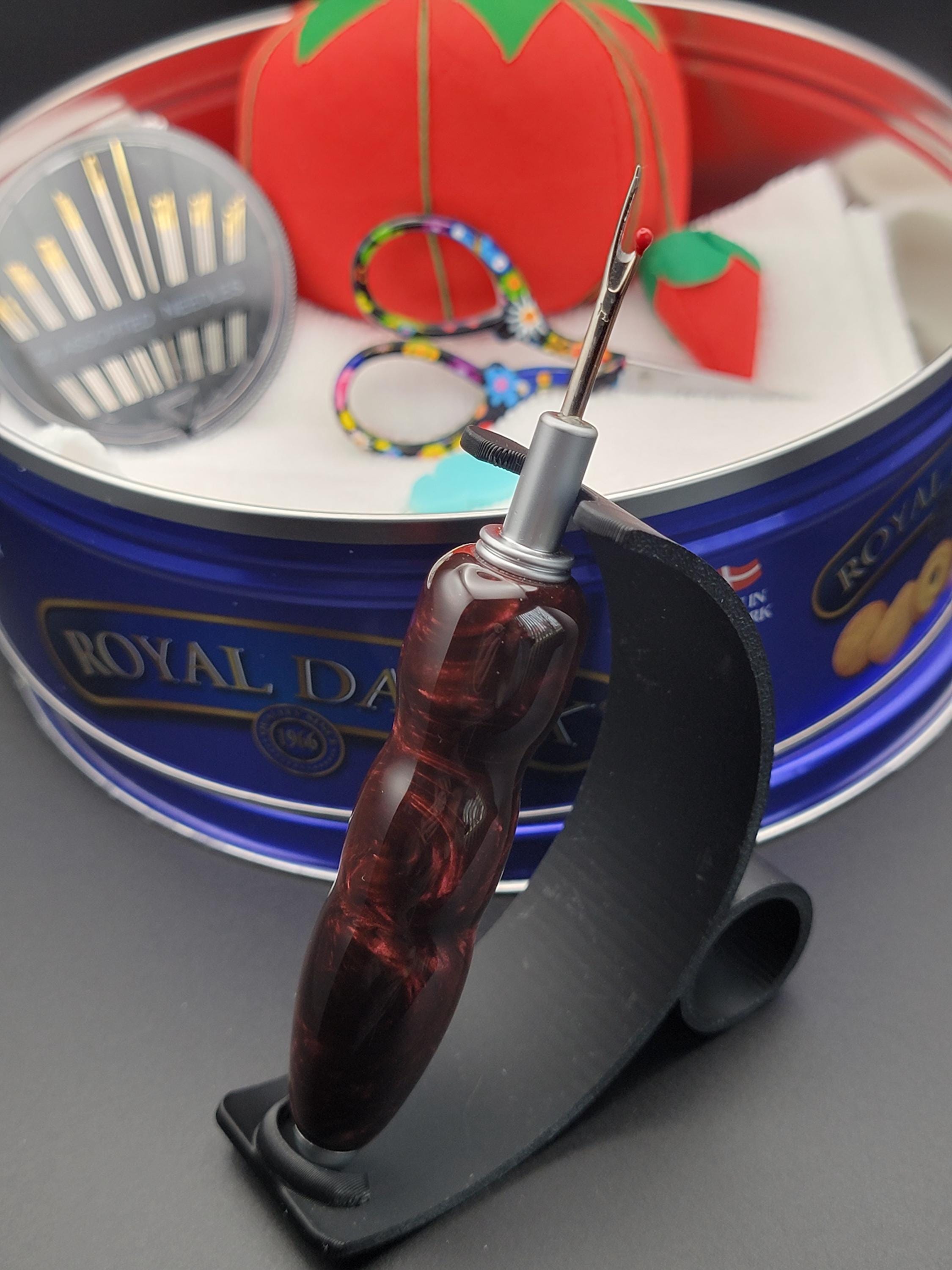 This ergonomic seam ripper was hand turned in our Metro Detroit workshop from a swirly cabernet acrylic.