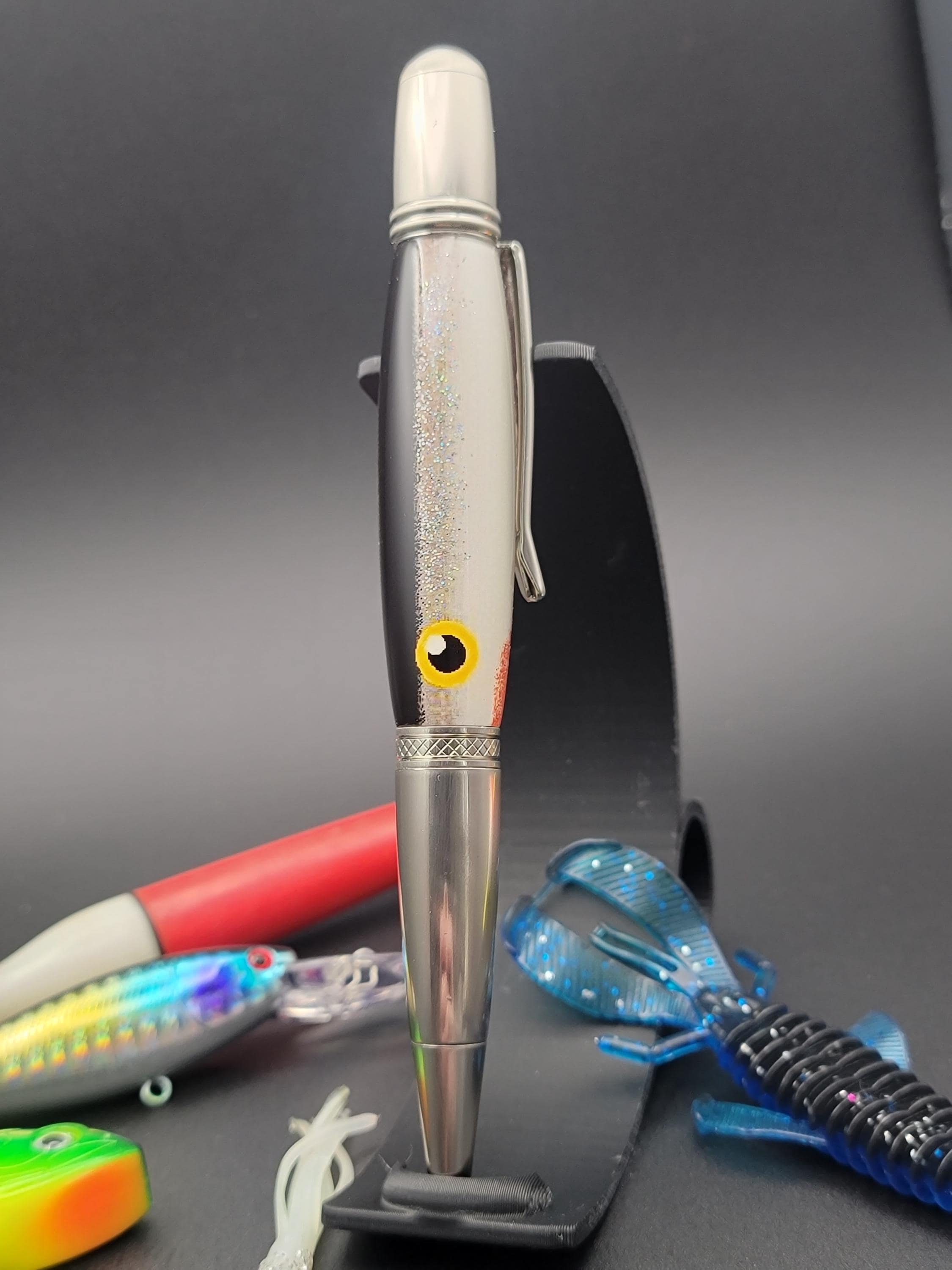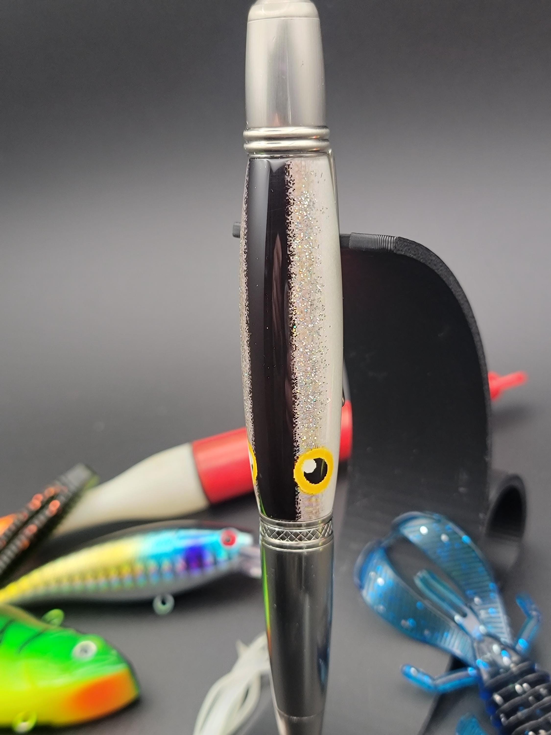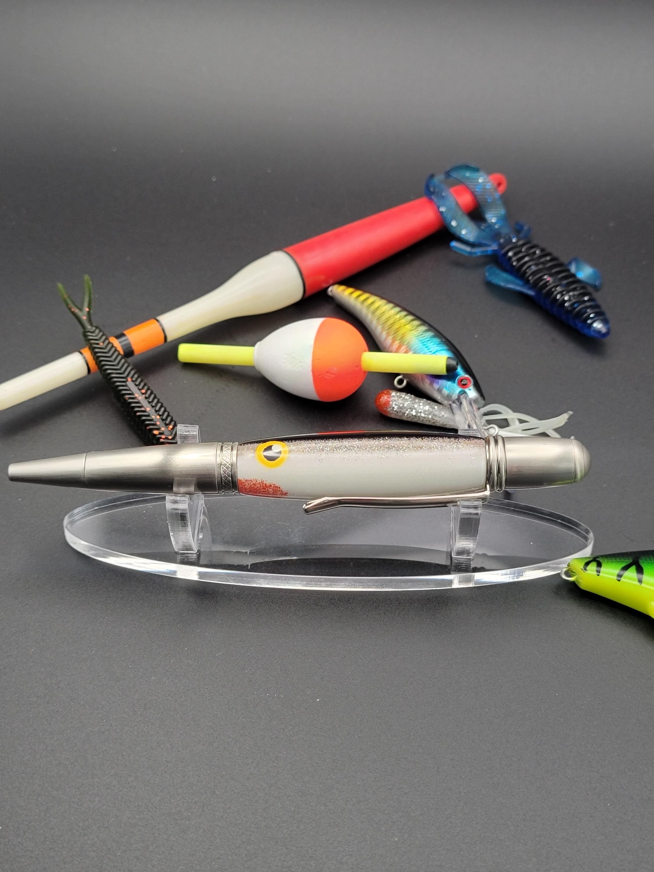 This is a ballpoint twist pen made with a Fishing lure theme in clear acrylic. The pen features stainless steel hardware and a smooth writing experience.