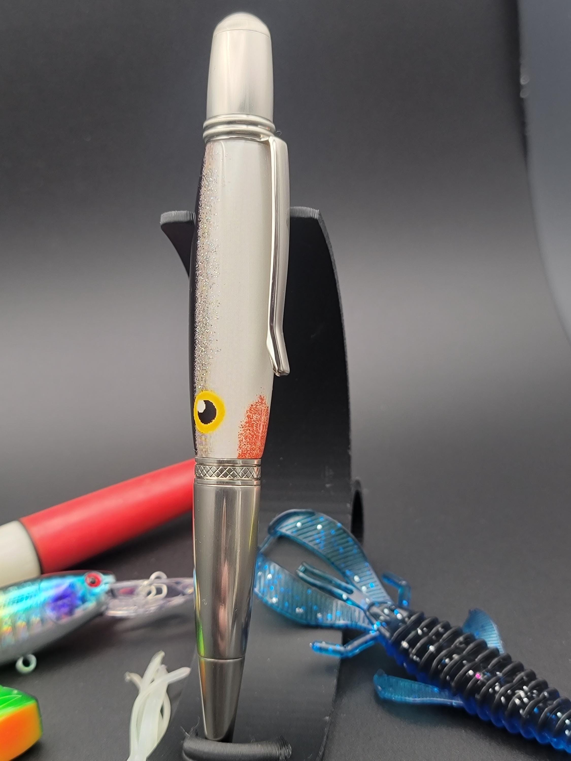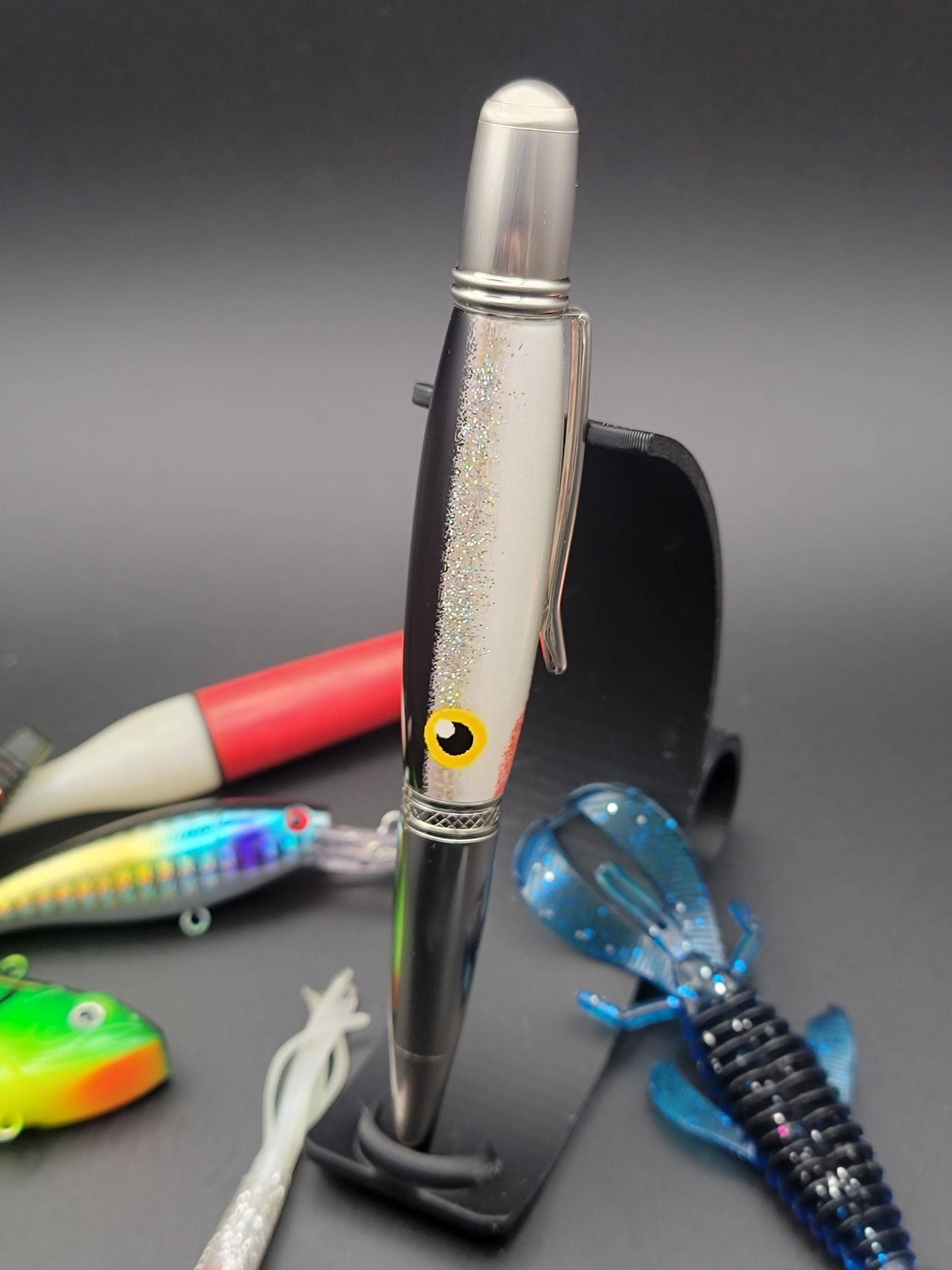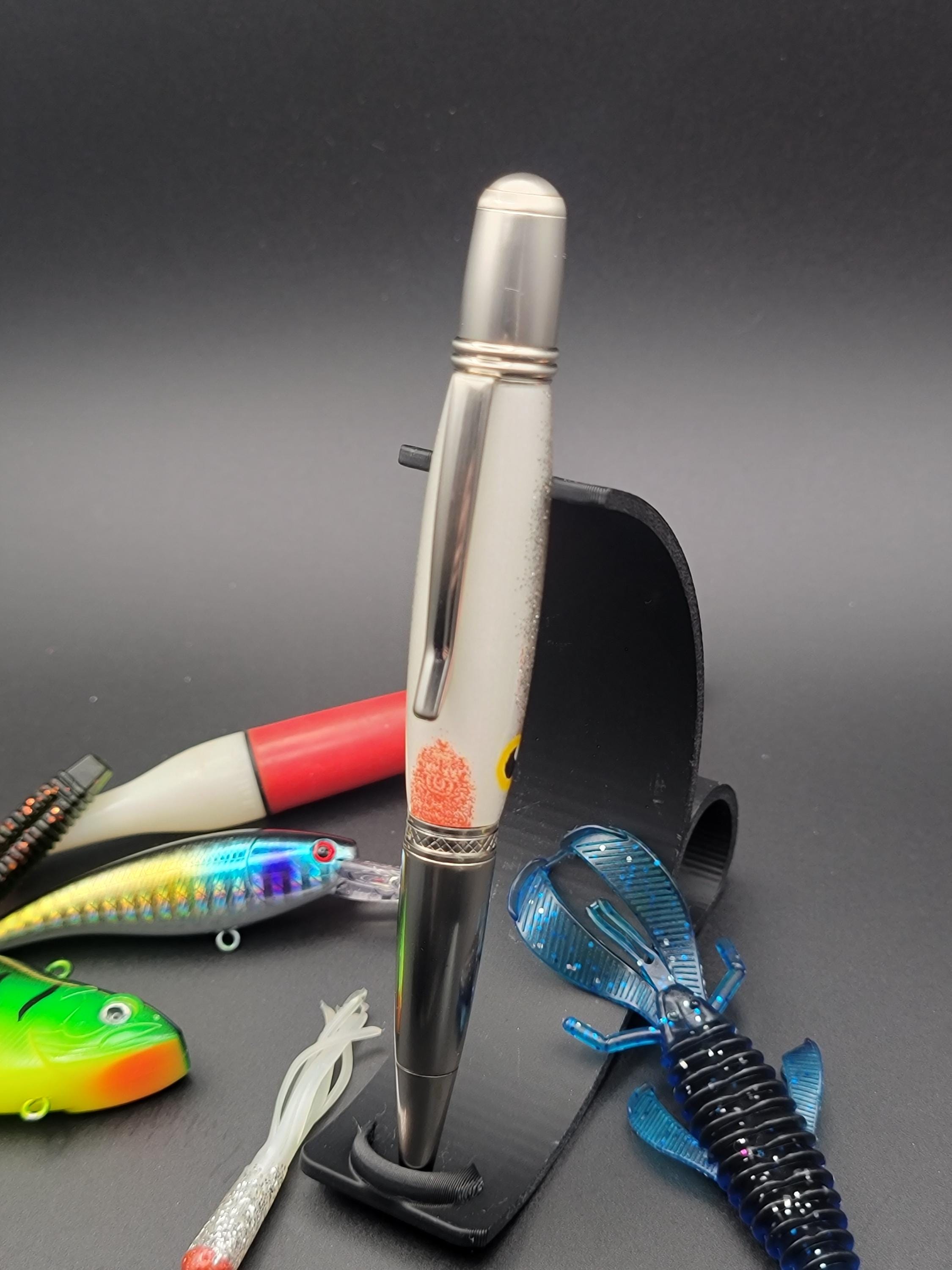 This is a ballpoint twist pen made with a Fishing lure theme in clear acrylic. The pen features stainless steel hardware and a smooth writing experience.