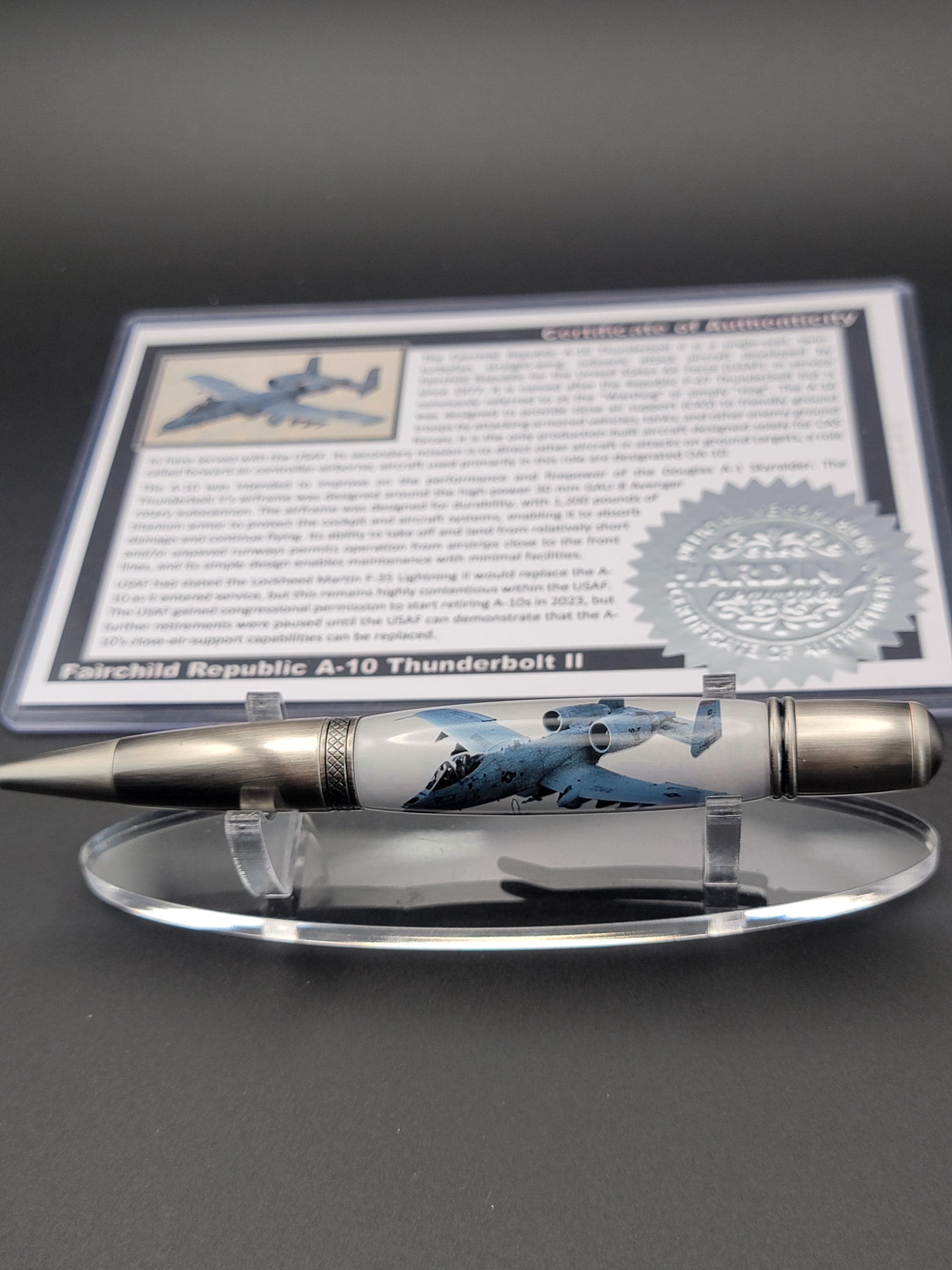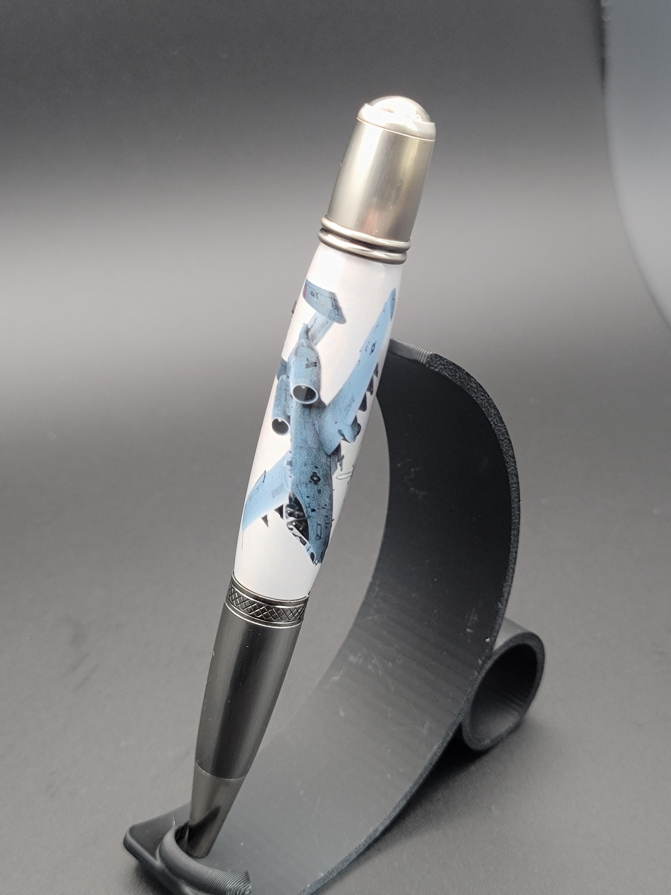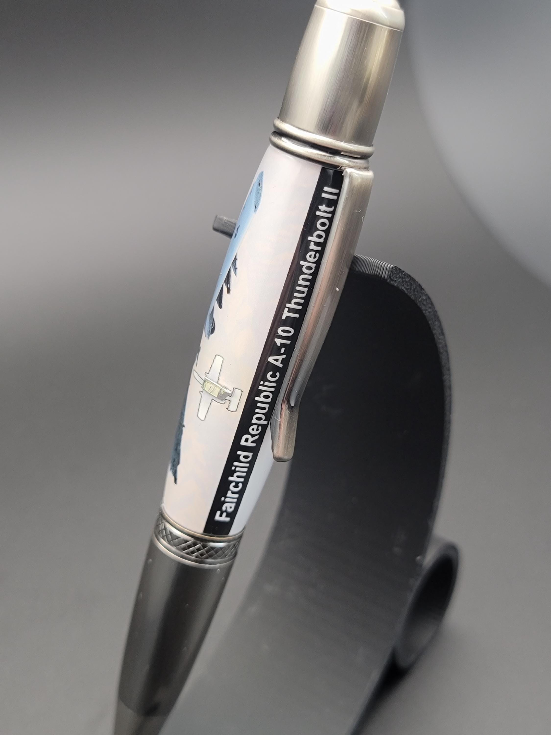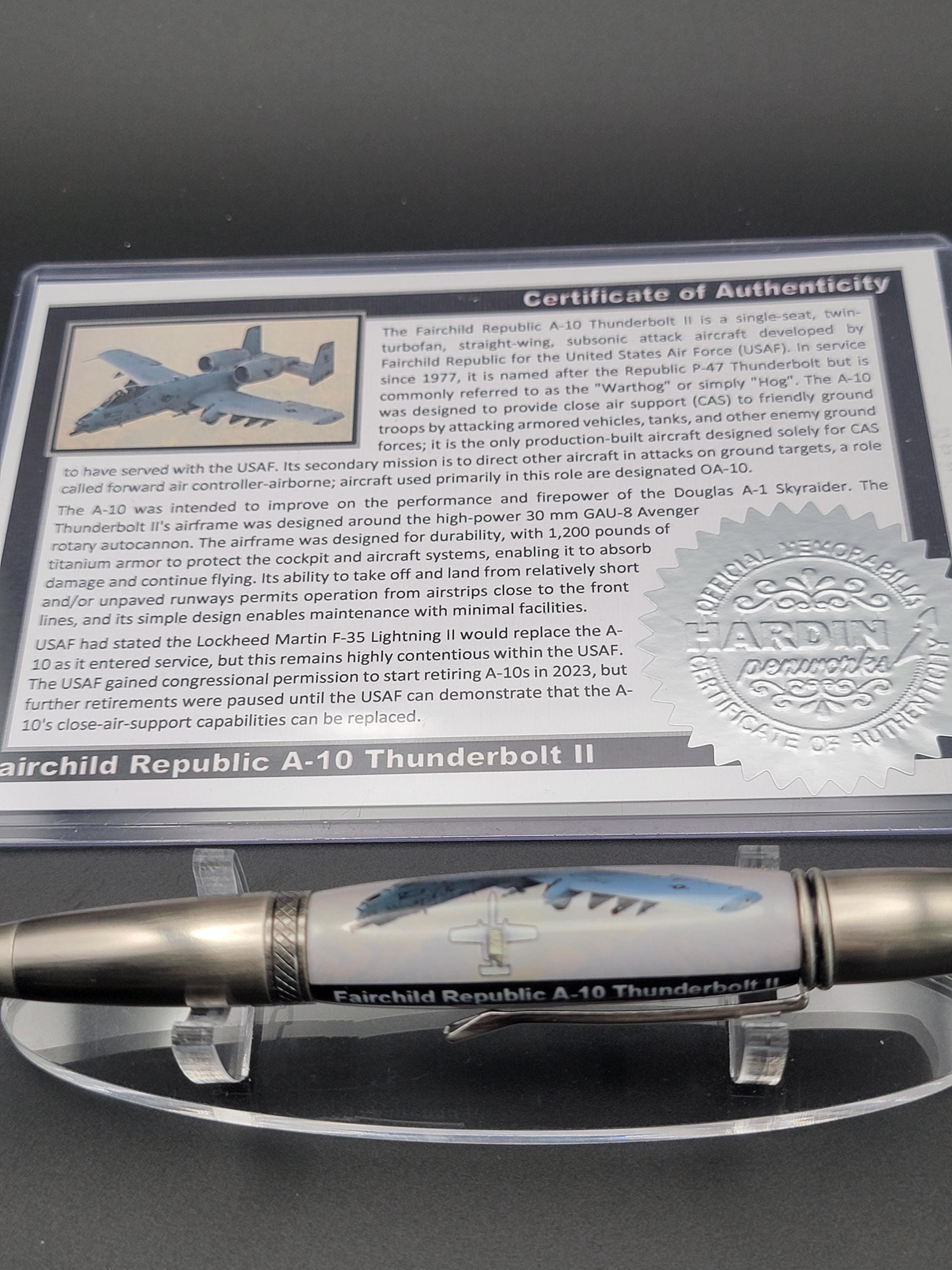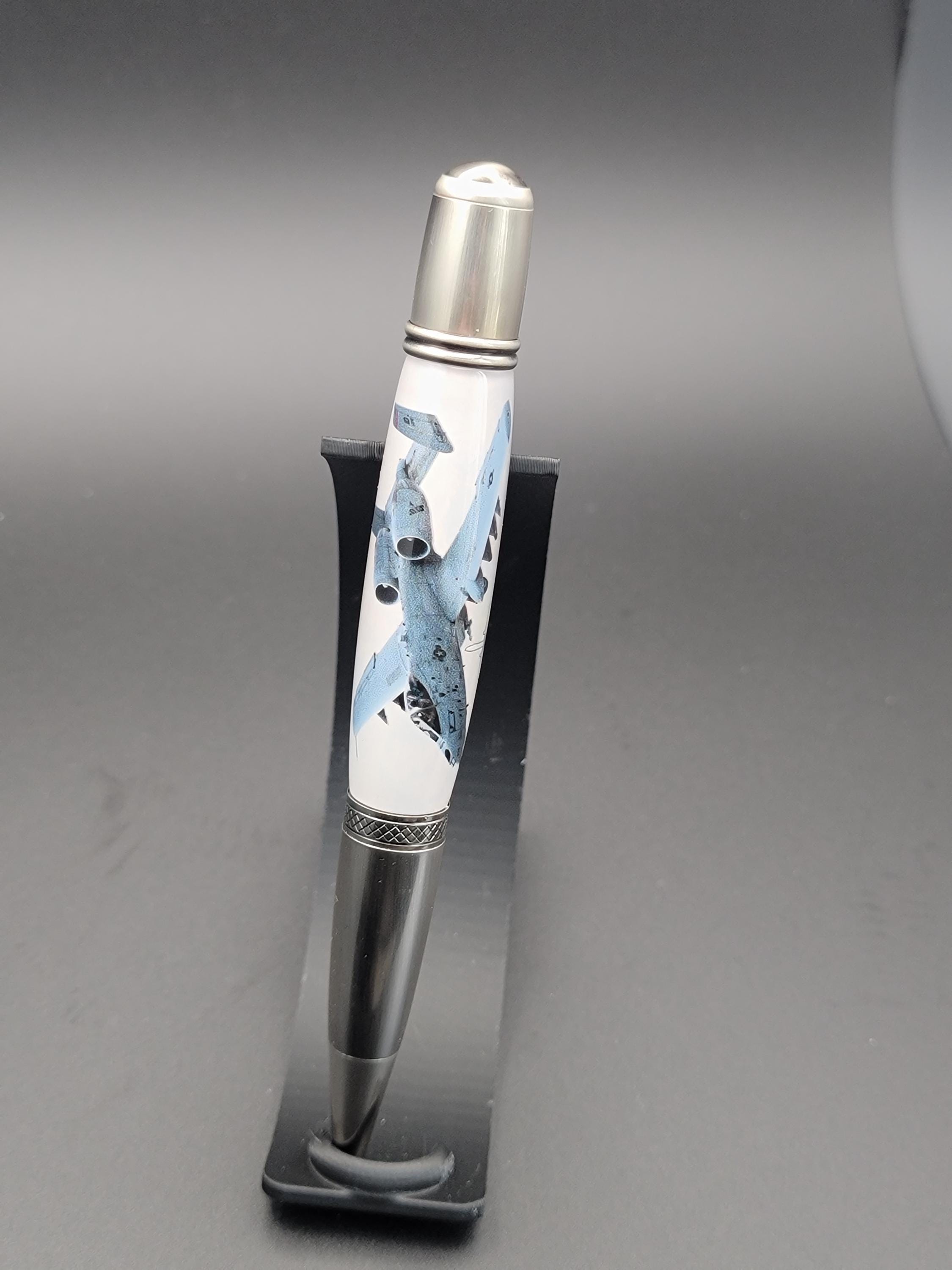 This hand turned pen is made from acrylic that contains a small piece of aircraft material from an A-10 Thunderbolt II. It will come with a certificate of authenticity that details the story of the material.