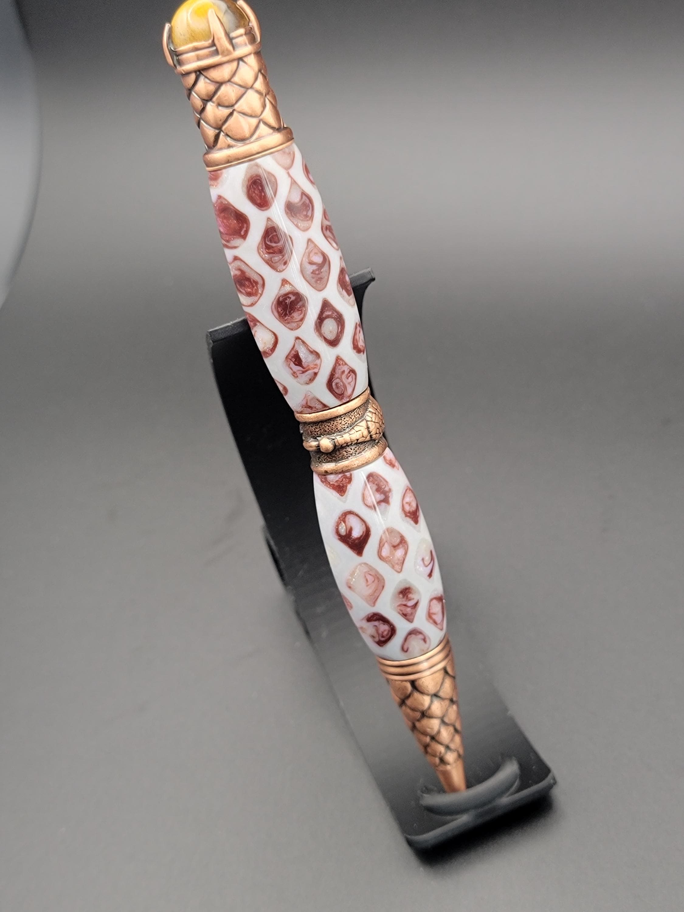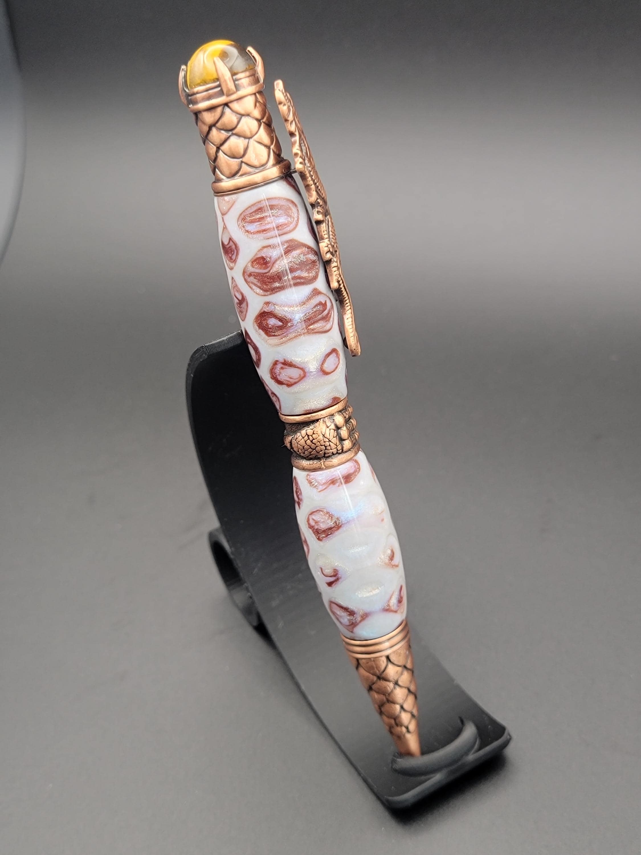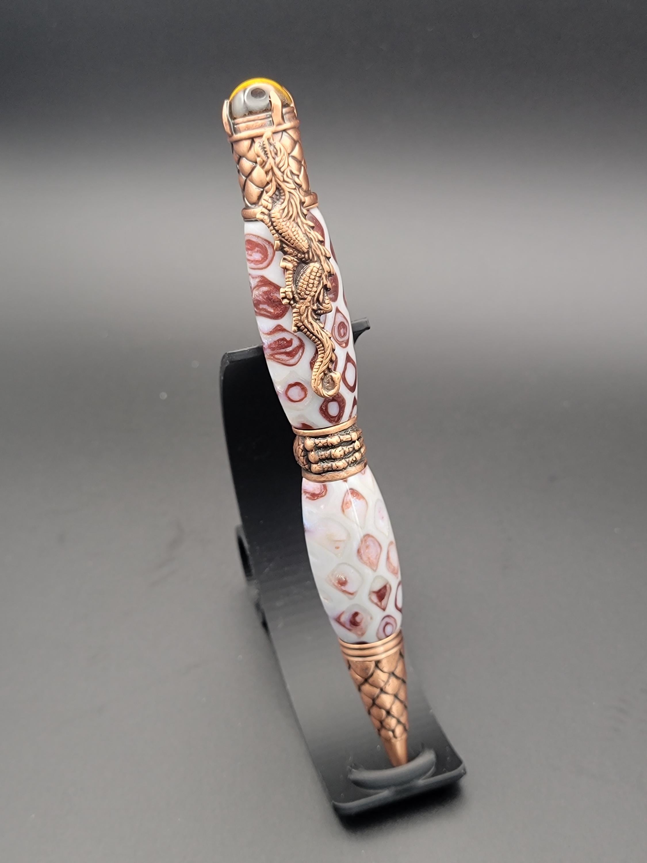 This dragon twist pen was handturned in our Metro Detroit workshop using a copper and icy winter white dragon scale acrylic. The antique copper hardware really makes this pen a one of a kind conversation piece.