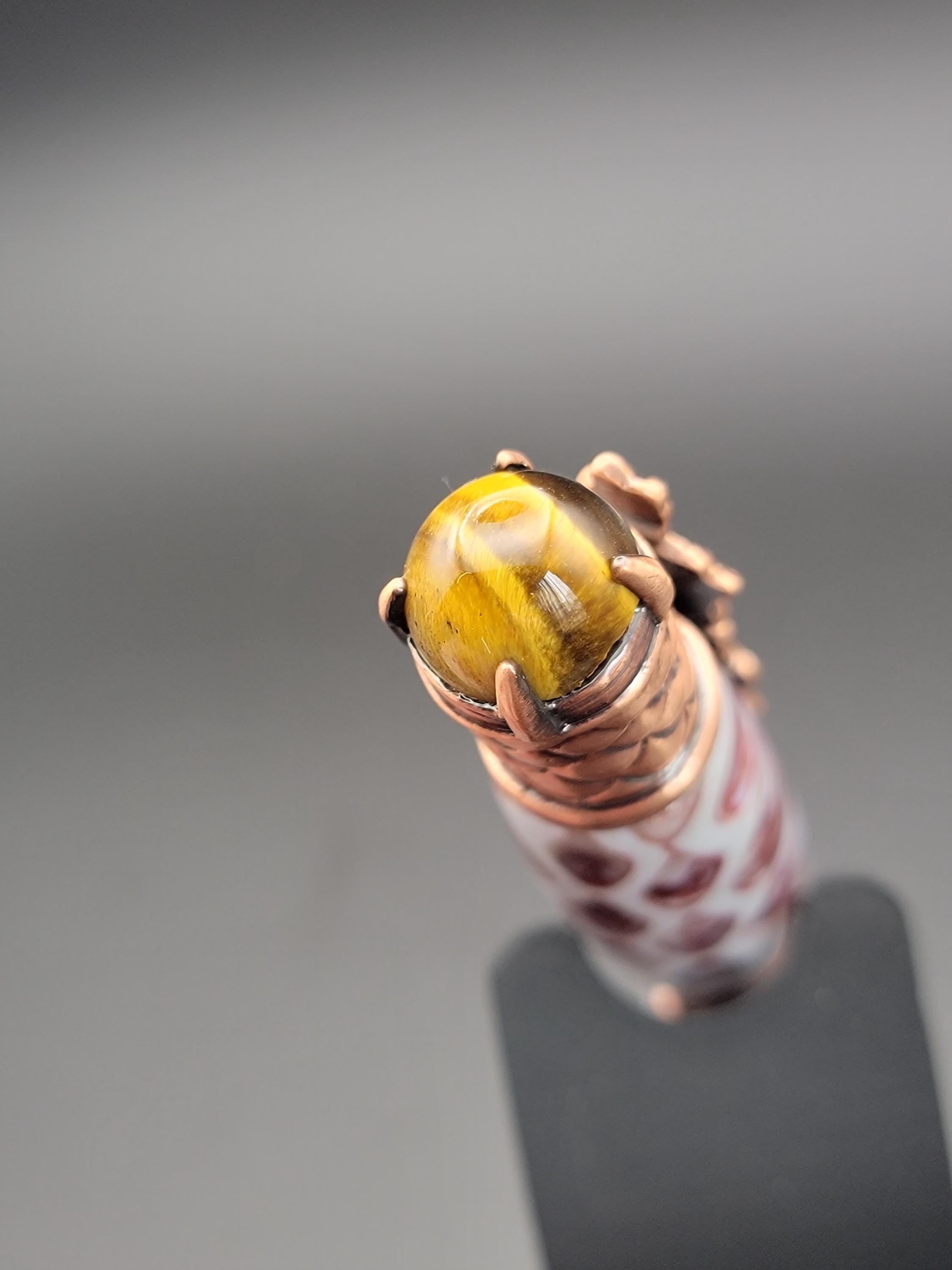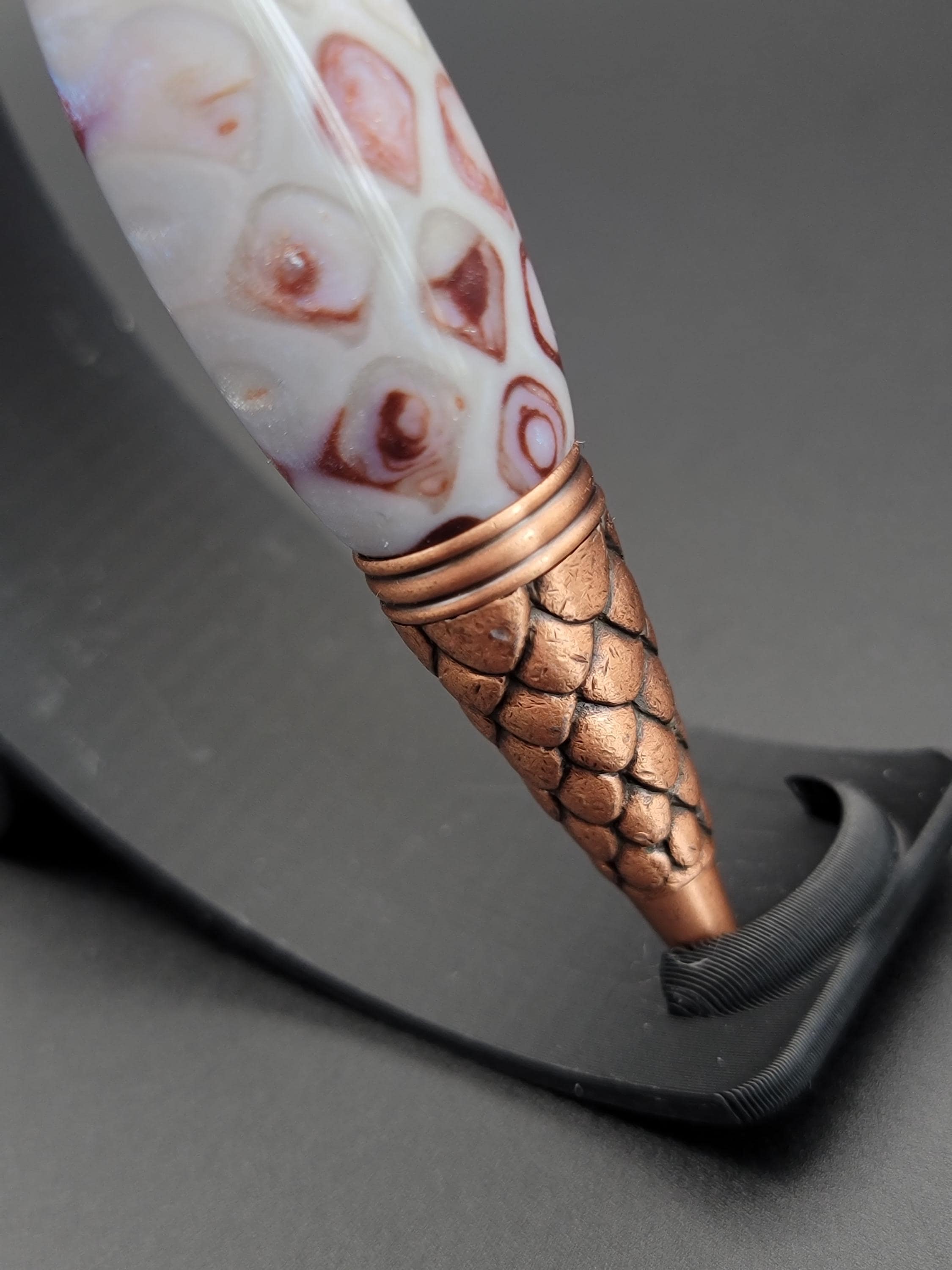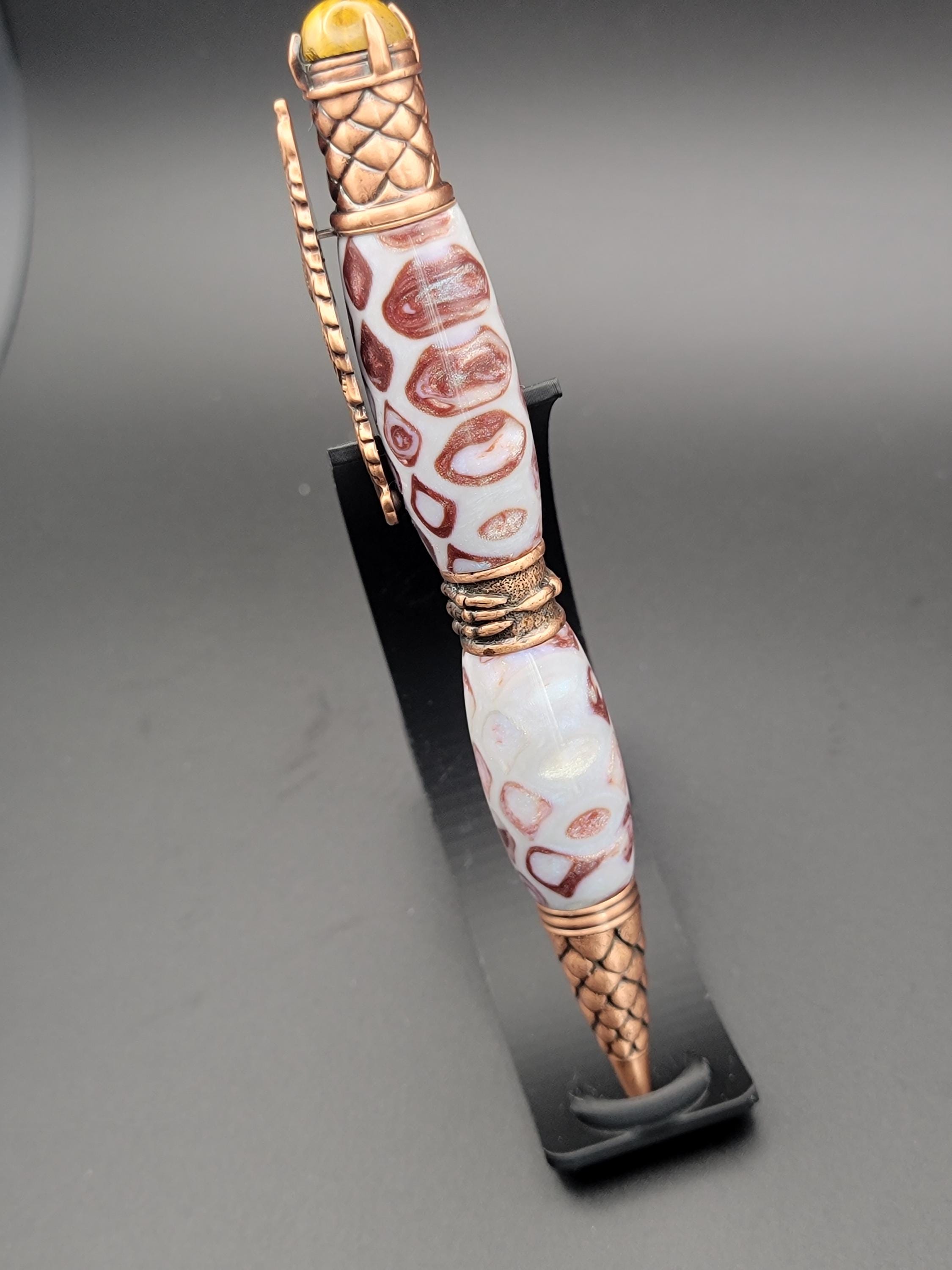 This dragon twist pen was handturned in our Metro Detroit workshop using a copper and icy winter white dragon scale acrylic. The antique copper hardware really makes this pen a one of a kind conversation piece.